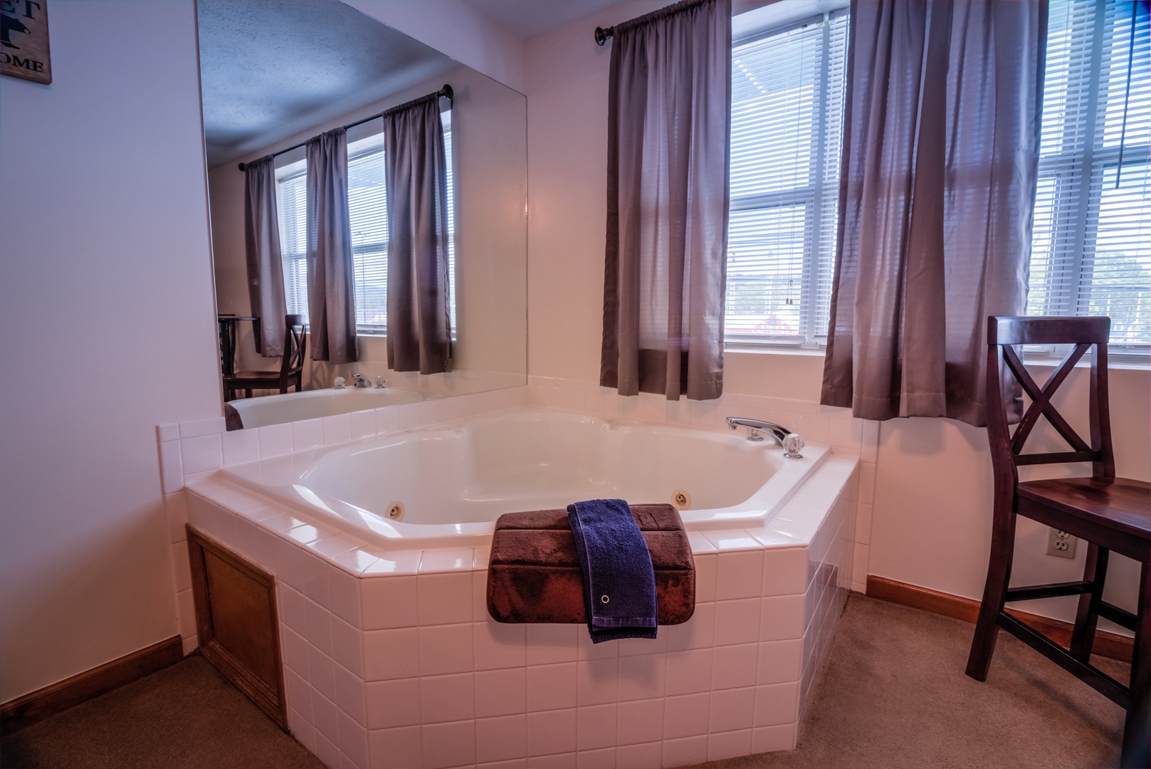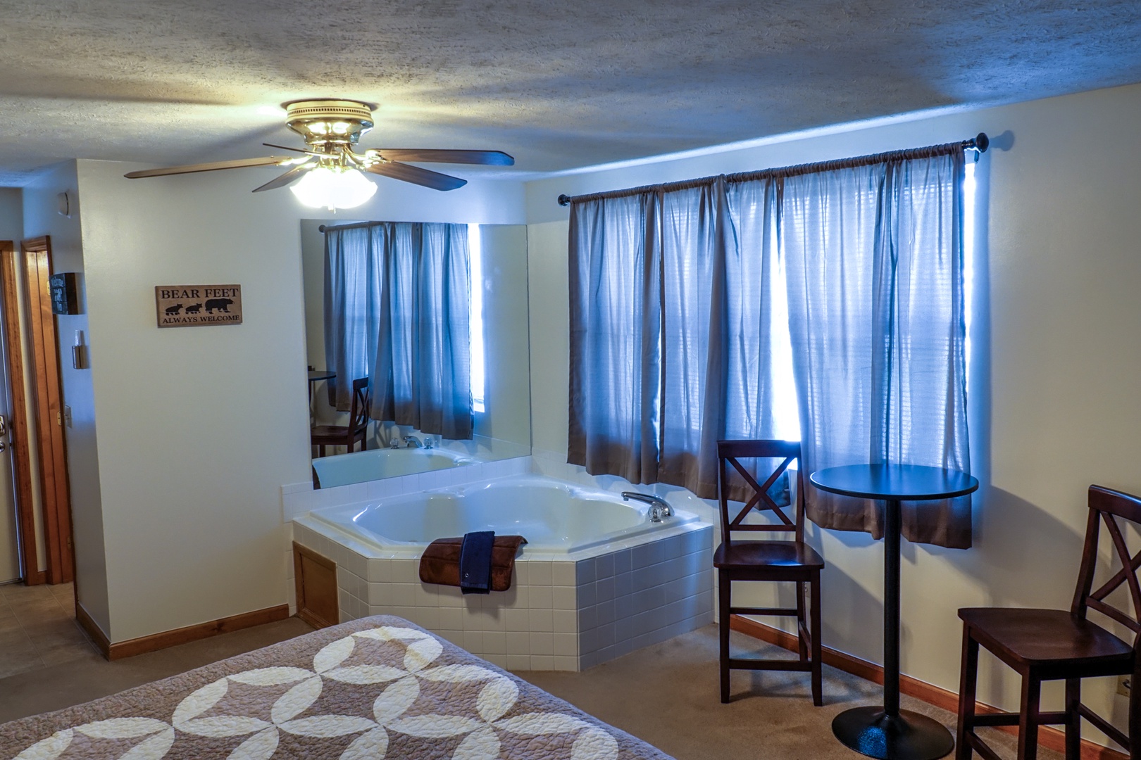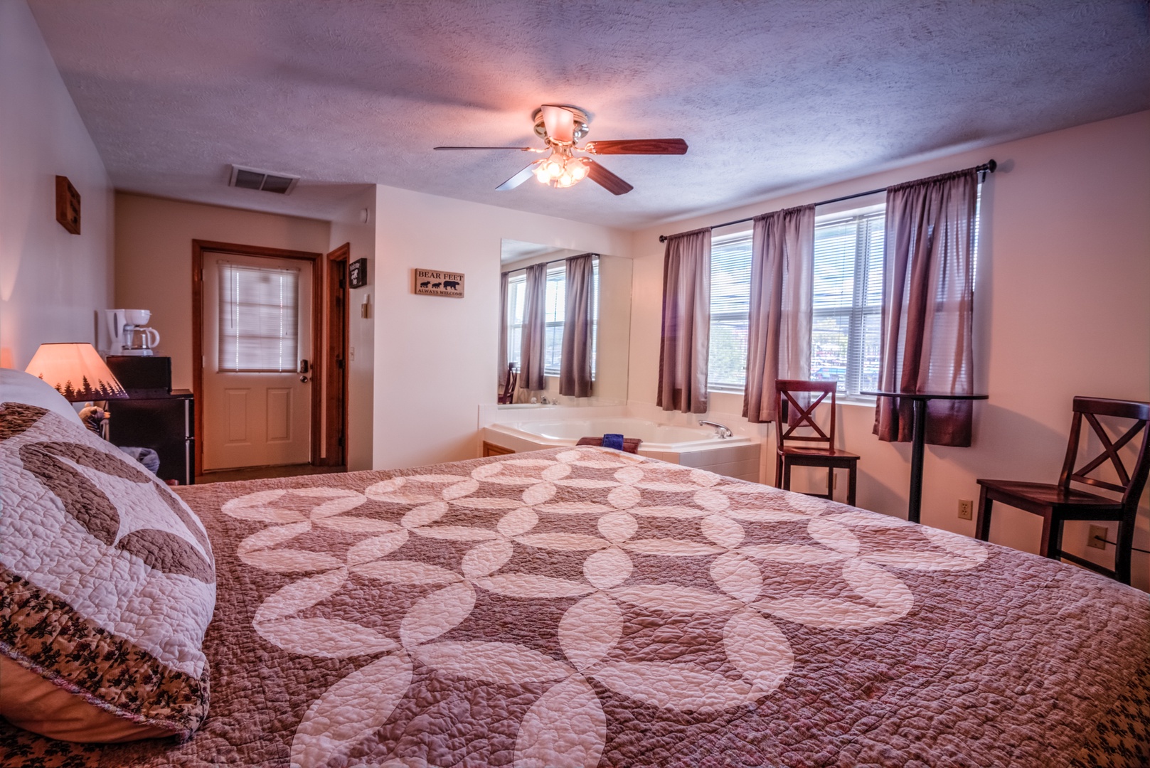 This 239 square foot 2ND FLOOR room features a large window overlooking the Parkway in Pigeon Forge, TN. This room has a king size bed and an in room jetted tub, with separate bathroom (vanity, commode, bath/shower combo). In room amenities include a coffee maker with coffee and condiments, microwave, mini fridge, and flat screen cable television.