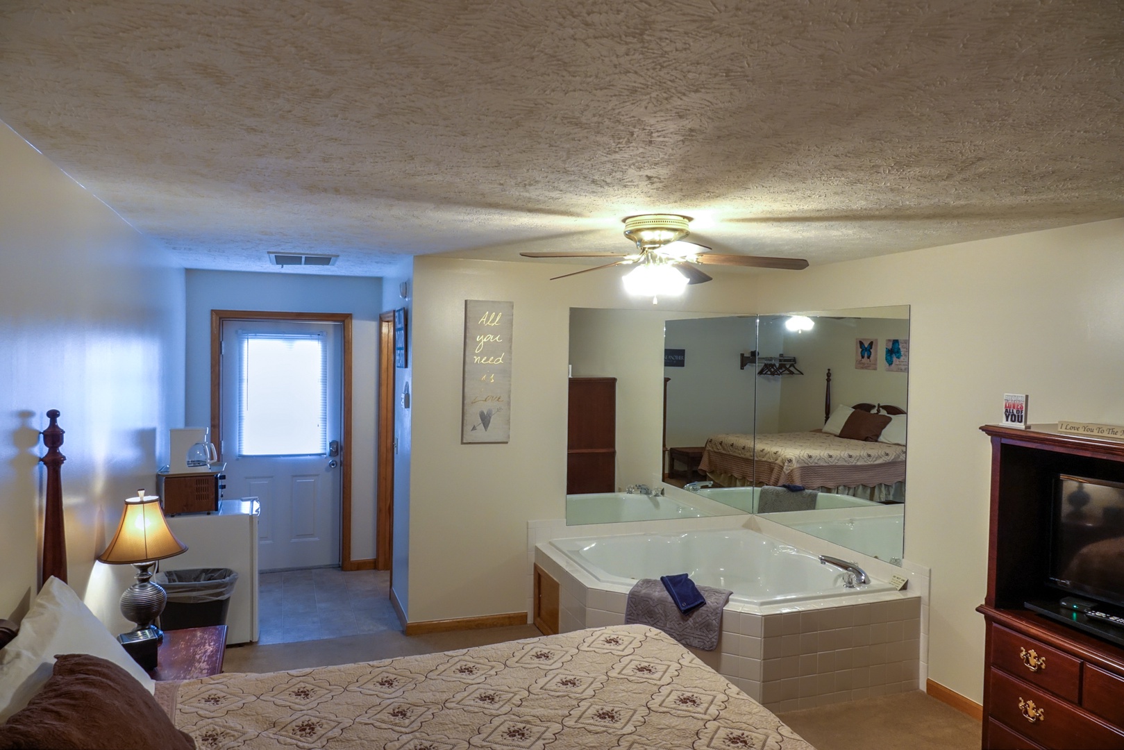 It was perfect. Just what my husband and I needed for our anniversary weekend. We enjoyed the jacuzzi tub. The king size bed was perfect size but was a little too soft for our liking. It was clean and is well maintained. We will definitely stay her again.