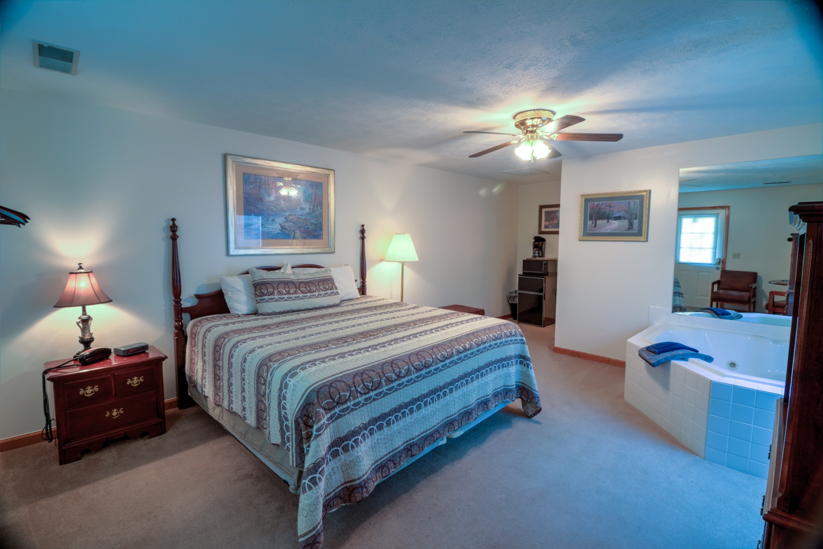 This 231 square foot 2ND FLOOR room features a king size bed and an in room jetted tub with separate bathroom (vanity, commode, bath/shower combo). In room amenities include coffee maker with coffee and condiments, microwave, mini fridge, and flat screen cable television.
