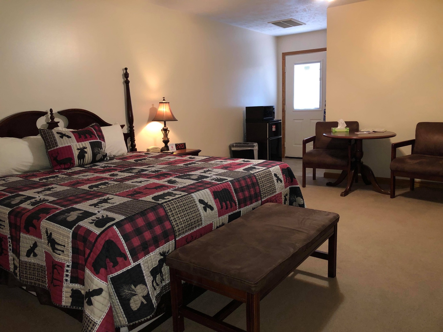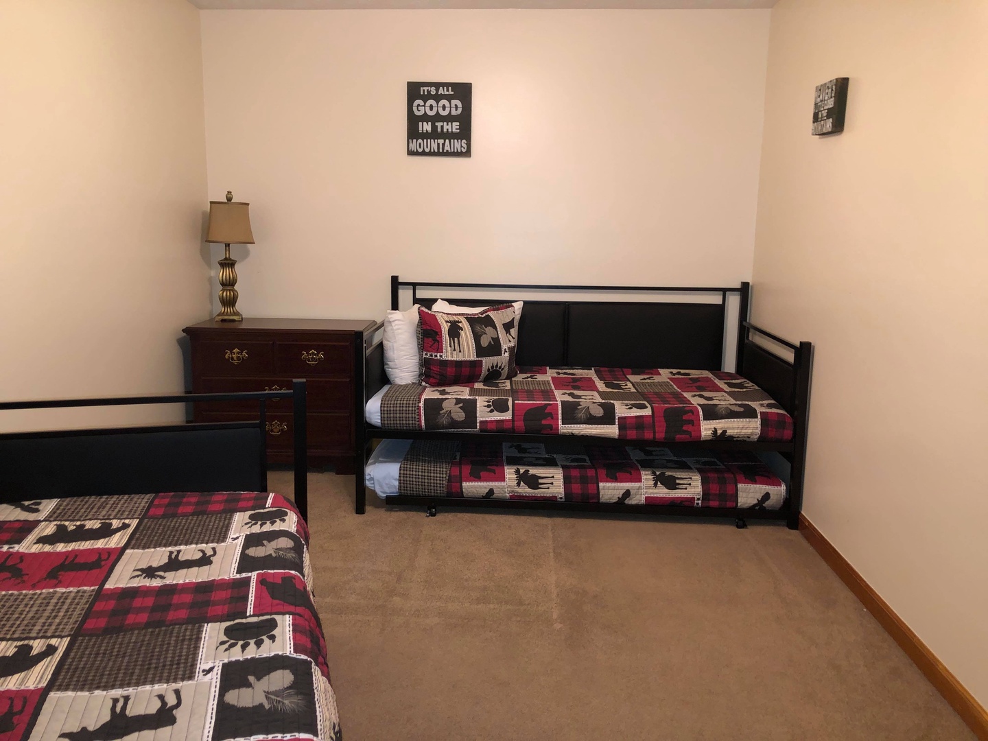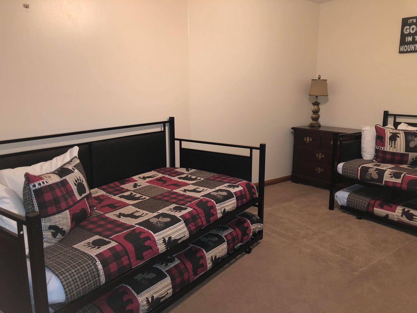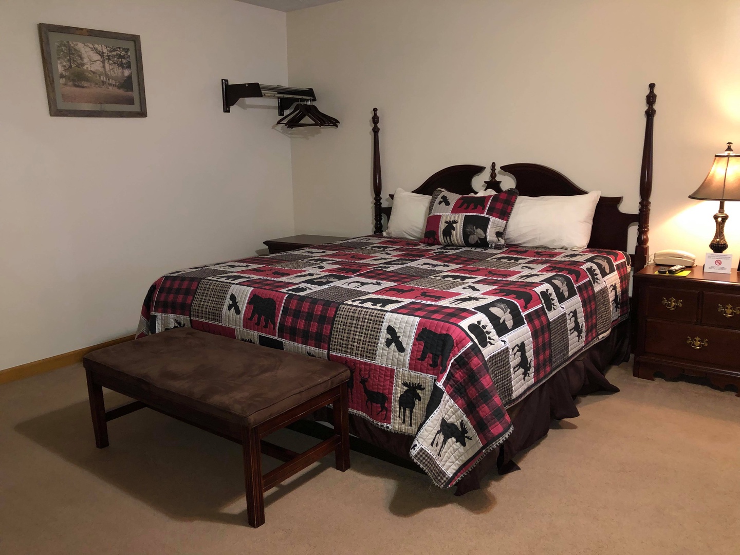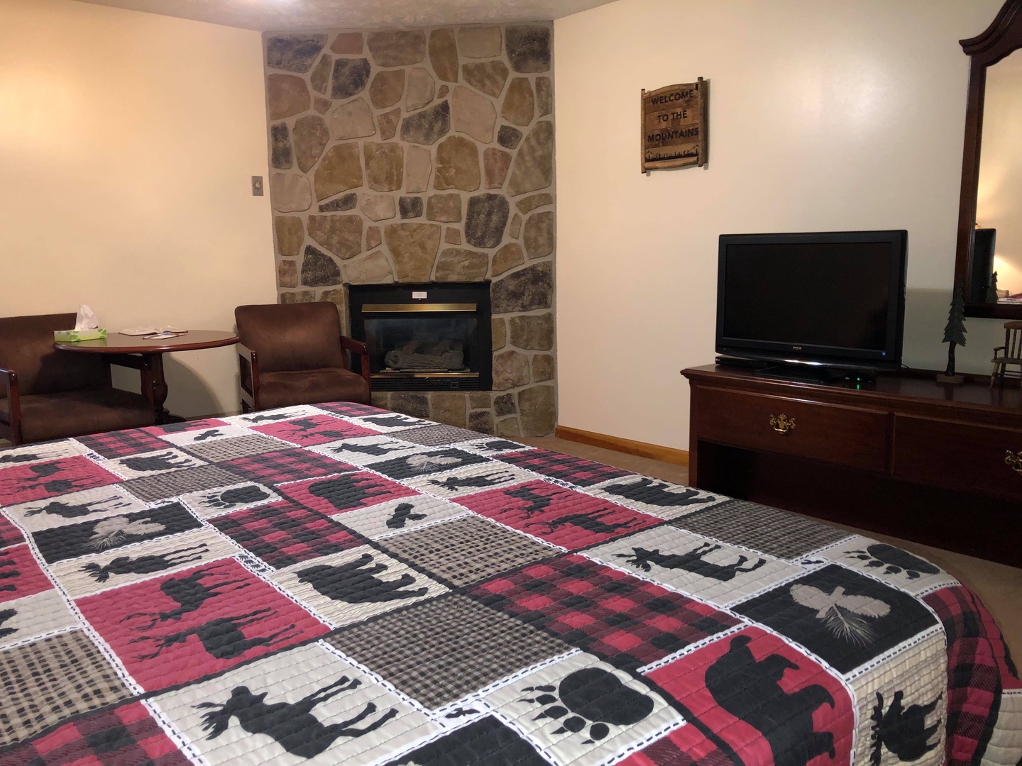 This is a 2ND FLOOR 2 room unit. The 231 square foot Main room features a king-size bed and a seasonal (October 1 through March 31) gas fireplace. There is a separate bathroom with vanity, commode, and bath/shower combo. The 146 square foot 2nd room features 2- twin size day beds and 2 twin sized trundles size bed as well. This second room also has a flat-screen, DVD only, television. In the room, amenities include coffee maker with coffee and condiments, microwave, and mini-fridge.