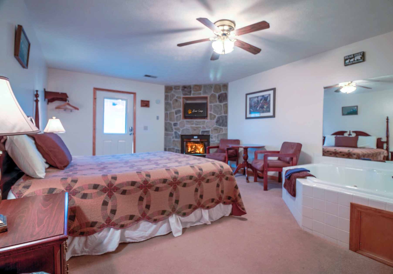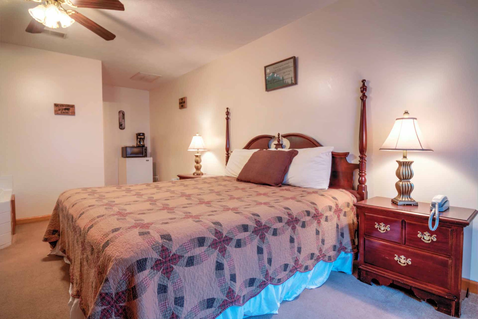 This 240 square foot 2ND FLOOR room features a king size bed, an in room jetted tub, a seasonal (October 1 through March 31) gas fireplace, and flat screen cable television. There is a separate bathroom with vanity, commode, and bath/shower combo. In room amenities include coffee maker with coffee and condiments, microwave, and mini fridge.