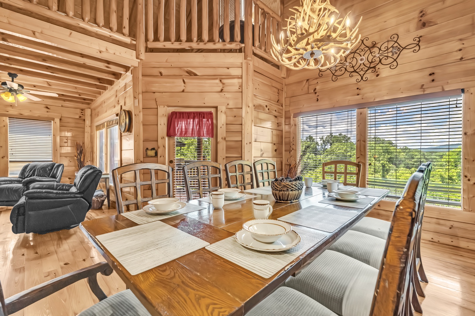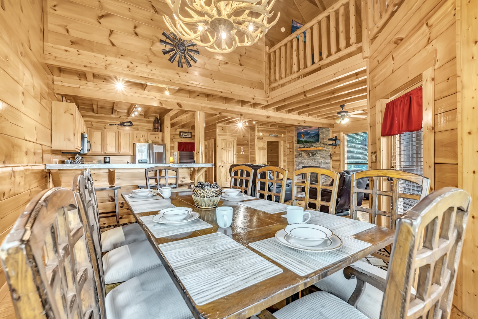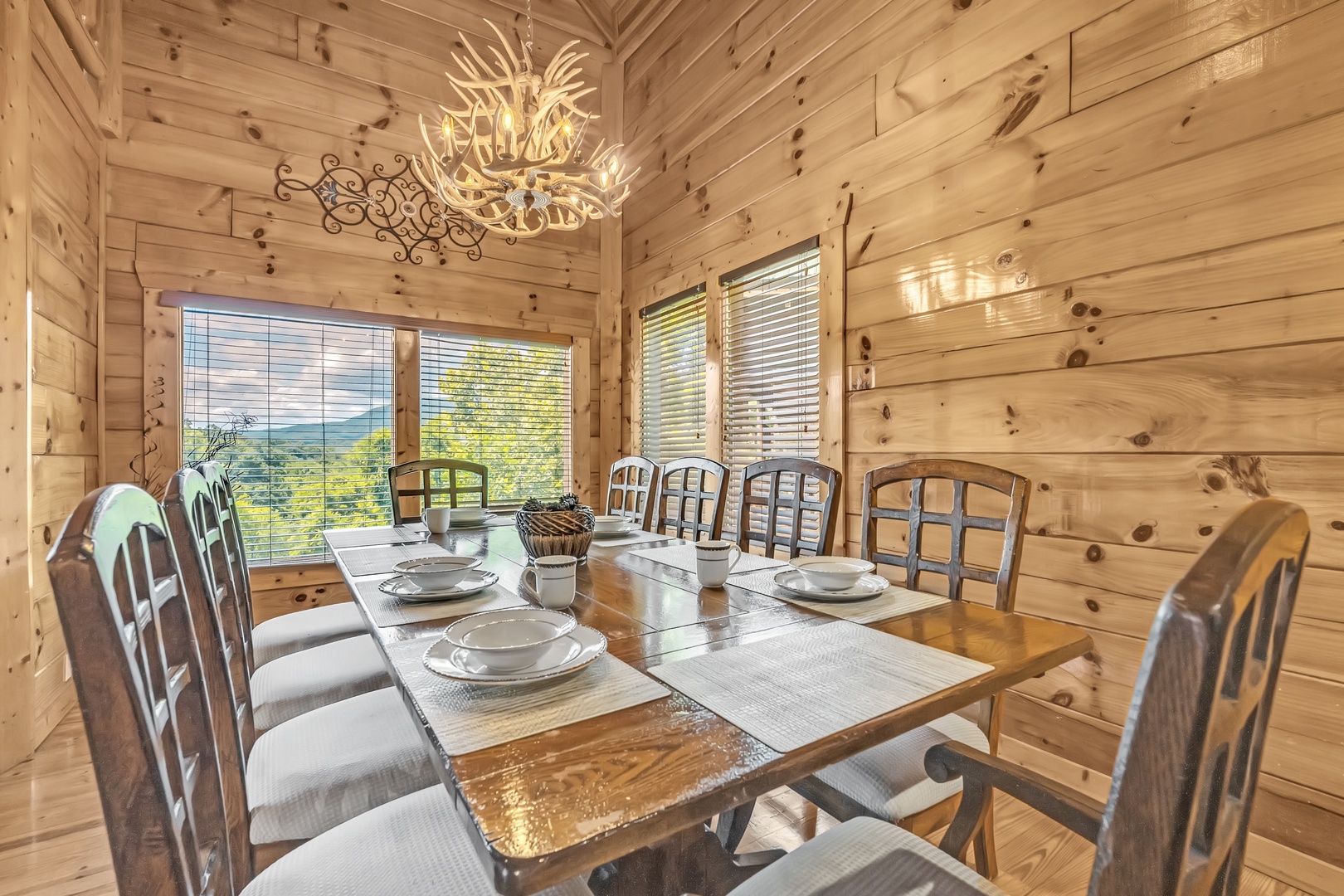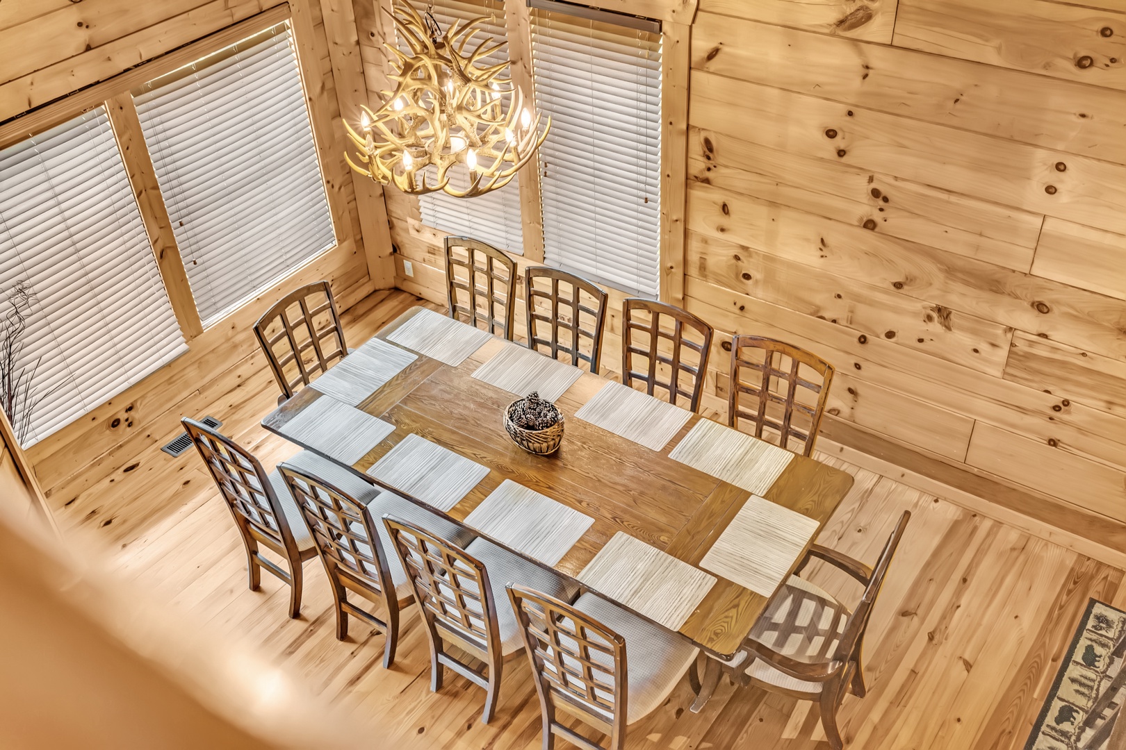 Entering the cabin on the main floor you'll be greeted with an open concept living, kitchen and dining room with views of ridges and mountains. The spacious living room is perfect to kick back and relax in the recliners and watch your favorite show or enjoy the electric fireplace for those special moments. The fully equipped kitchen is ready for all your meal prep whether it be breakfast or Thanksgiving dinner. The dining room has a massive dining table to seat 10 with access to the back deck where the gas grill is for your convenience. There is also a half bath next to the kitchen.