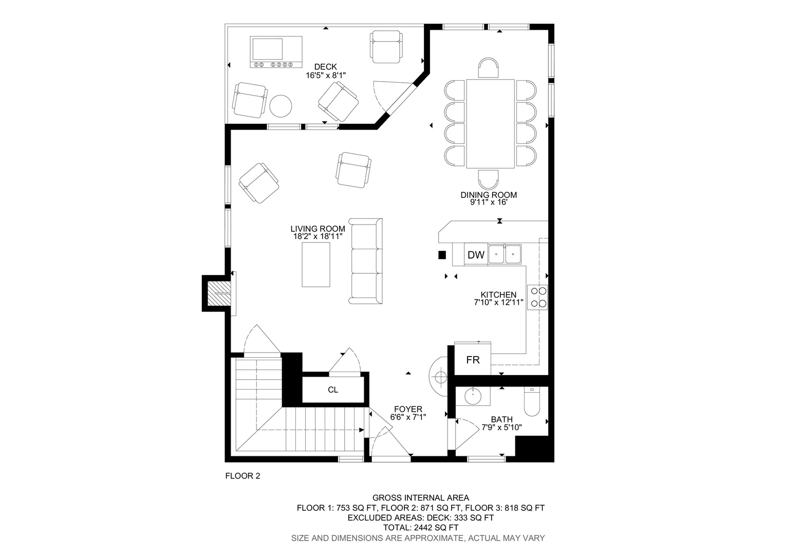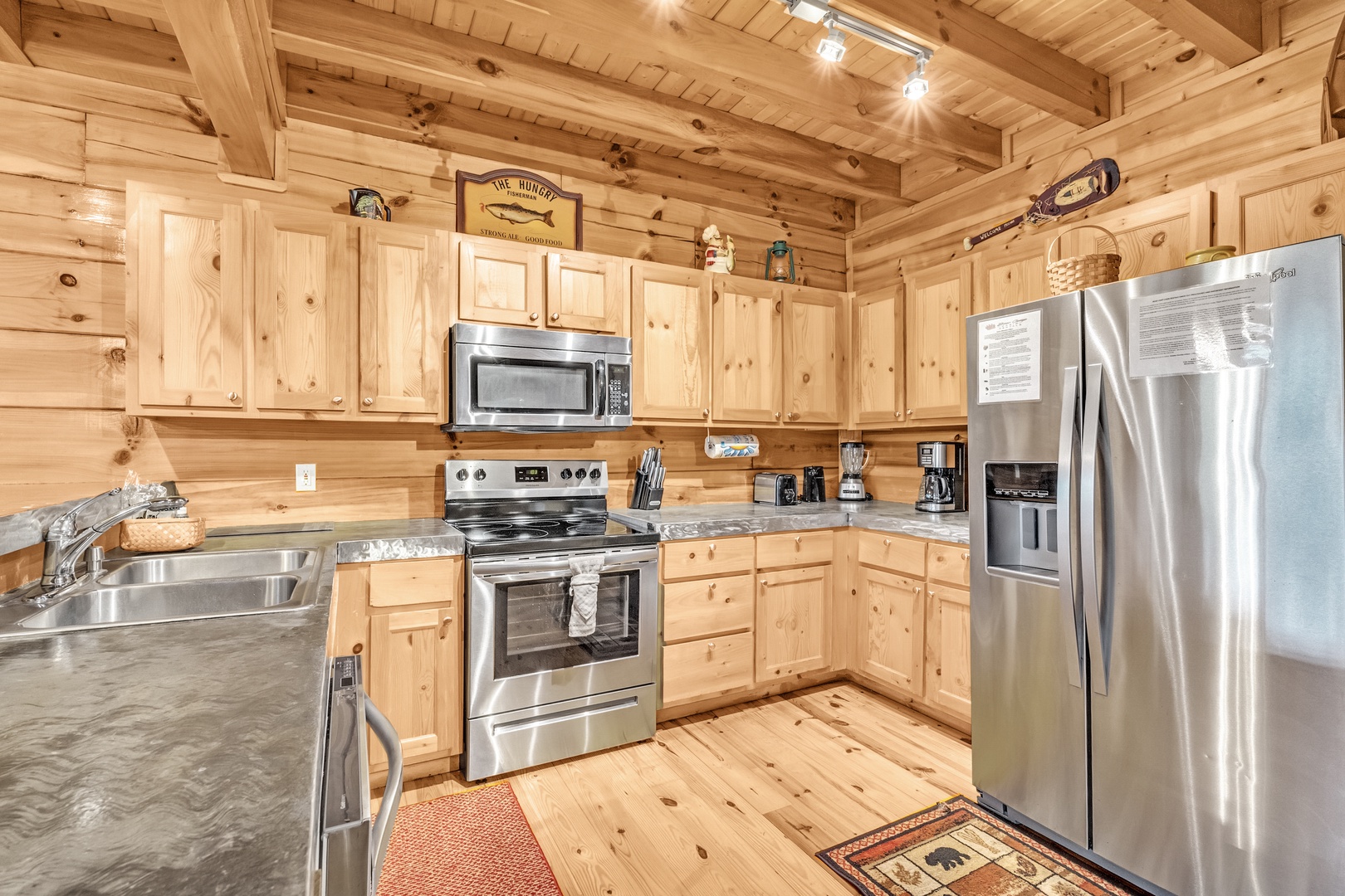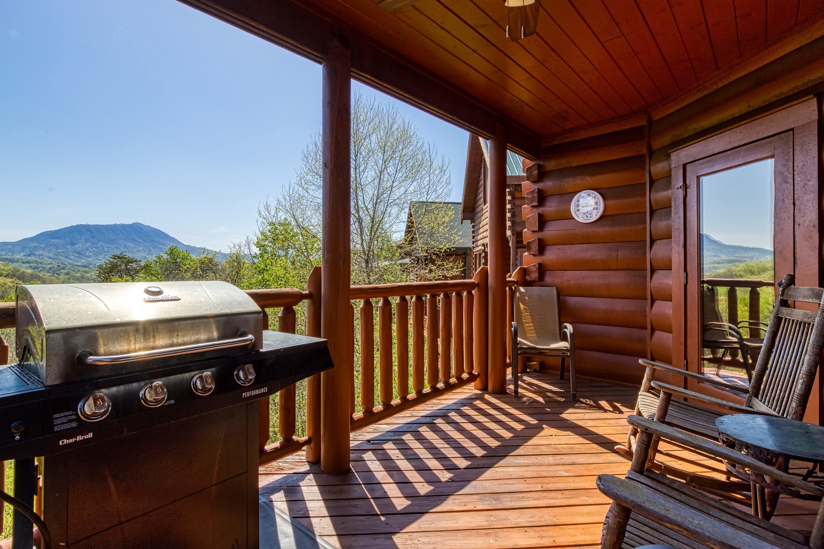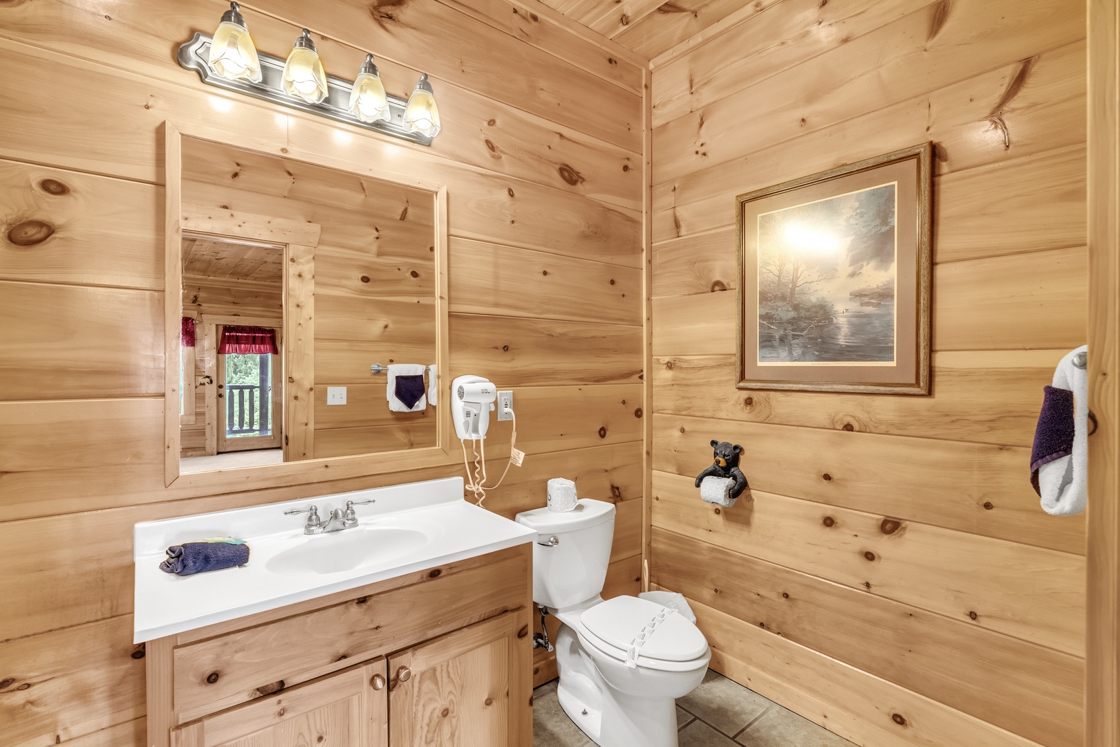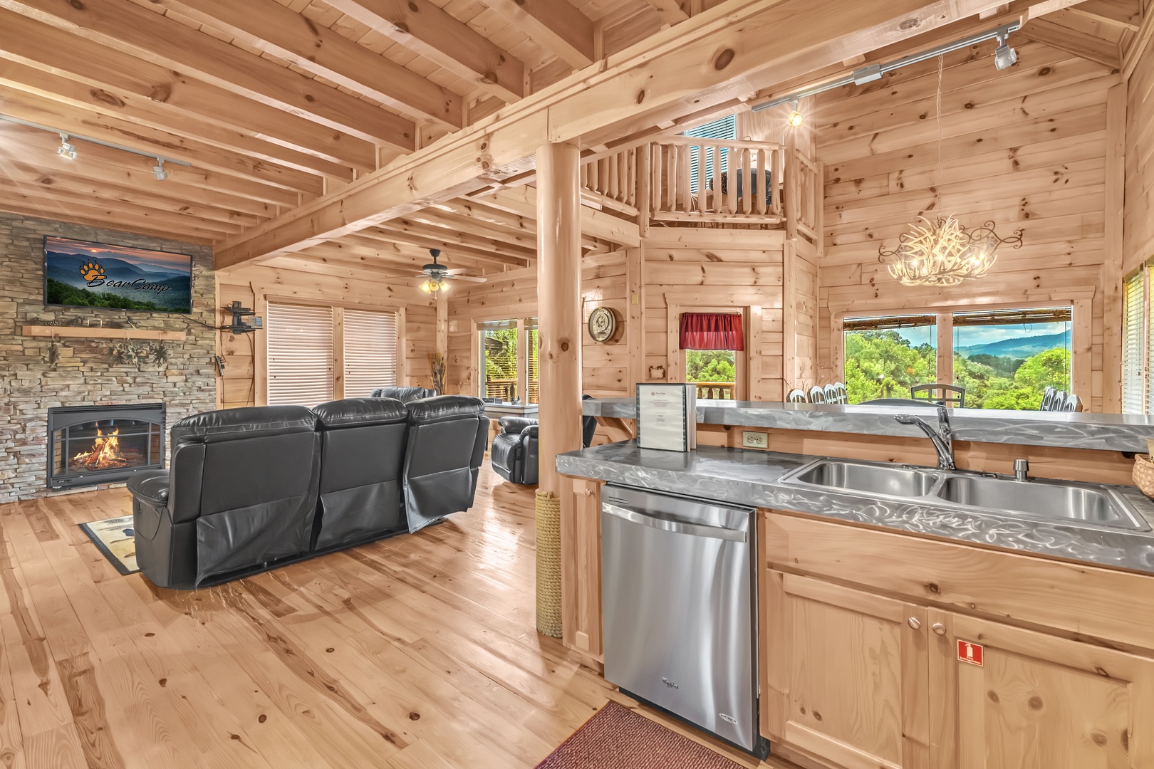 Entering the cabin on the main floor you'll be greeted with an open concept living, kitchen and dining room with views of ridges and mountains. The spacious living room is perfect to kick back and relax in the recliners and watch your favorite show or enjoy the electric fireplace for those special moments. The fully equipped kitchen is ready for all your meal prep whether it be breakfast or Thanksgiving dinner. The dining room has a massive dining table to seat 10 with access to the back deck where the gas grill is for your convenience. There is also a half bath next to the kitchen.