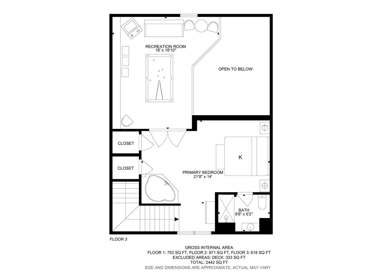 The Master King ensuite absorbs most of the top floor, with a huge ensuite like this who would want to leave. With a Jacuzzi tub in one corner, a Flat screen tv, a Plush King bed and a private bathroom with a walk-in shower any king or queen would be ready to relax here. Just through the Master bedroom is a gaming loft with a Pool table, and a multi arcade game, plus a flat screen tv and a Queen futon for the extra sleeping space.