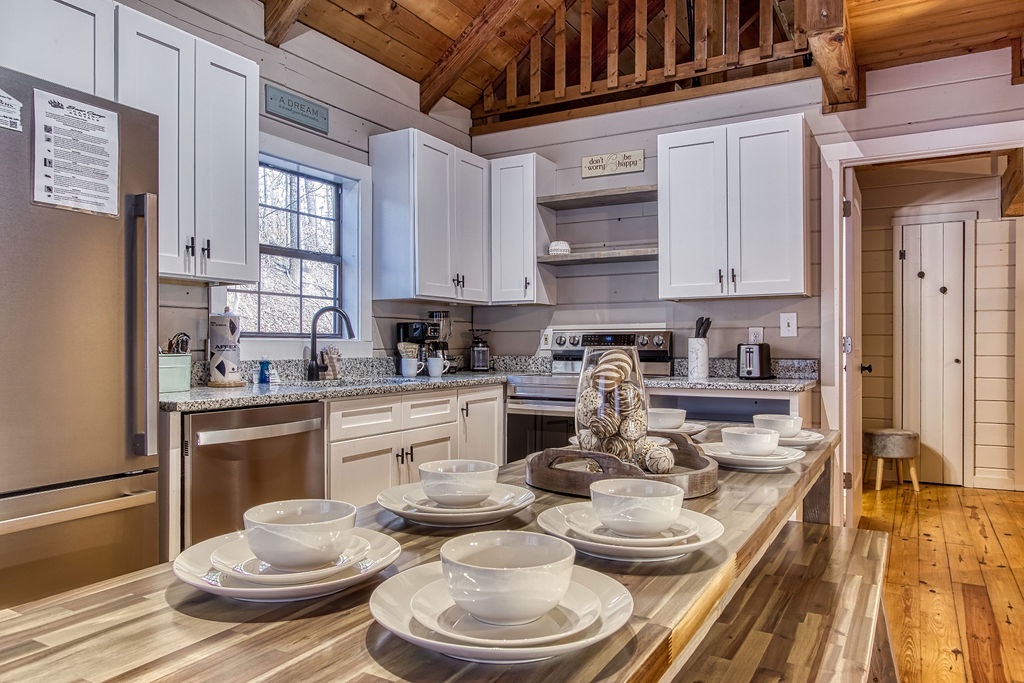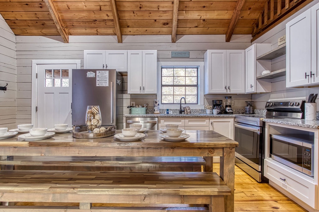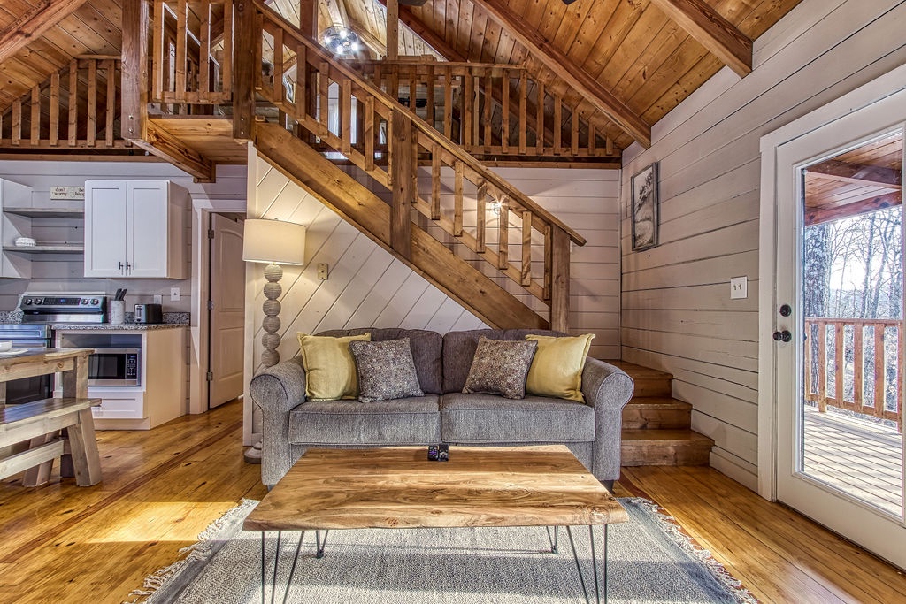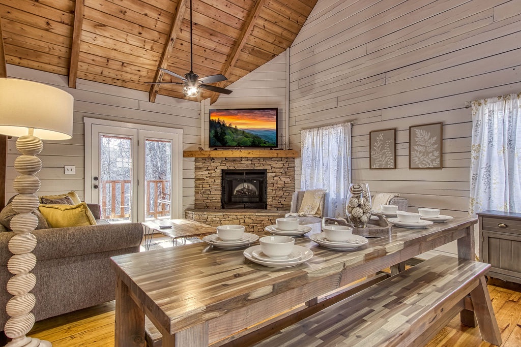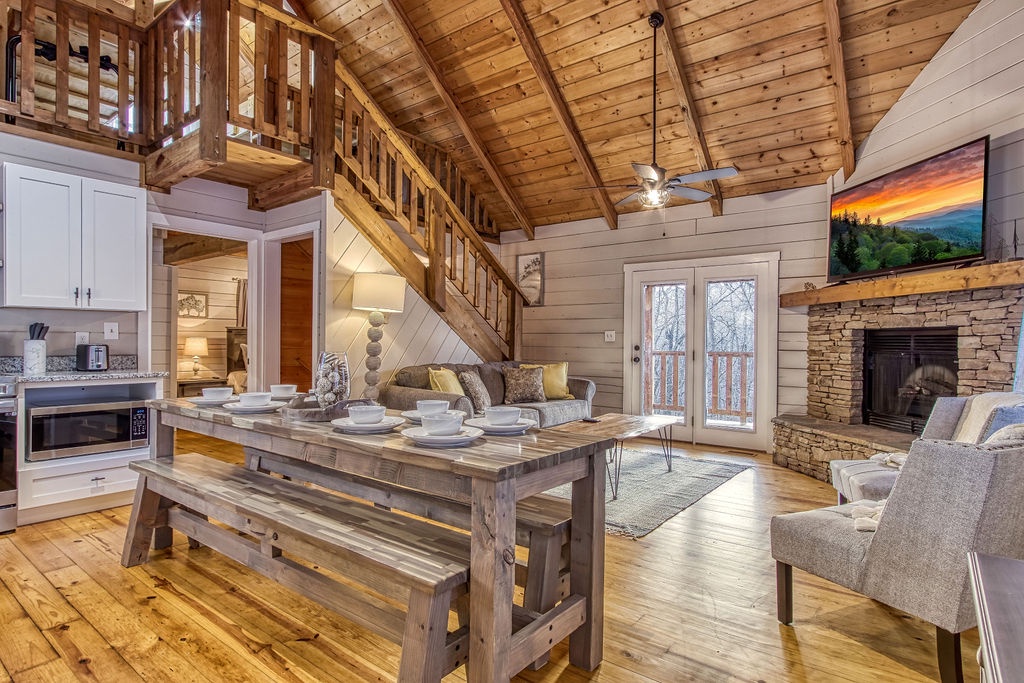 There are no steps to enter the cabin, and you will be pleasantly surprised by all the comforts of home when you step inside. On the main level, you will find a fully equipped kitchen and dining for 10 people comfortably. Adjacent to the dining area, you will find the living room with a comfortable sofa to relax on after a long day at Dollywood. On those cold winter nights, snuggle up on the sofa in front of the stone gas fireplace and catch up on a great book or enjoy a nice hot cup of hot chocolate while watching the fire.