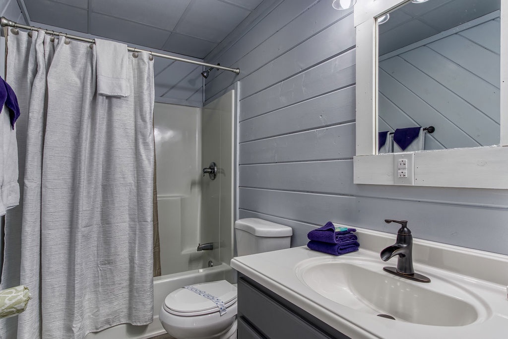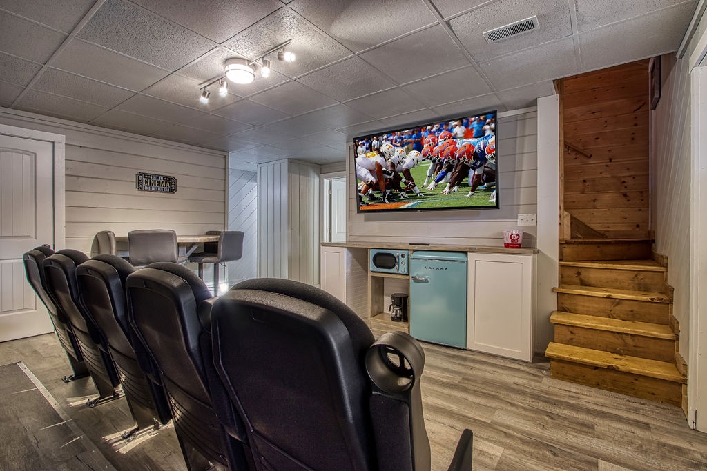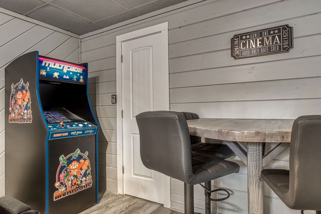 In the upper level, which is open to the living room and kitchen below, you will find built in twin/queen bunks. On the lower level you will find the Theater room with an arcade game, a flat screen TV, high-top table, and theater seating. Adjacent to the Theater, you will have an additional bedroom with a Queen size bed and a flat-screen TV. There is a shared full bathroom that has a tub/shower combo. Just outside the bathroom is a small closet this is where the washer and dryer are located.
