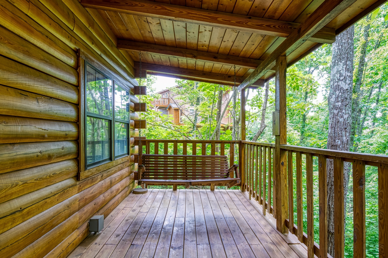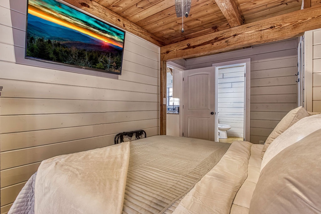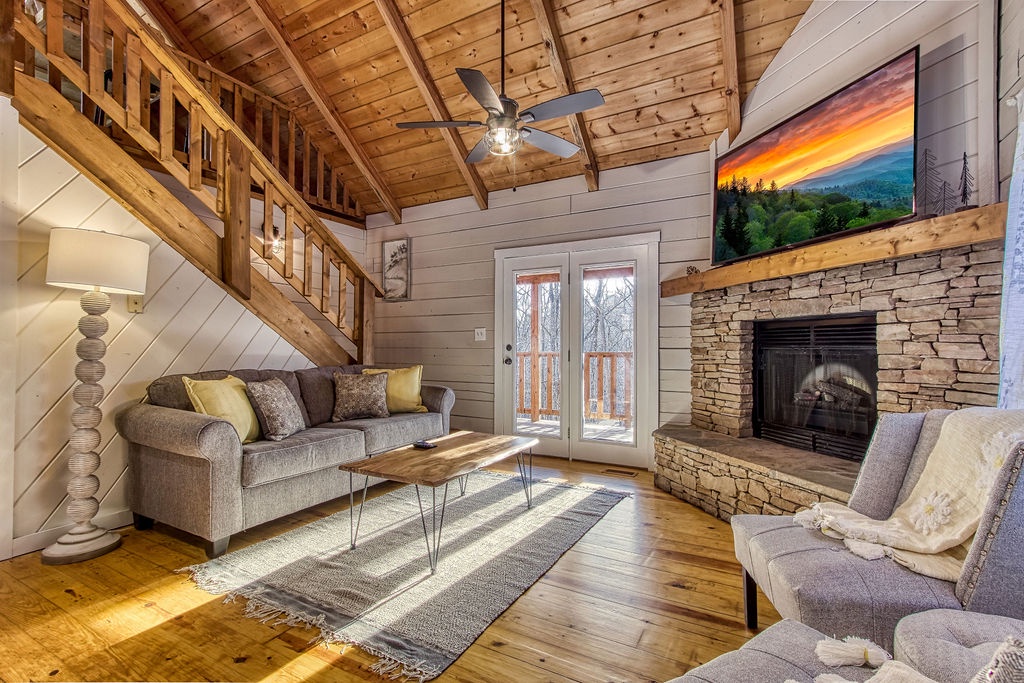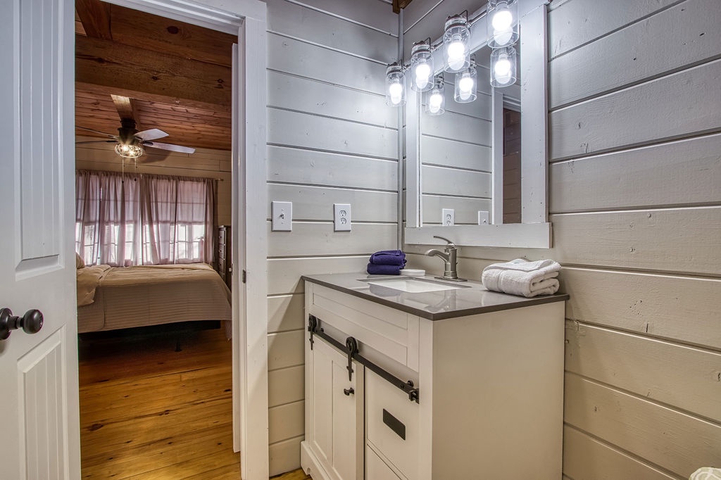 Also located on this level, you will have a Queen size bedroom with a flat screen TV and a bathroom that features the large walk-in shower to enjoy after hiking in the park. Sit outside on the main level deck and enjoy your morning coffee while relaxing in one of the porch swings and listening to the bird’s chirp around you in the wooded setting.