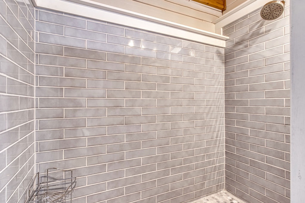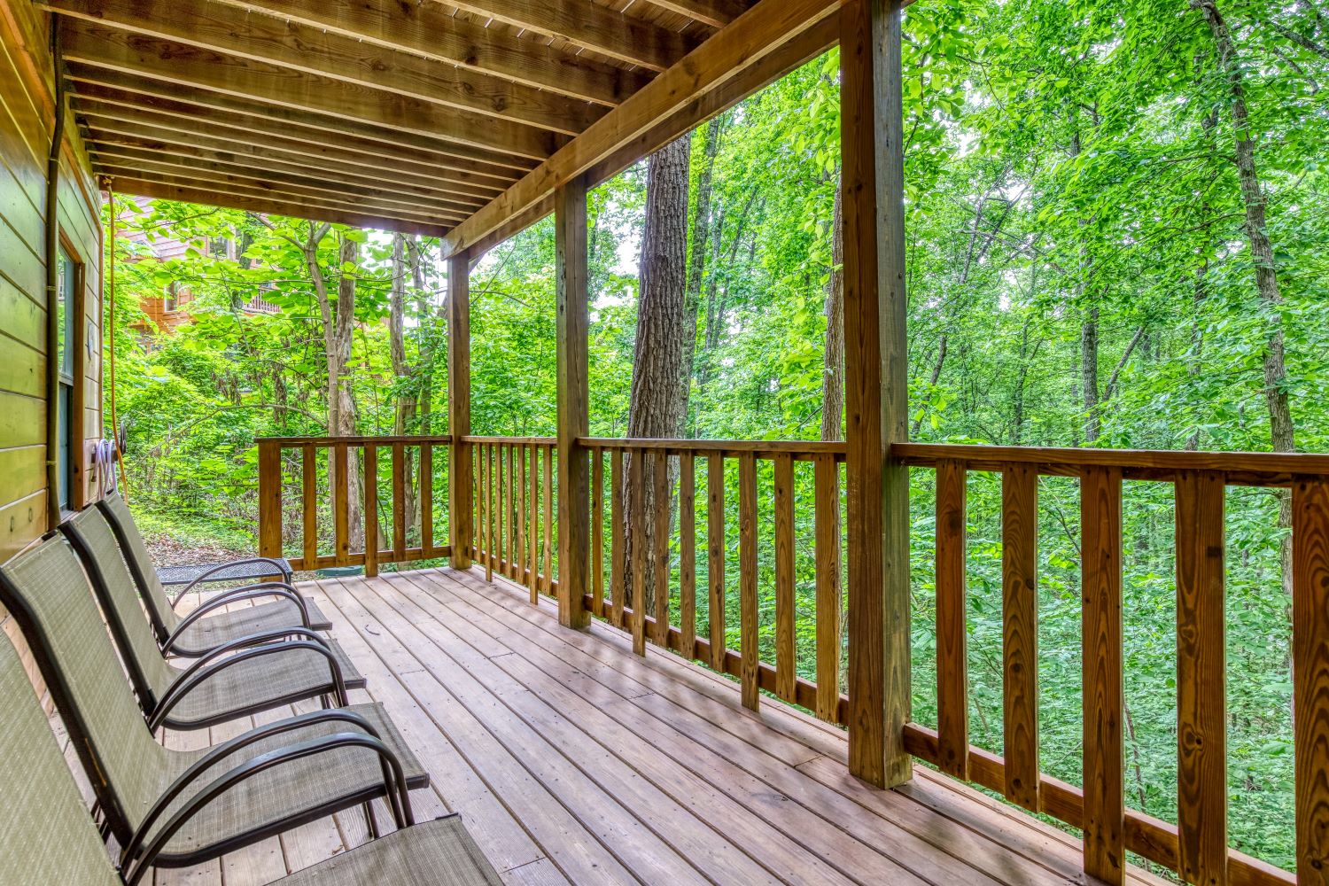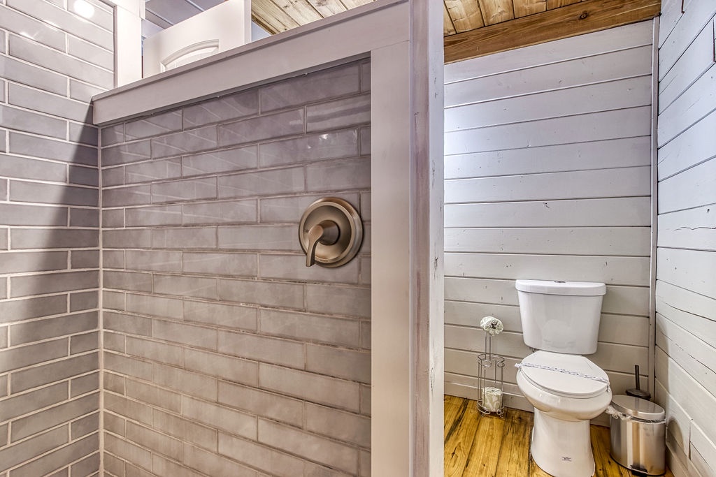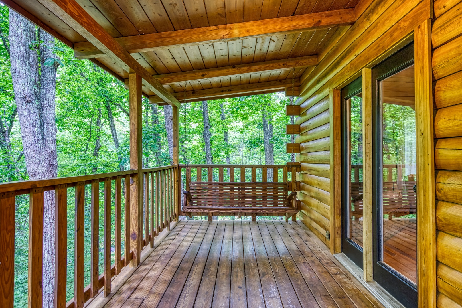 Also located on this level, you will have a Queen size bedroom with a flat screen TV and a bathroom that features the large walk-in shower to enjoy after hiking in the park. Sit outside on the main level deck and enjoy your morning coffee while relaxing in one of the porch swings and listening to the bird’s chirp around you in the wooded setting.