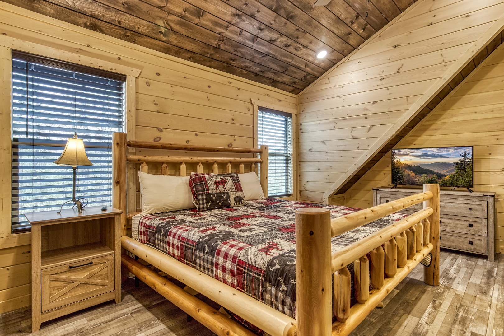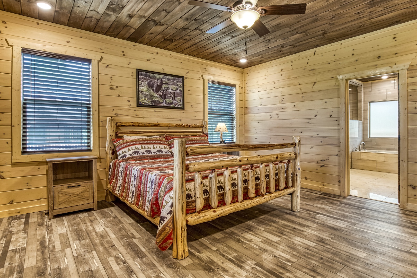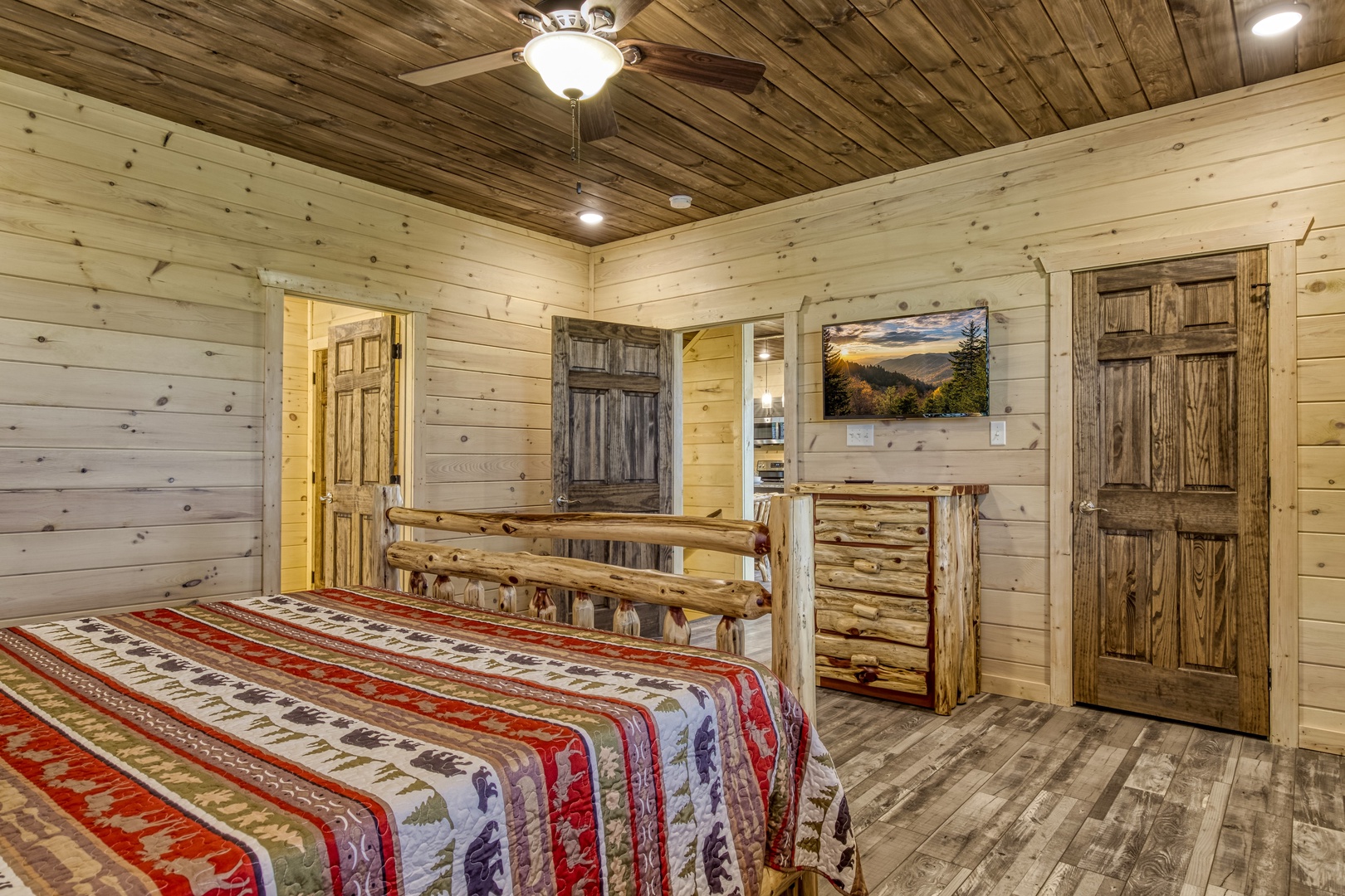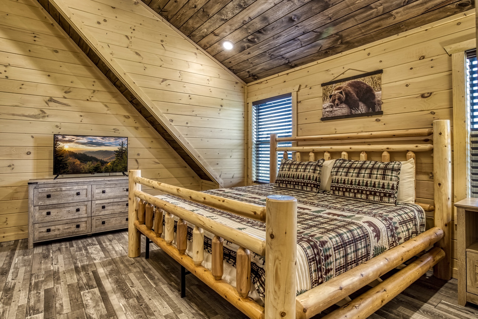 Relax in the comfortable living room furnished with a plush couch and love seat positioned in front of an electric fireplace and flat-screen TV. For added convenience, there's a washer and dryer along with a half bath on this level. The main floor bedroom offers a serene sanctuary with a large log king bed, flat-screen TV, and a private ensuite complete with a luxurious walk-in shower and a soothing jacuzzi tub.