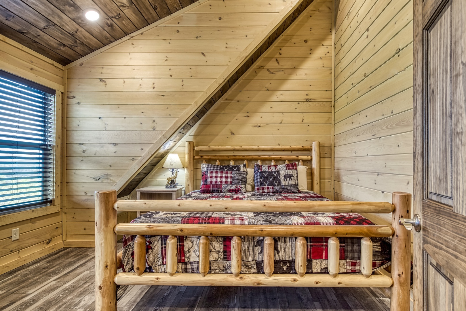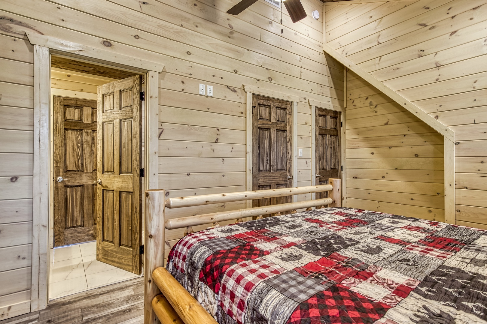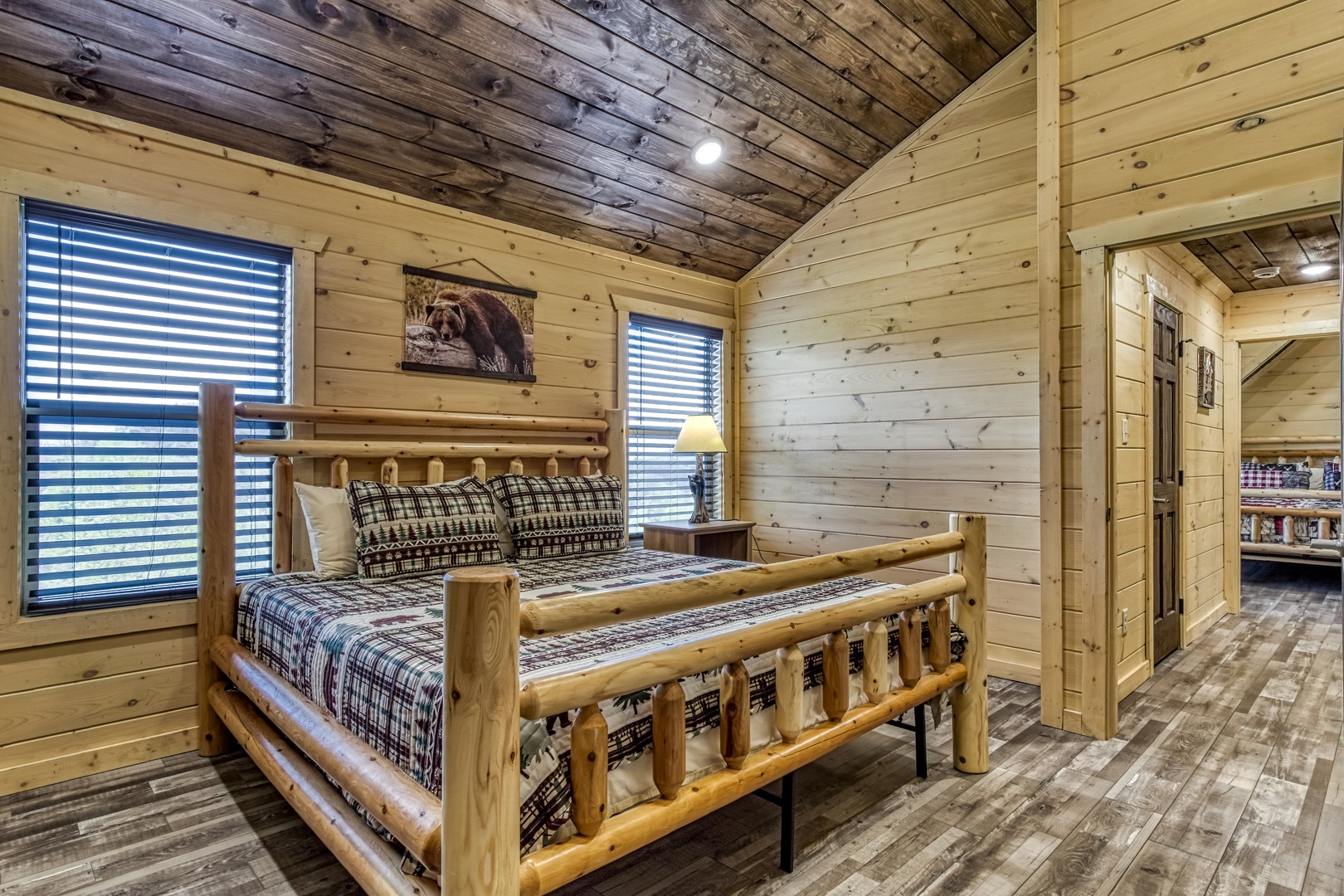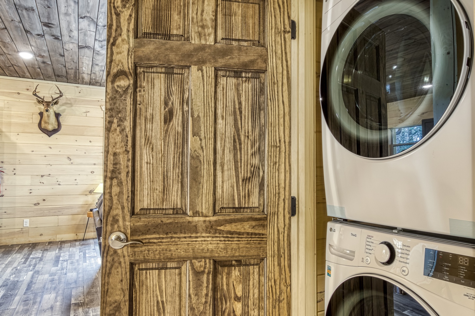 Relax in the comfortable living room furnished with a plush couch and love seat positioned in front of an electric fireplace and flat-screen TV. For added convenience, there's a washer and dryer along with a half bath on this level. The main floor bedroom offers a serene sanctuary with a large log king bed, flat-screen TV, and a private ensuite complete with a luxurious walk-in shower and a soothing jacuzzi tub.