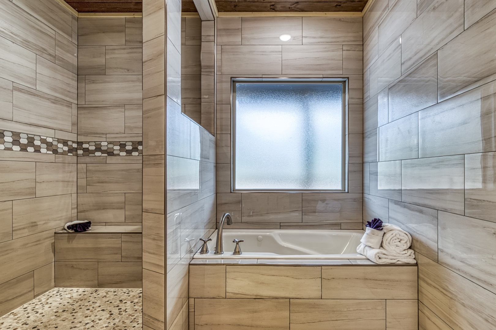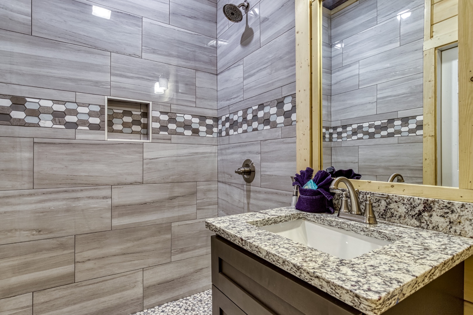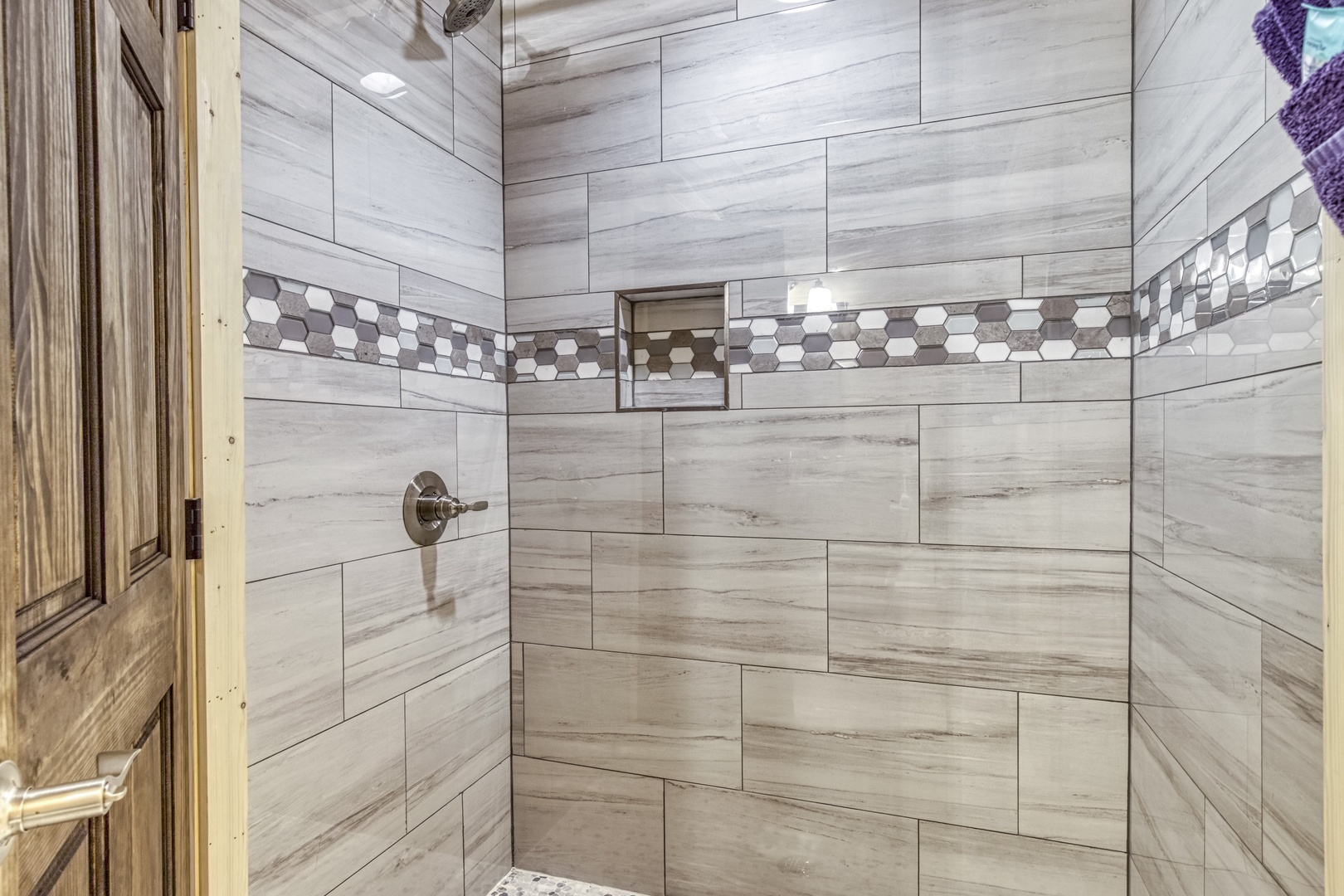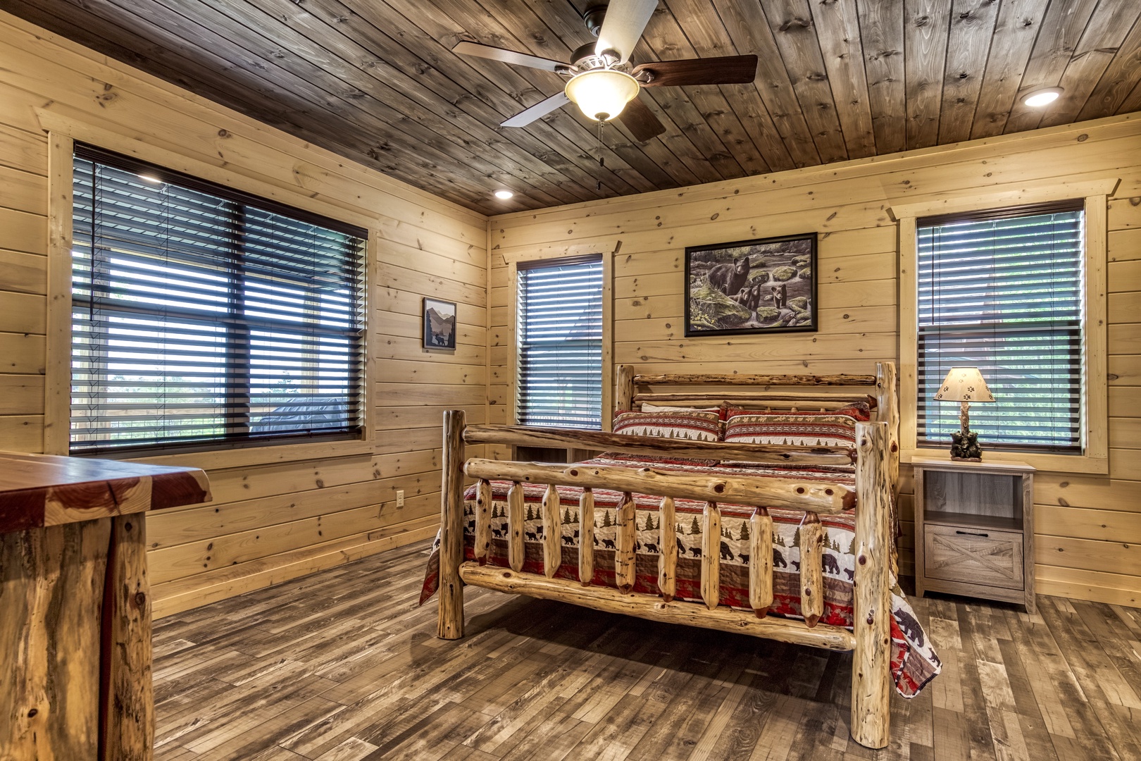 Relax in the comfortable living room furnished with a plush couch and love seat positioned in front of an electric fireplace and flat-screen TV. For added convenience, there's a washer and dryer along with a half bath on this level. The main floor bedroom offers a serene sanctuary with a large log king bed, flat-screen TV, and a private ensuite complete with a luxurious walk-in shower and a soothing jacuzzi tub.