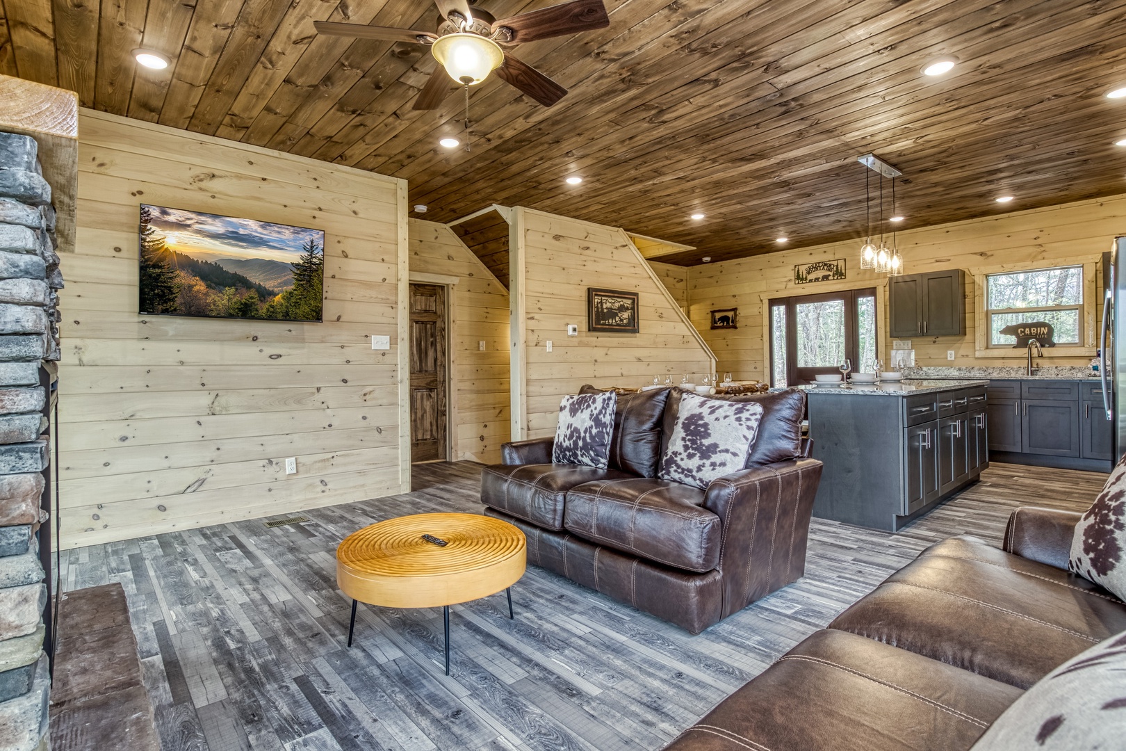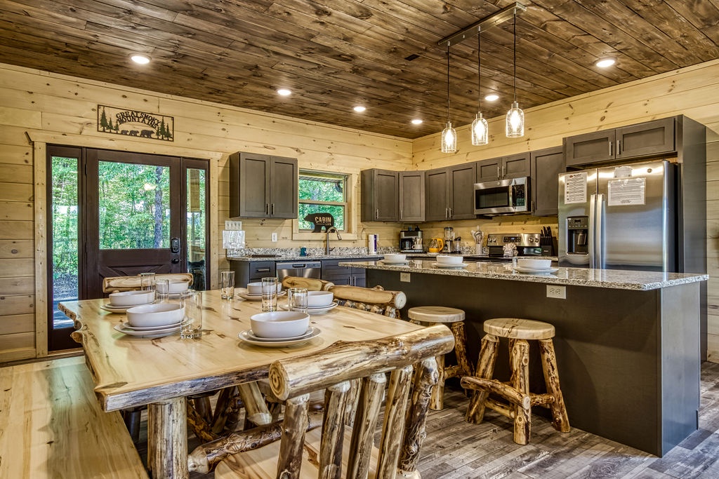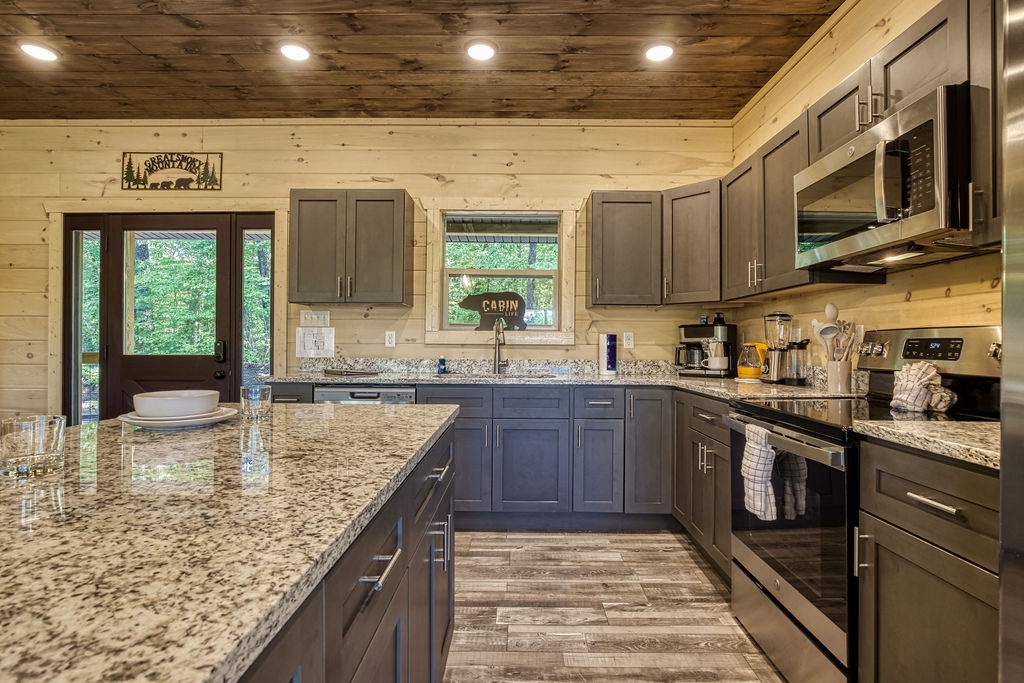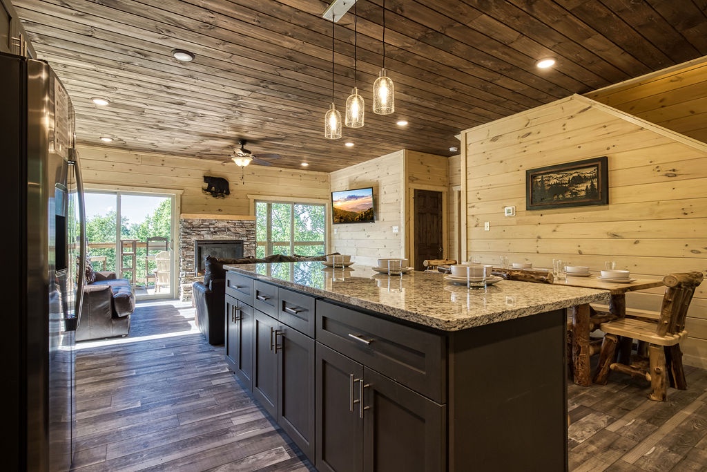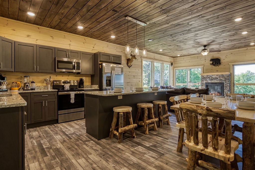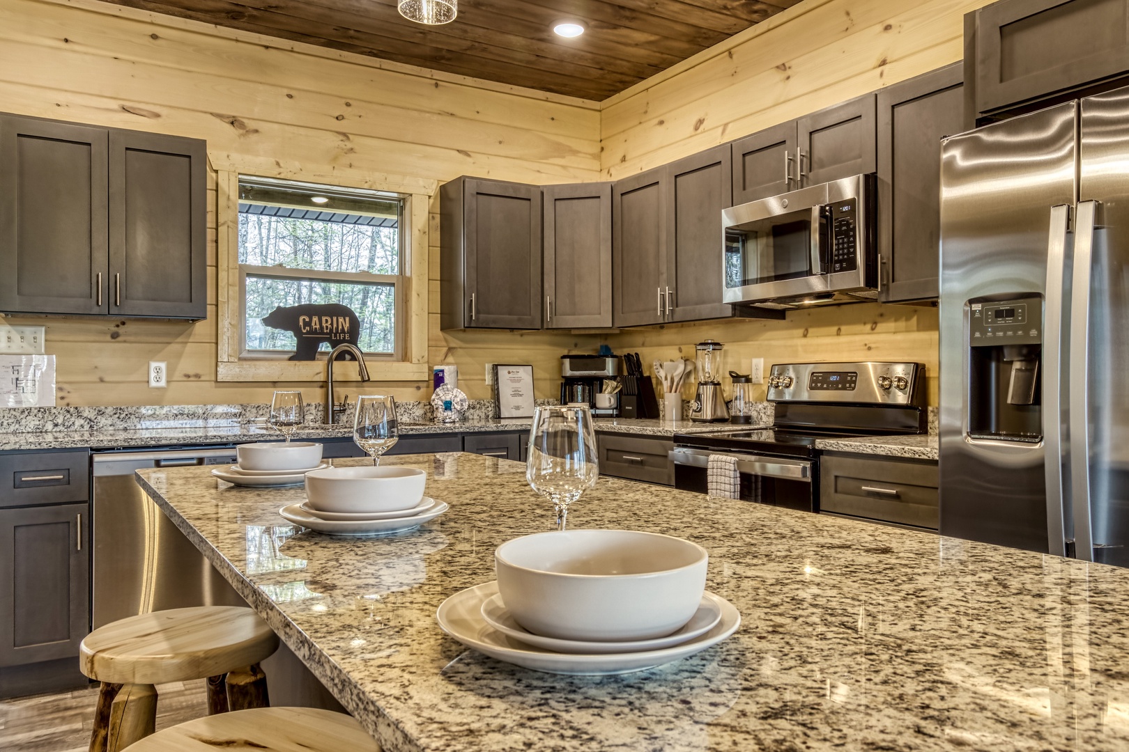 Conveniently located with paved roads leading right up to the cabin, Adventure Splash ensures easy accessibility for all guests. As you enter on the middle floor, you're greeted by an inviting open-concept layout featuring a fully equipped kitchen, dining area, and cozy living space. The kitchen is a chef's delight, equipped with a large center island adorned with granite countertops and stainless steel appliances. Gather around the island's seating for 3 or enjoy a family meal at the dining table accommodating 6.