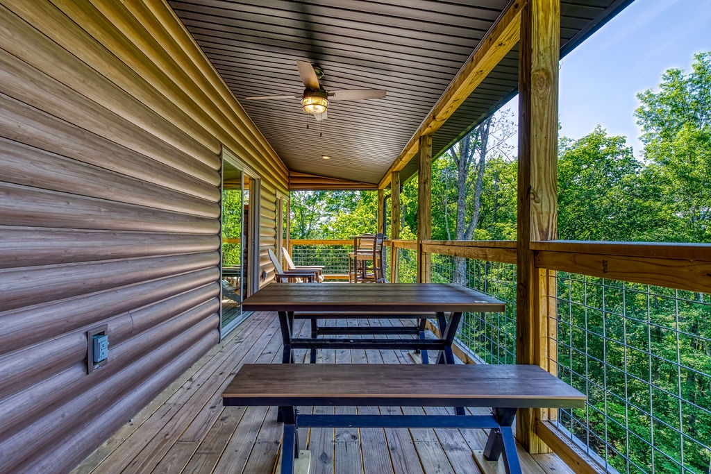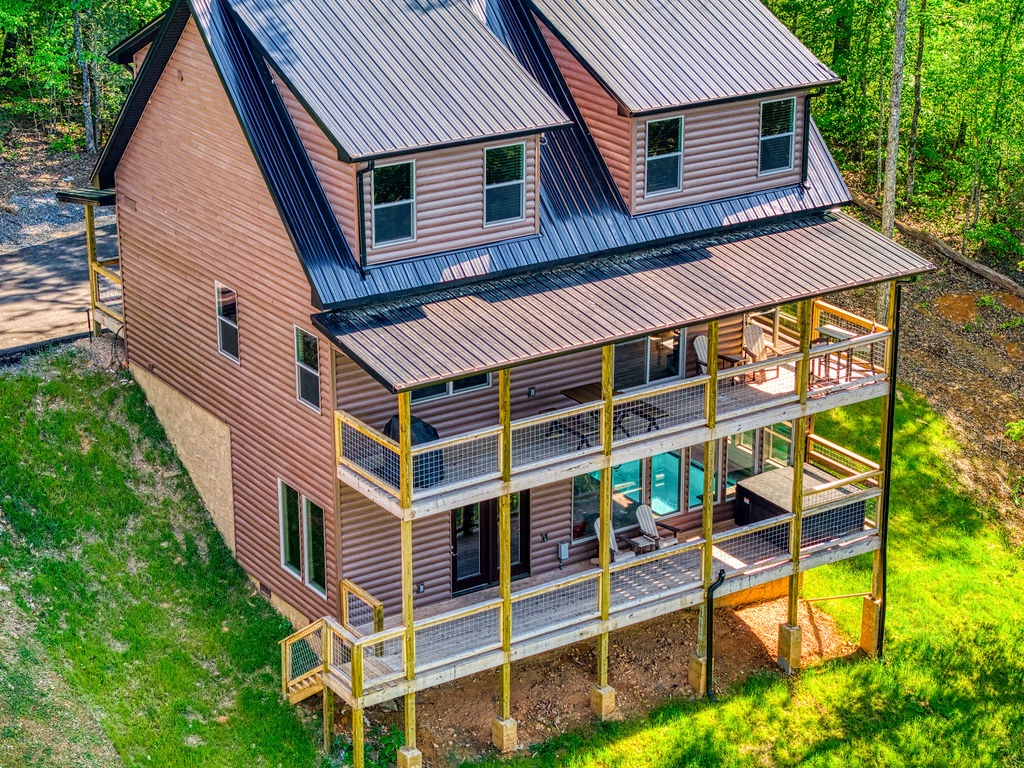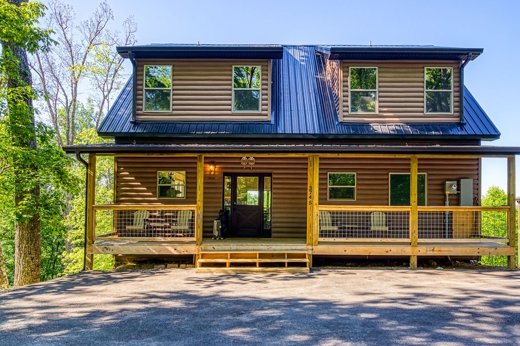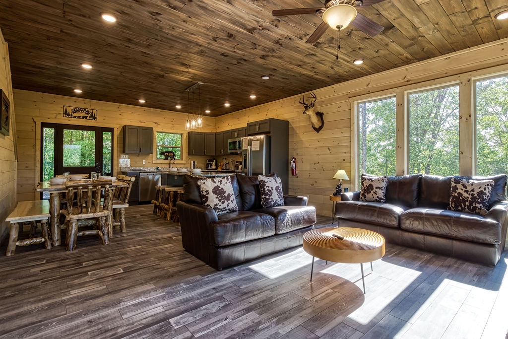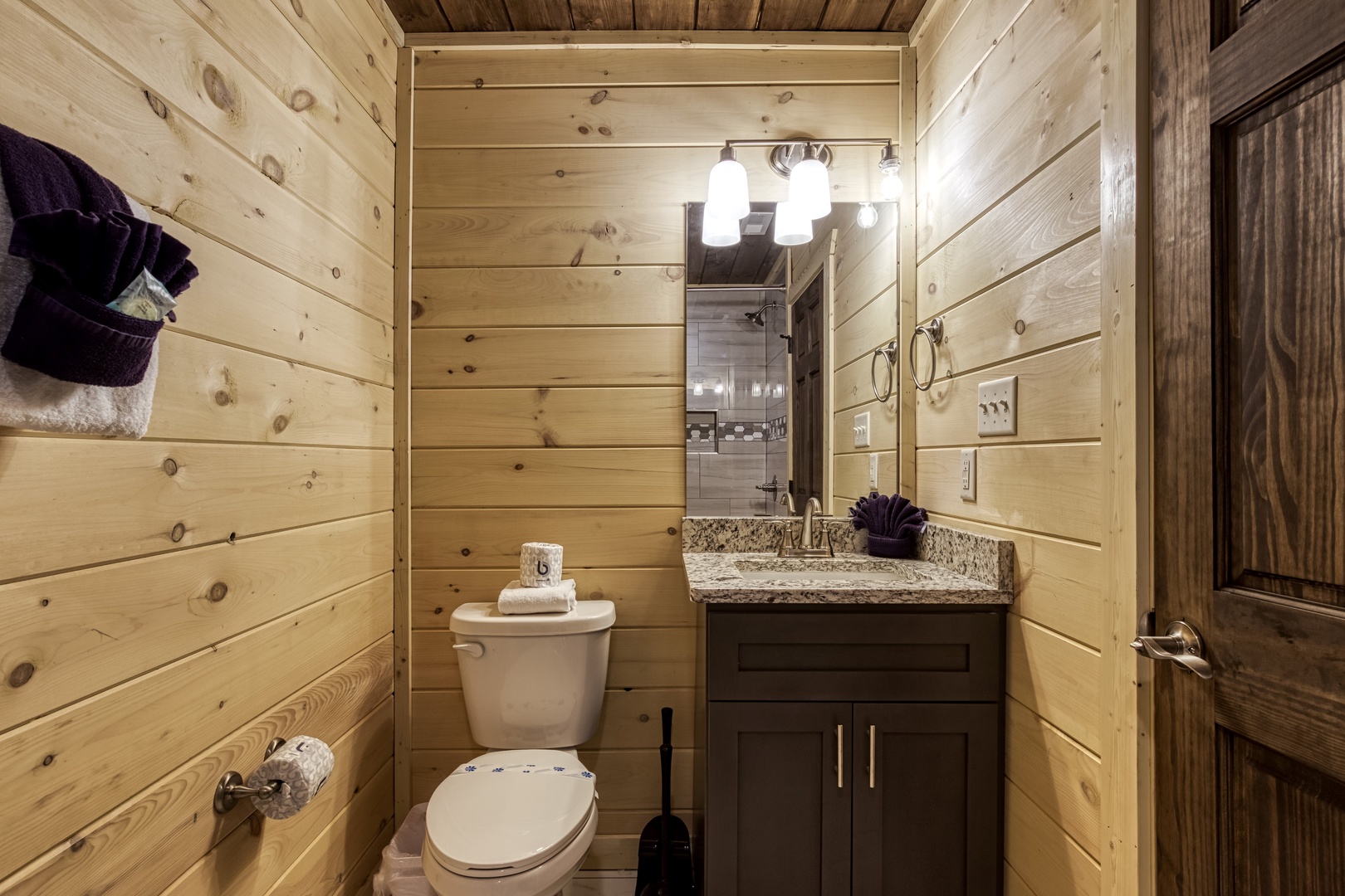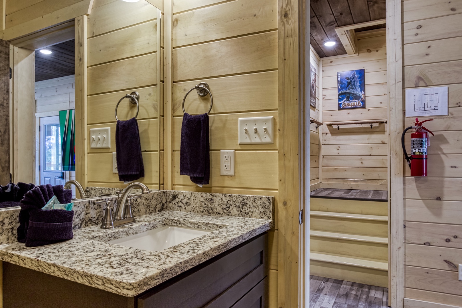 Conveniently located with paved roads leading right up to the cabin, Adventure Splash ensures easy accessibility for all guests. As you enter on the middle floor, you're greeted by an inviting open-concept layout featuring a fully equipped kitchen, dining area, and cozy living space. The kitchen is a chef's delight, equipped with a large center island adorned with granite countertops and stainless steel appliances. Gather around the island's seating for 3 or enjoy a family meal at the dining table accommodating 6.