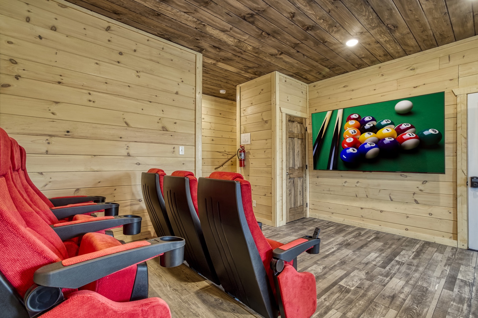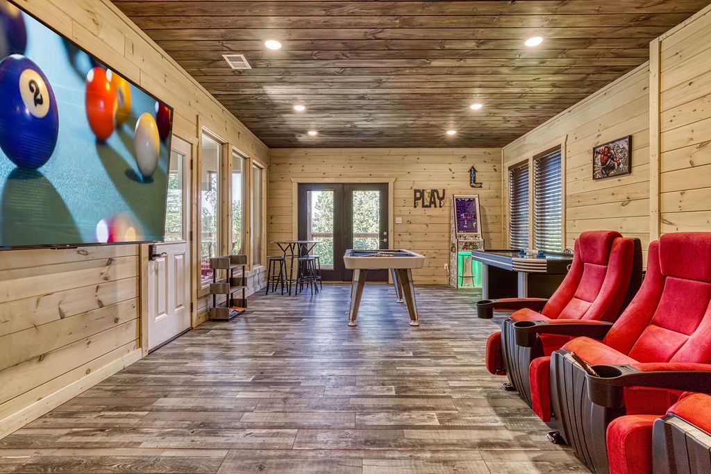 The bottom floor is a haven for family fun and bonding. A dedicated theater area beckons with seating for 6, perfect for movie nights or catching up on your favorite shows. The adjacent gaming area features a mini pool table, arcade game, and air hockey, providing hours of entertainment for all ages. Plus, there's a convenient half bath for added convenience.