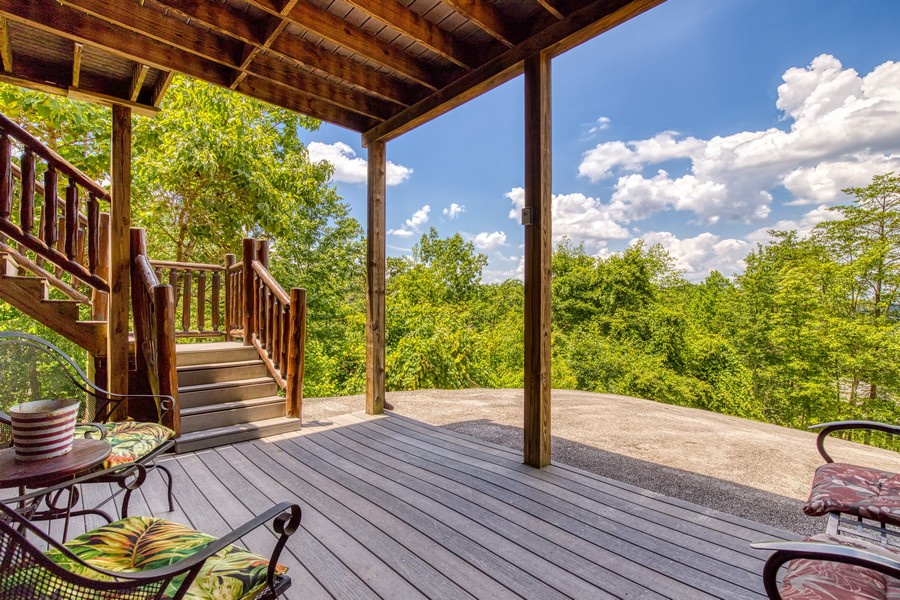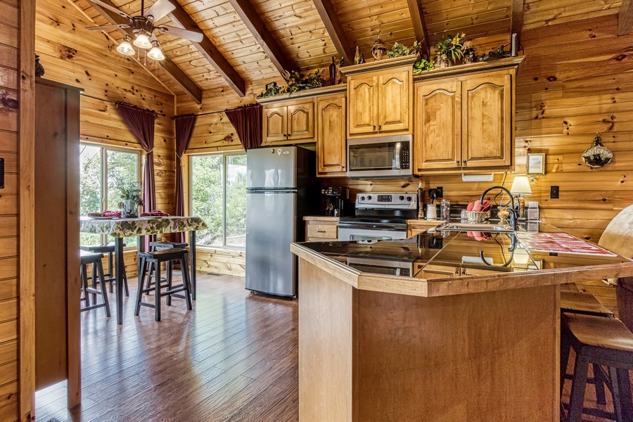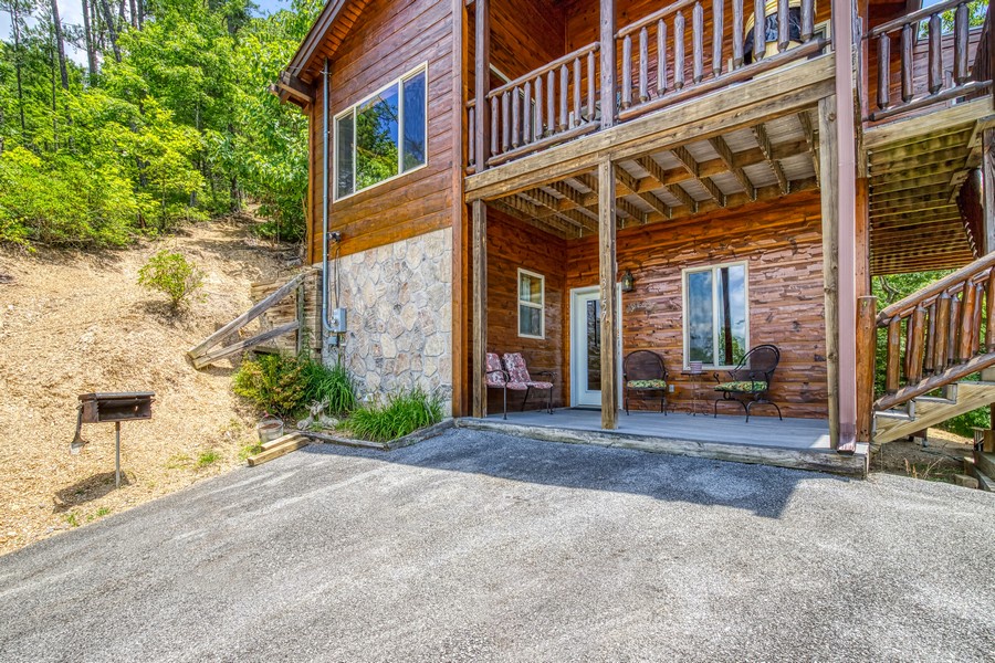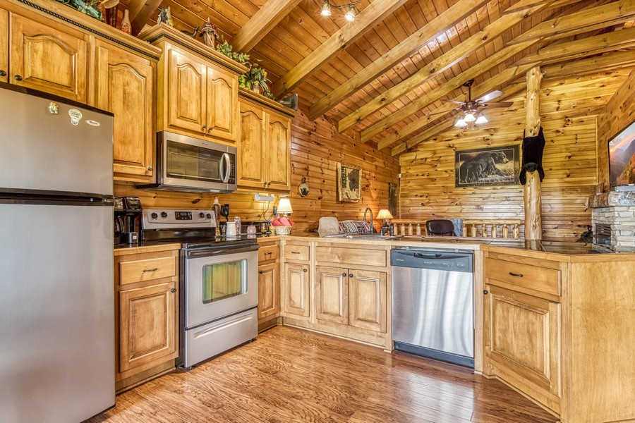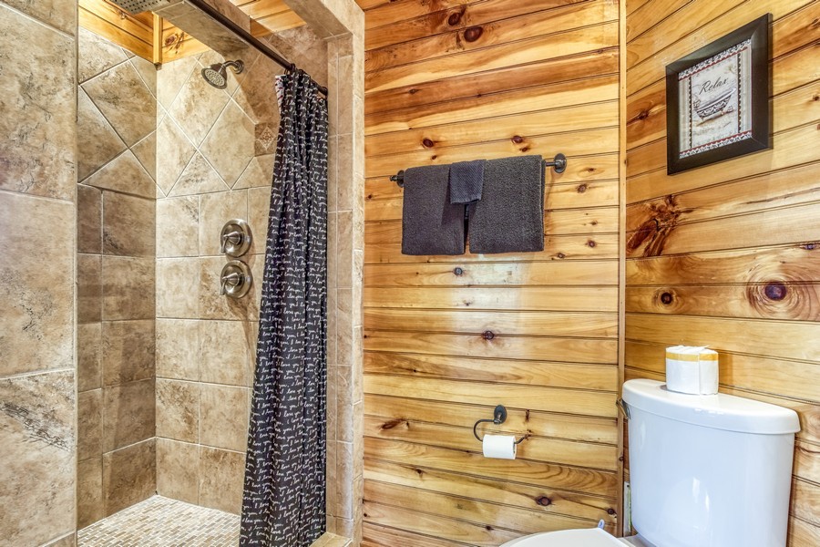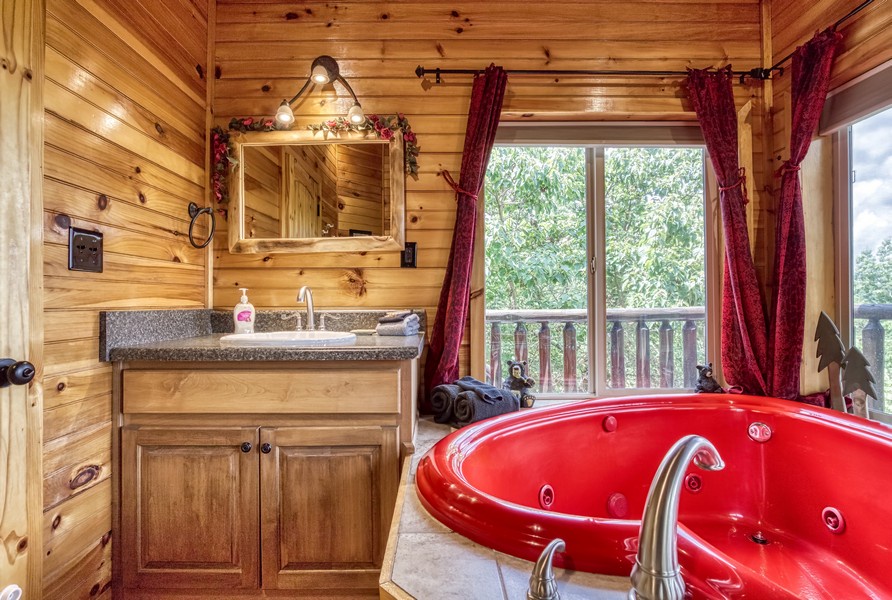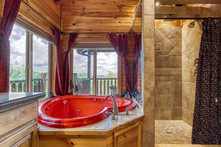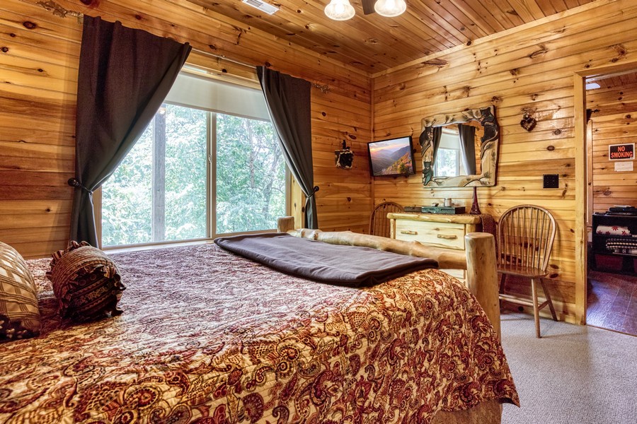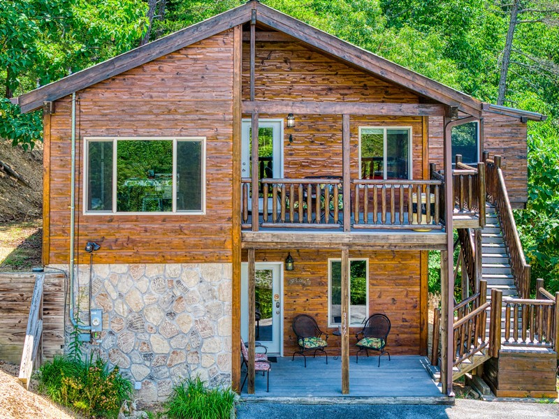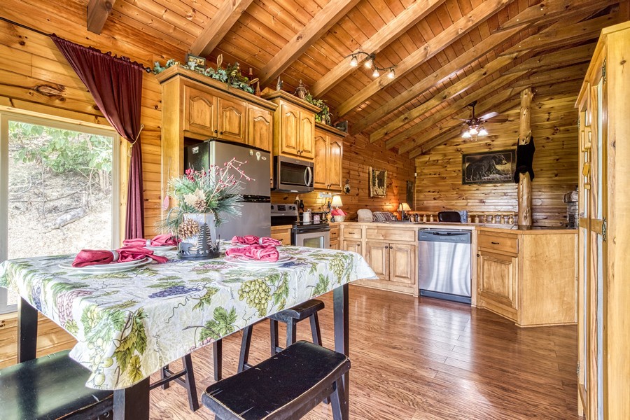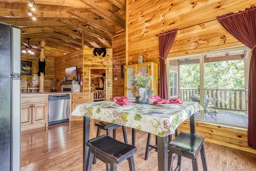 "Bear Elegance” is the perfect cabin if you are looking for a special place to relax, unwind, and enjoy all the Great Smoky Mountains has to offer. You are just secluded enough so you feel the privacy, but still convenient to all the area attractions. Whether you are on your honeymoon, couple's getaway or a small family retreat, then this is the cabin for you. "Bear Elegance" is a 2-bedroom 2-bathroom cabin that will sleep 4 and is 2 stories. Located on Bear Mountain, approximately a 20-minute drive from Pigeon Forge, Splash Country & Dollywood, and 25-30 to Gatlinburg. This cabin has curvy mountain roads and some steep inclines that can be narrow at times. There are paved roads all the way to the cabin with the parking being gravel and parking for 2 vehicles comfortably. This cabin would not be considered motorcycle or trailer friendly. With only one step to enter on the lower level of this lovely cabin, you will be taken back when you step inside with all the wood interior and all the comforts you could ask for in your home away from home. You will enter on the lower level where you will find a game room/ theater room with a pool table, washer, and dryer, full-size bathroom with a tub/shower combination, a massive projector screen, and 5 theater seats. Just bring your favorite movie you want to watch or play a friendly game of pool. Also, on this level is a bedroom with a lovely log style Full bed and a flat-screen TV. As you travel upstairs, be ready to be amazed by the gorgeous mountain views from the dining area and off the deck. In the living room relax on the comfy leather couch or kick your feet up in the recliner after a day of sightseeing. On those cold winter nights grab your favorite blanket and a cup of hot cocoa and unwind in front of the stone gas fireplace while watching your favorite show on the flat-screen TV. Adjacent to the living room is the fully equipped kitchen with stainless steel appliances and dining for 4 guests while overlooking the mountain view and there are 2 additional stools at the counter. Just off the kitchen and living room is the master suite with its own private bathroom. This bedroom has a gorgeous log style king bed, flat-screen TV and in the bathroom, you will find a heart-shaped Jacuzzi tub and a walk-in rain shower. There is a door that leads out onto the screened-in porch where you will find the hot tub to relax and unwind in after a long day at Dollywood and soak all your cares away. If you are looking for a great cabin to come and unwind from the hustle and bustle of everyday life and want a peaceful vacation, but still convenient to all the area attractions, then look no farther than "Bear Elegance" for your next mountain vacation. What are you waiting for? Book this adorable cabin today before it is too late!!!!