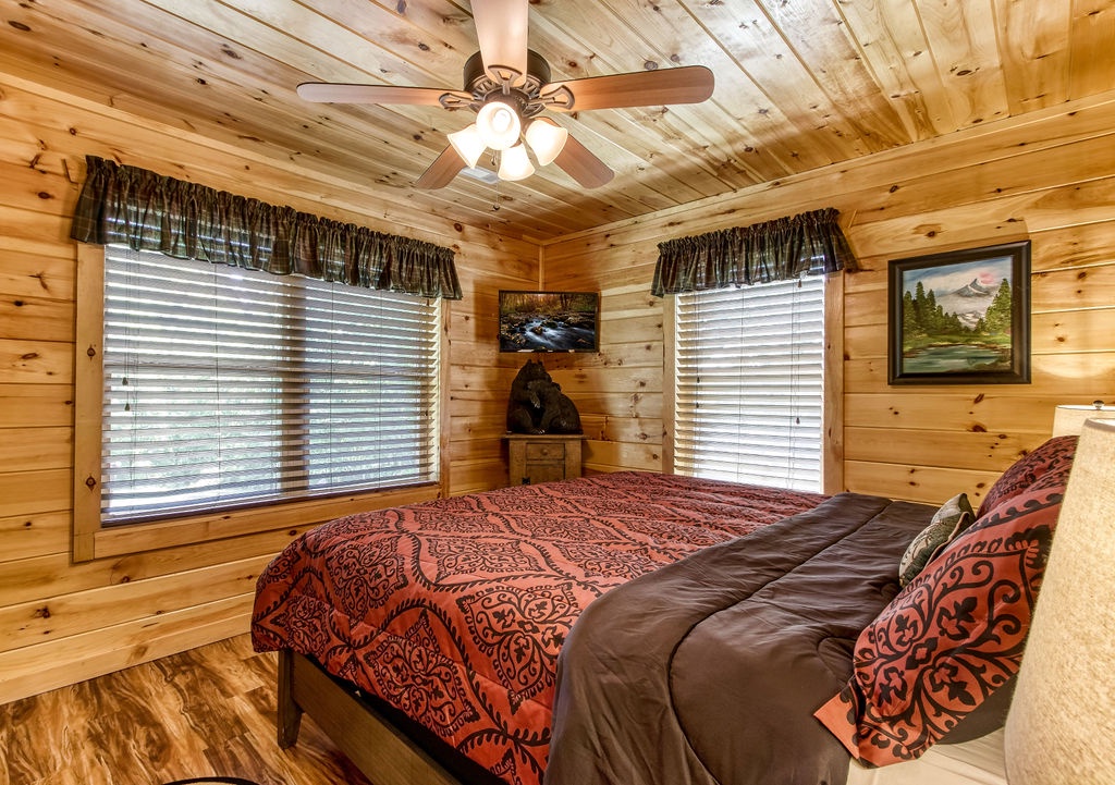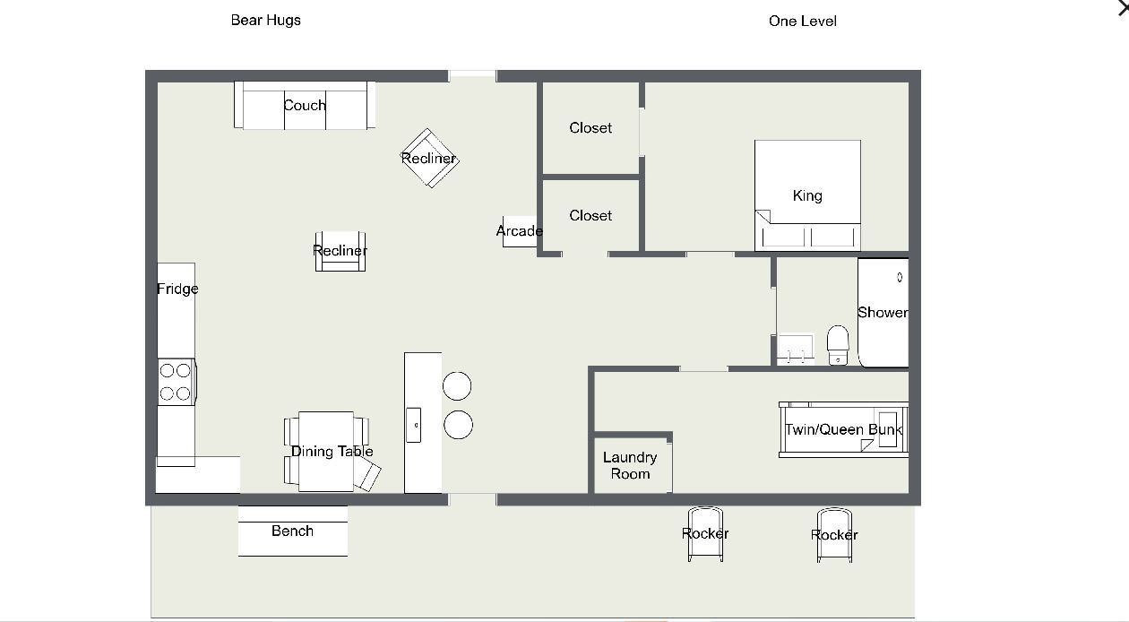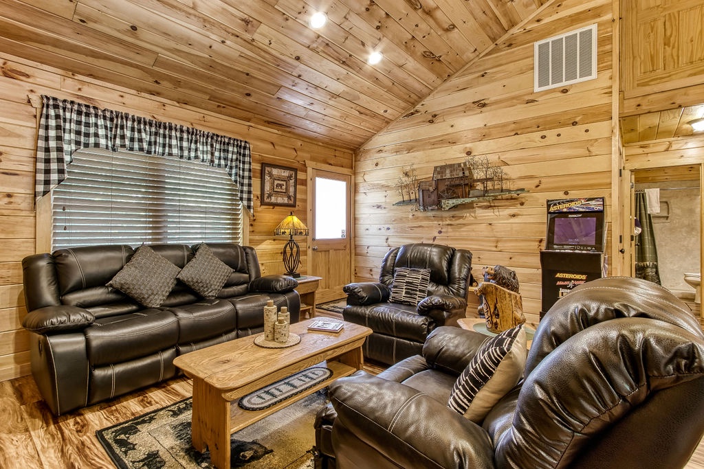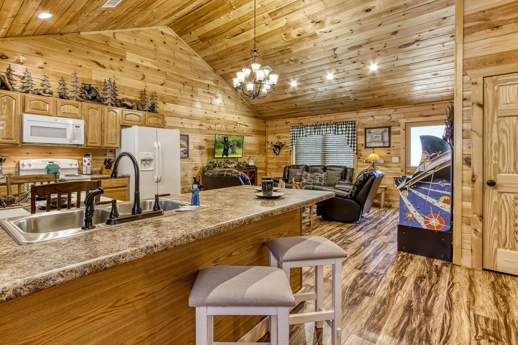 There are no steps to enter the cabin, but once you do you will be amazed by all the hardwood floors and the adorable décor throughout the cabin. The kitchen, dining room, and living room are an open floor plan so you never will miss out on a conversation among family and friends. Watch your favorite show on the flat screen TV or play a game on the arcade while you relax after a long day of sightseeing. There is a fully equipped kitchen with dining for 4 plus 2 bar stools. You can access the nice, level back yard from the living room where you will have a charcoal grill for the grill masters, just bring your charcoal and your favorite food and you are all set.