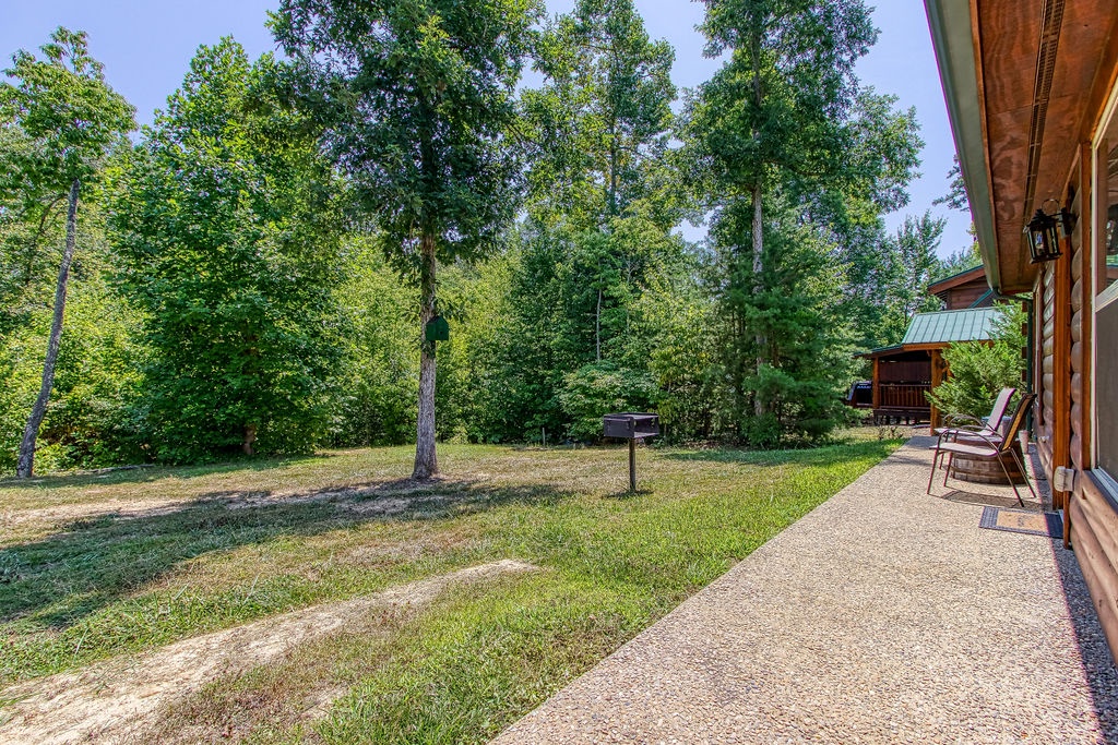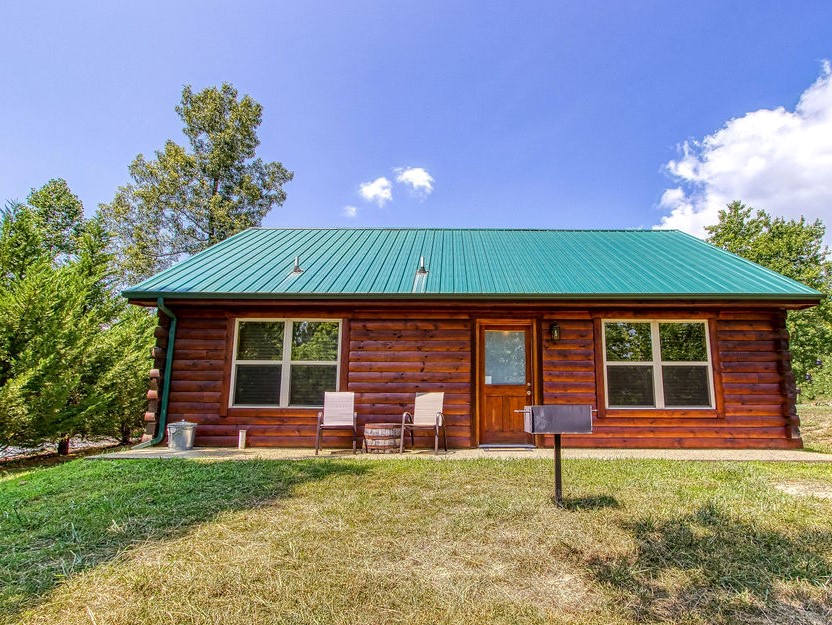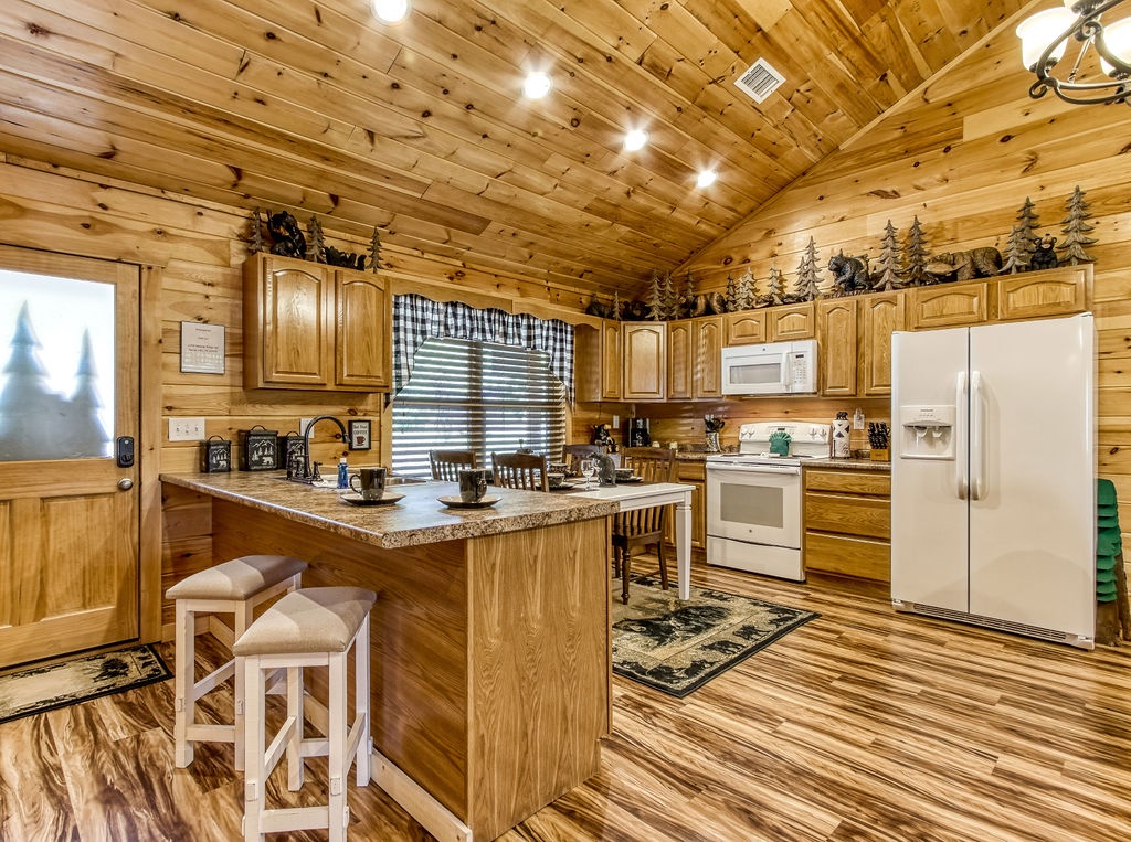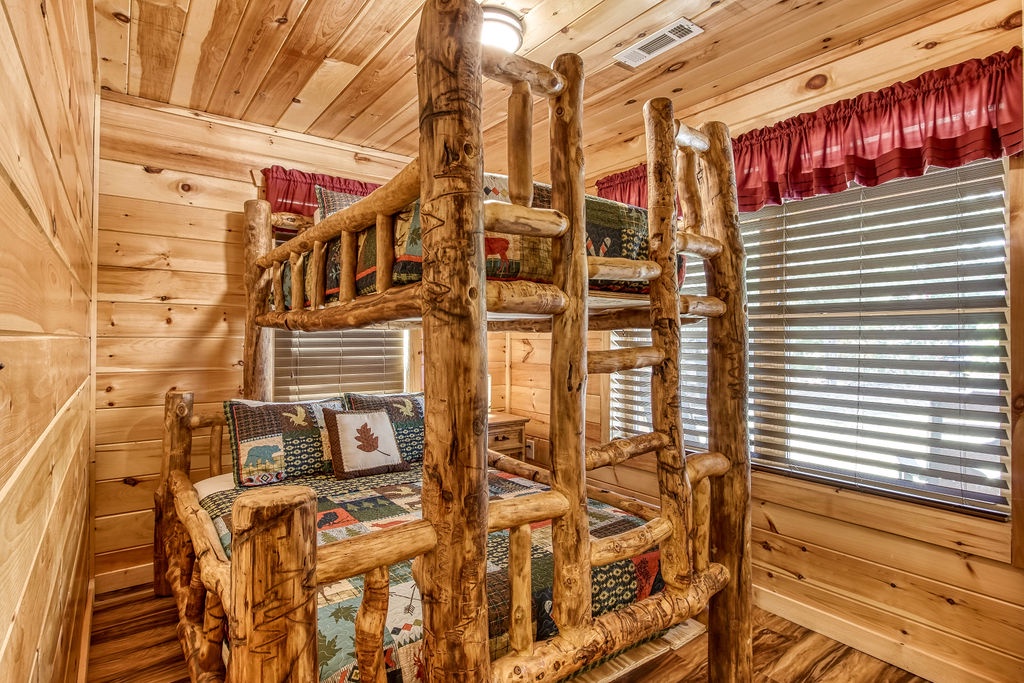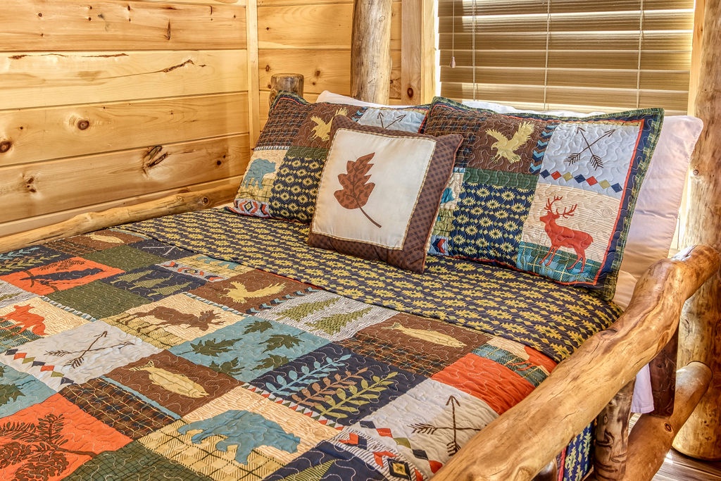 There are no steps to enter the cabin, but once you do you will be amazed by all the hardwood floors and the adorable décor throughout the cabin. The kitchen, dining room, and living room are an open floor plan so you never will miss out on a conversation among family and friends. Watch your favorite show on the flat screen TV or play a game on the arcade while you relax after a long day of sightseeing. There is a fully equipped kitchen with dining for 4 plus 2 bar stools. You can access the nice, level back yard from the living room where you will have a charcoal grill for the grill masters, just bring your charcoal and your favorite food and you are all set.