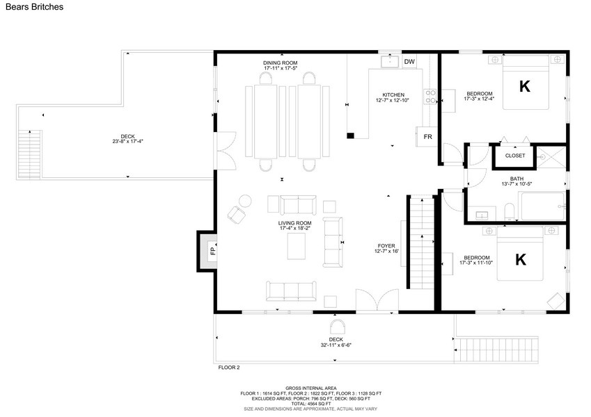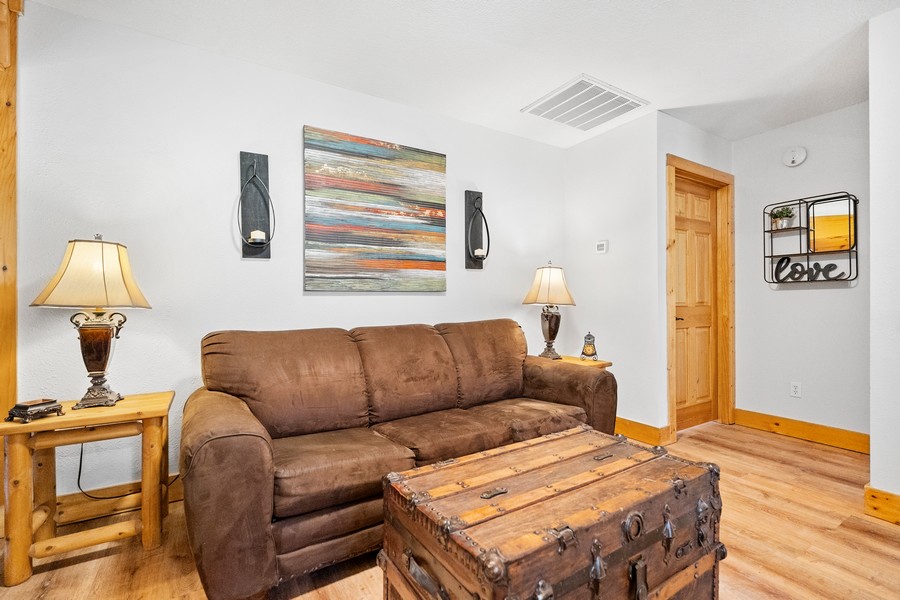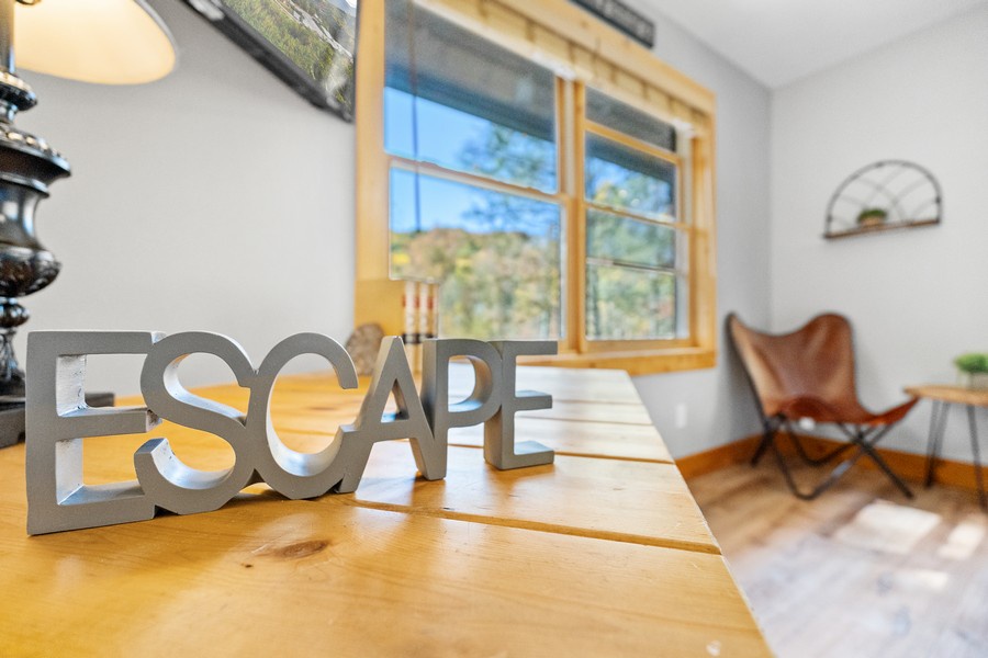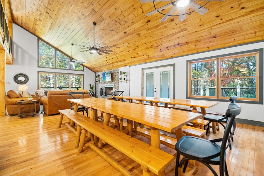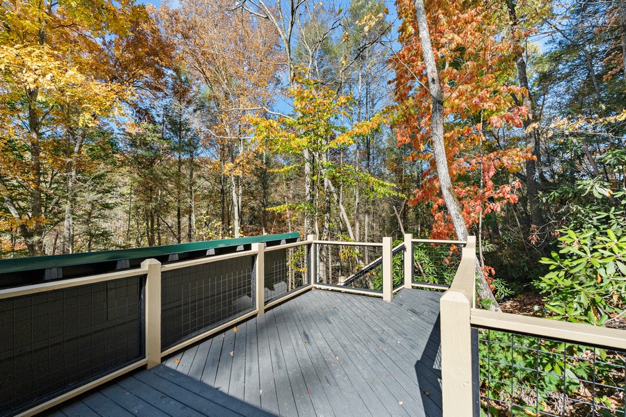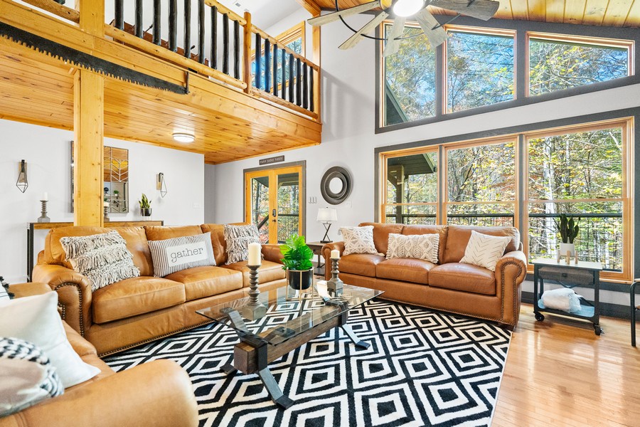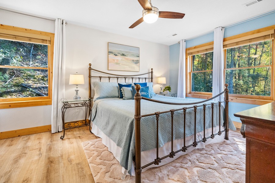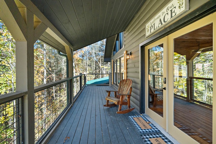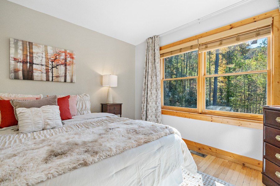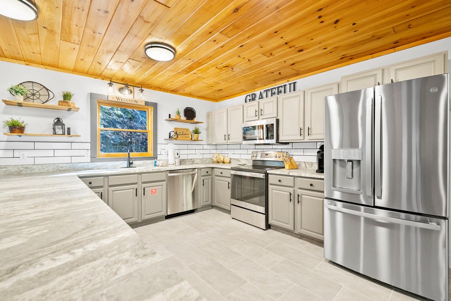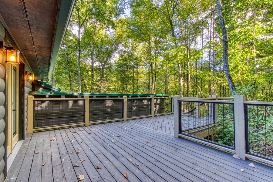 Make your way up the stairs to the middle level to enter this magnificent cabin. The living area features high ceilings, a stone fireplace and tons of natural Tennessee sunlight. With the beautiful living room furniture situated perfectly for family time or cuddling up to enjoy a movie or the gas fireplace. With two large dining tables there is seating for the entire family separated from the kitchen with a generous granite-topped bar with additional seating for four more.