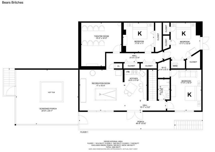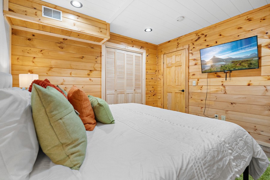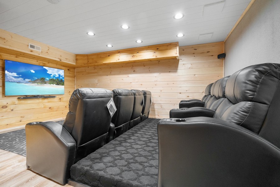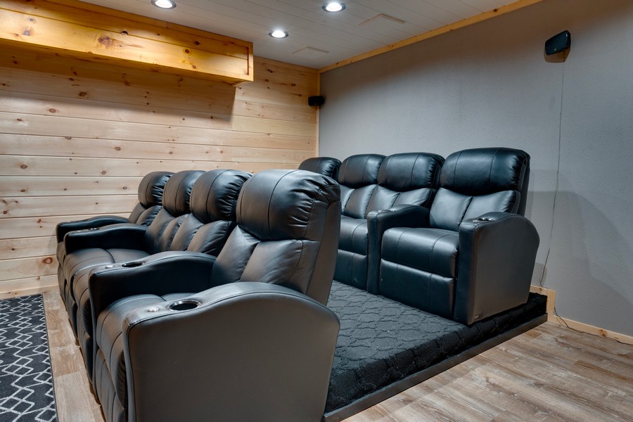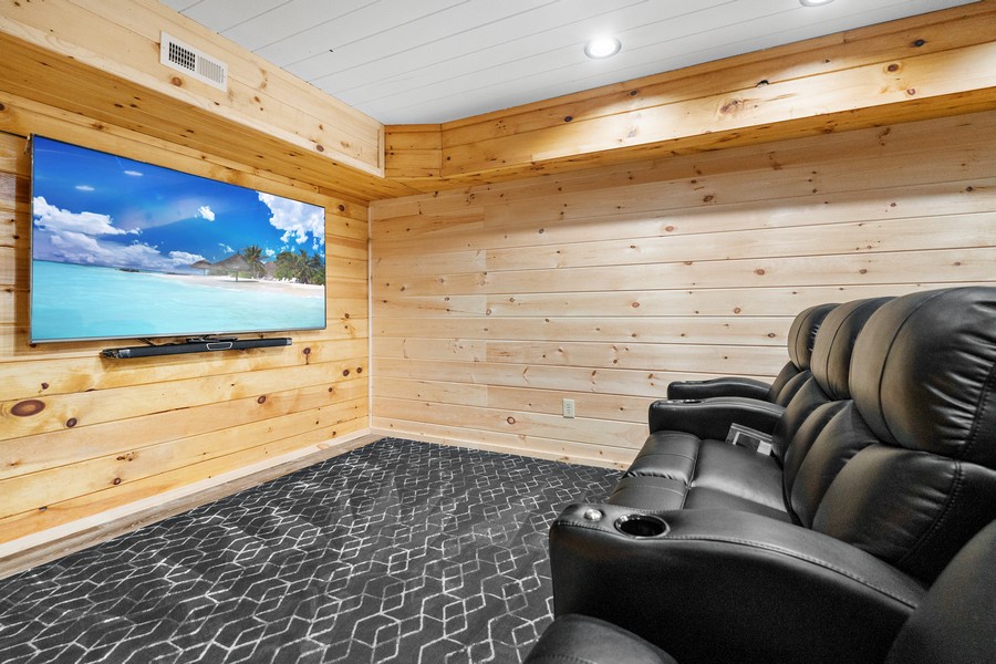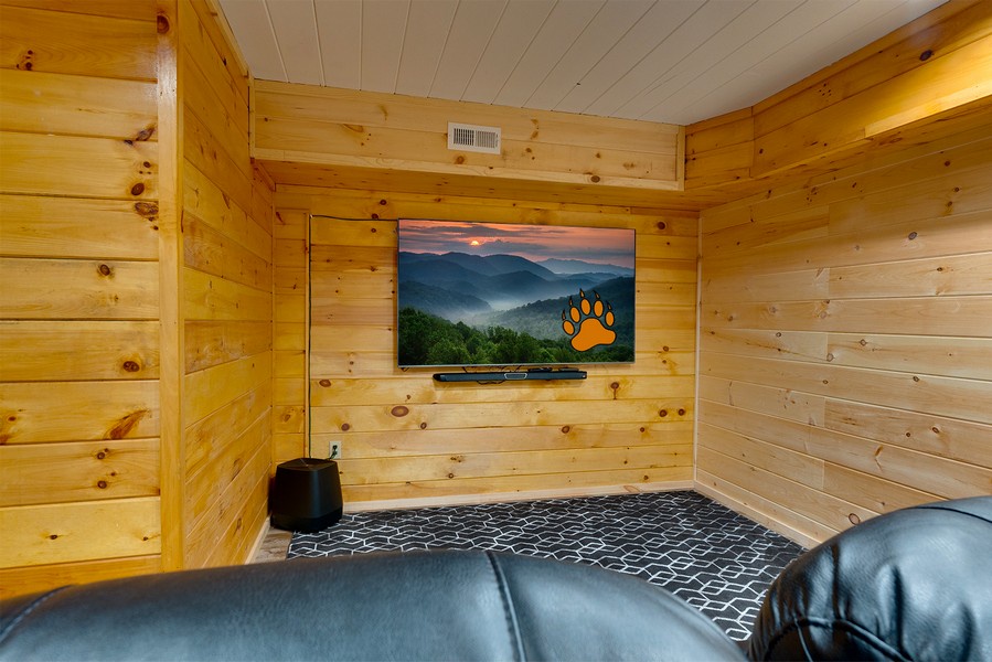 Entering the Lower level which features a game room, complete with a full-size pool table, 2 multicade systems, a shuffle board table and a large HDTV and kitchenette with a full-size refrigerator and stove. Gather the family to enjoy the private theater room just off the gaming area. When you're not exploring the Smoky Mountains enjoy the brand new, top of the line hot tub in the screened in porch. With 3 additional King size bedrooms, one having a Queen sleeper sofa and all having flat screen TVs, there is plenty of space so large groups will have plenty of flexibility to sleep all 18 guests.
