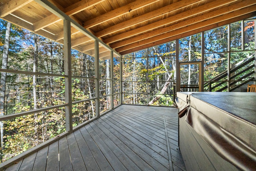 This house is exactly how it is described and we did get a secluded scenery and woods to glance at all around. The cabin was up a long steep hill and able paved parking with a grill and locked garbage disposal cans. The lower level has a hot tub screened in and also deck and patio area. This was a great cabin for our group and very very clean. The jets in the tub were also cleaned marvelously. Floors clean and nicely decorated rooms. Tv all rooms with internet