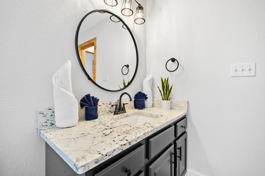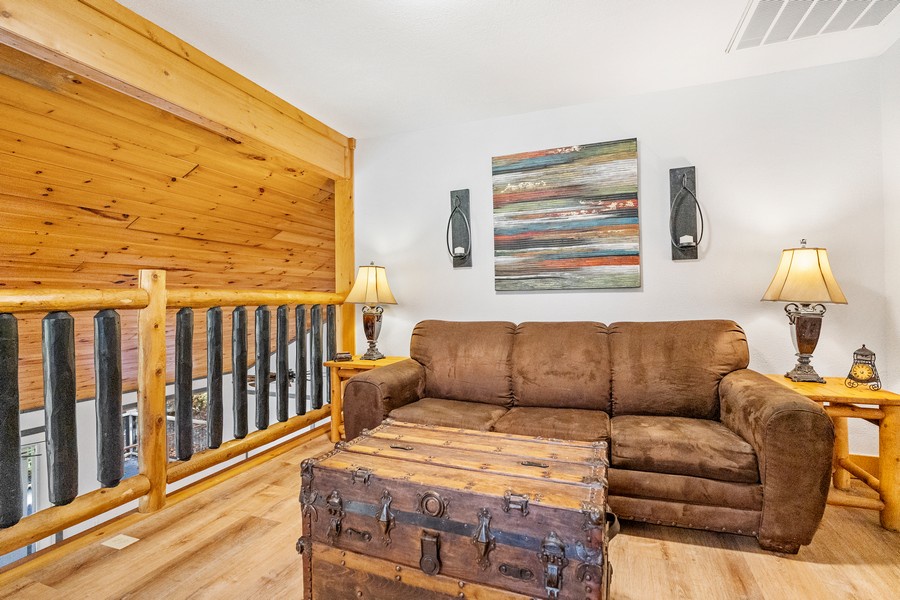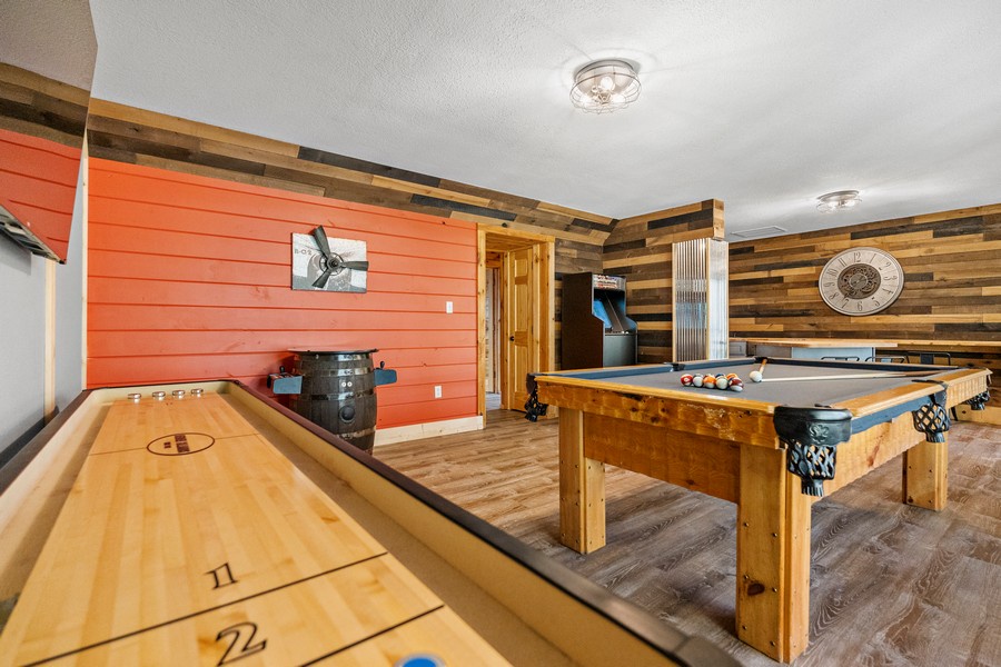 The upper level you will find your first gaming area in the open loft with the living room and dining room below. This gaming area has a dart board and a foosball table for your enjoyment along with a Queen size sleeper sofa. You will find two Cloud like King bedrooms with flat screen tv’s that each have private, ensuite bathrooms complete with a jetted tub in each.