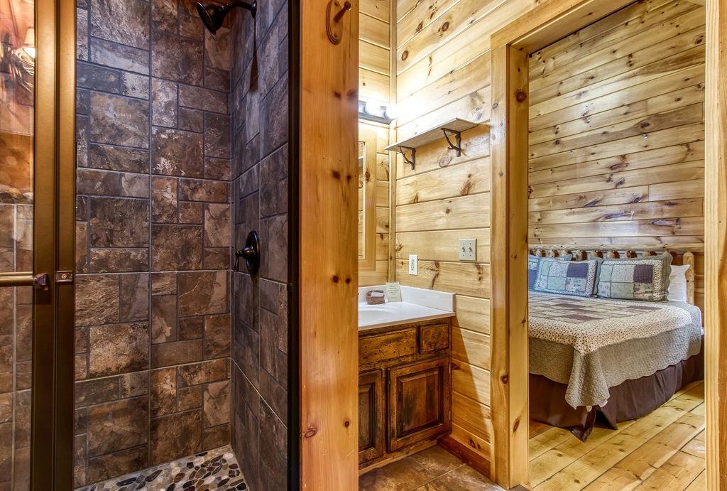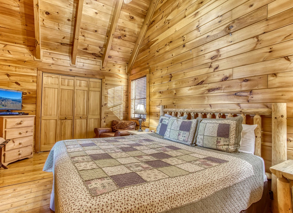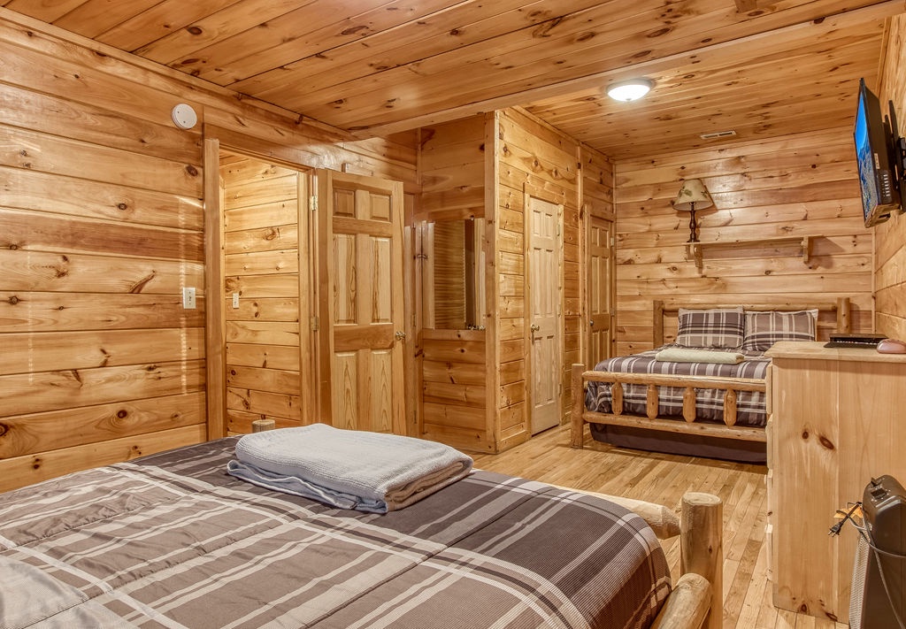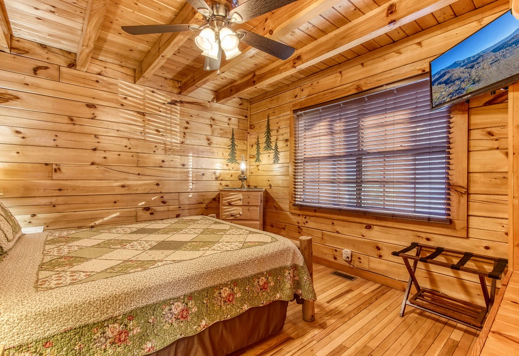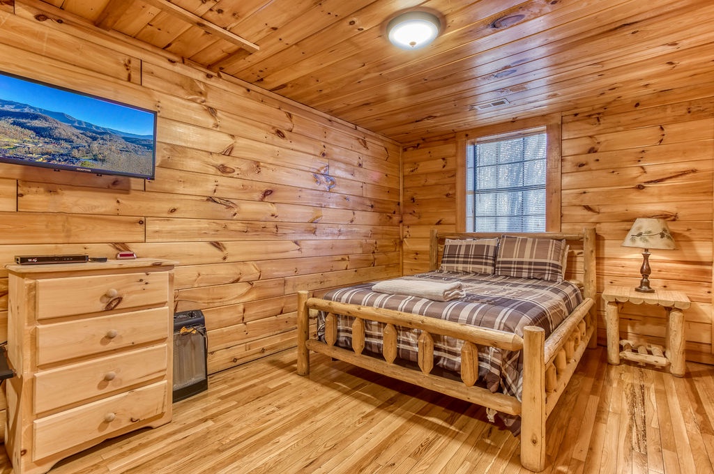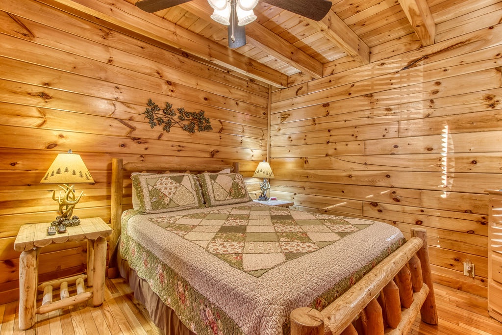 This amazing 4-bedroom, 3-bath Cabin with Wi-Fi, sleeps up to 8 people comfortably. This Cabin is between Pigeon Forge and Wears Valley. Entering you are greeted the fully equipped kitchen and dining area that leads into the living room where you’ll enjoy the stone fireplace and easy access onto the main level deck. The main level covered deck features rocking chairs, a BBQ grill. This is perfect to gather for a night cap or early morning breakfast. The main level also features a bedroom with a super comfy log queen bed and TV.