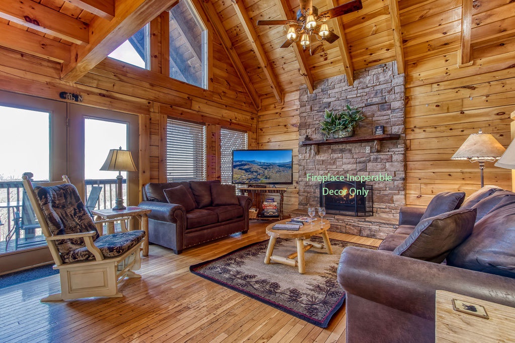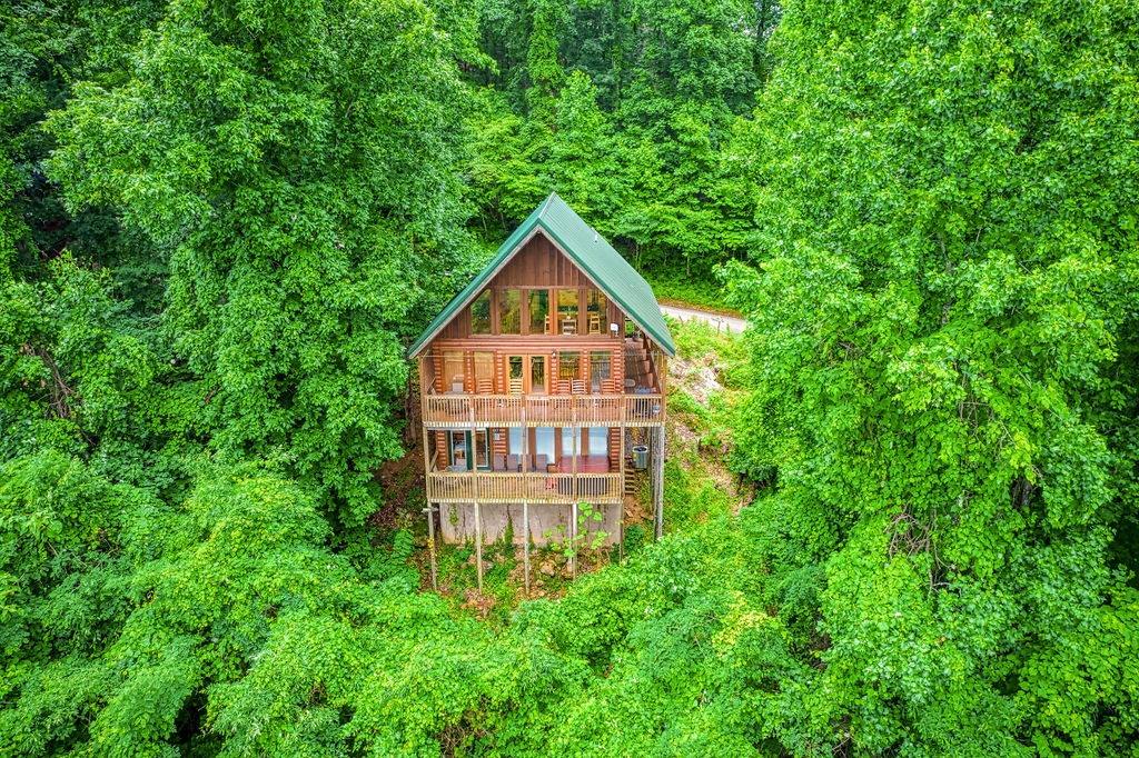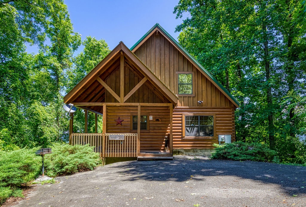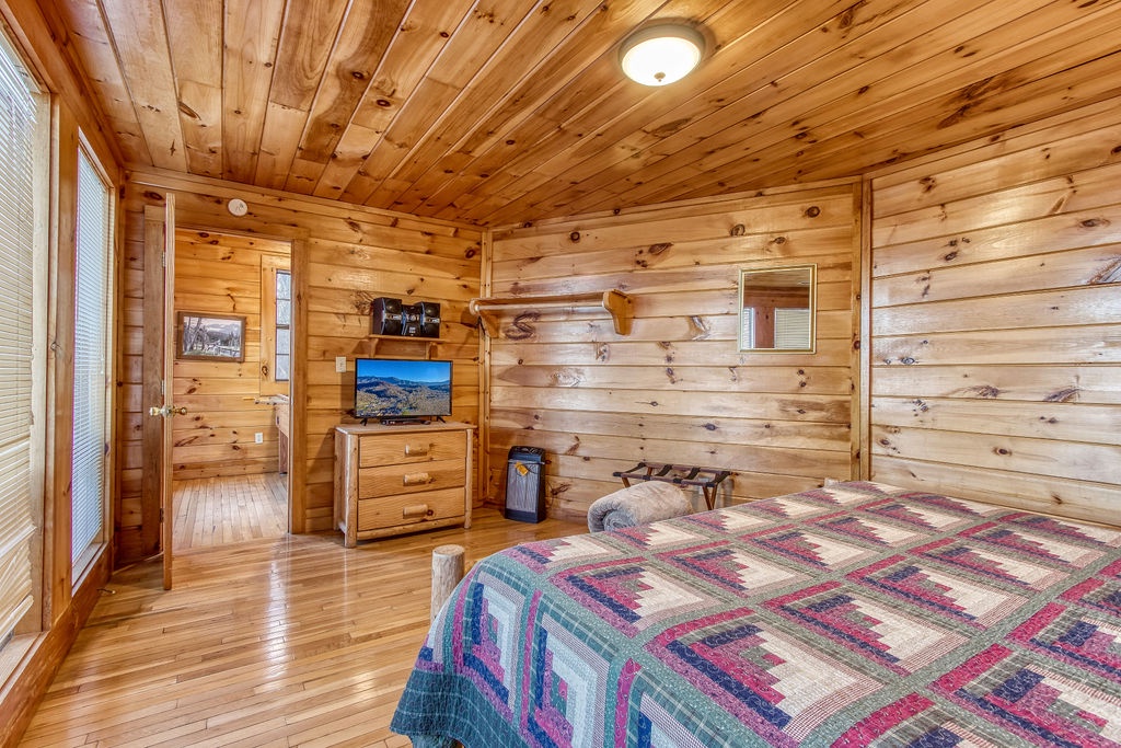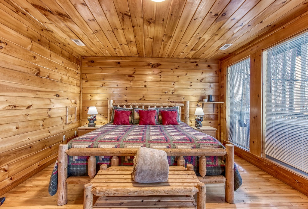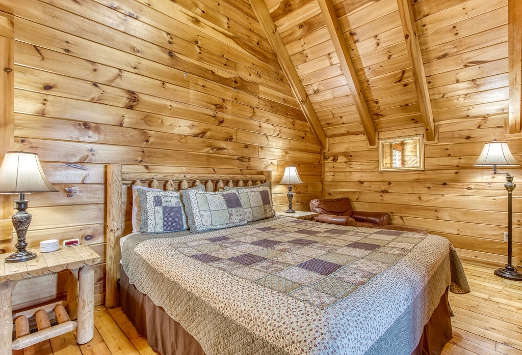 This amazing 4-bedroom, 3-bath Cabin with Wi-Fi, sleeps up to 8 people comfortably. This Cabin is between Pigeon Forge and Wears Valley. Entering you are greeted the fully equipped kitchen and dining area that leads into the living room where you’ll enjoy the stone fireplace and easy access onto the main level deck. The main level covered deck features rocking chairs, a BBQ grill. This is perfect to gather for a night cap or early morning breakfast. The main level also features a bedroom with a super comfy log queen bed and TV.