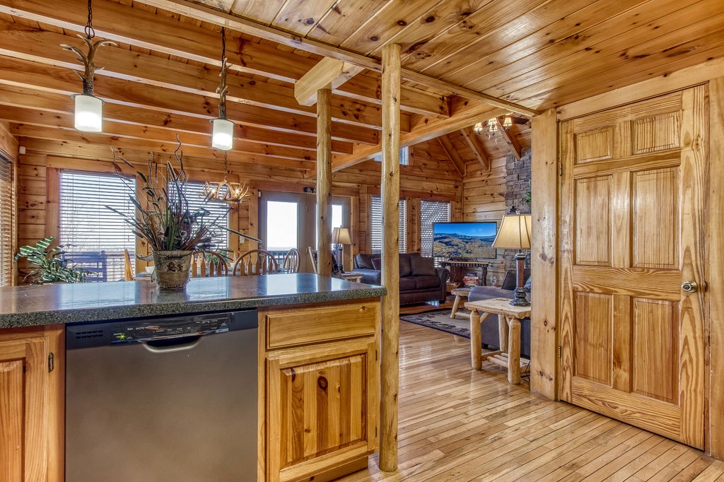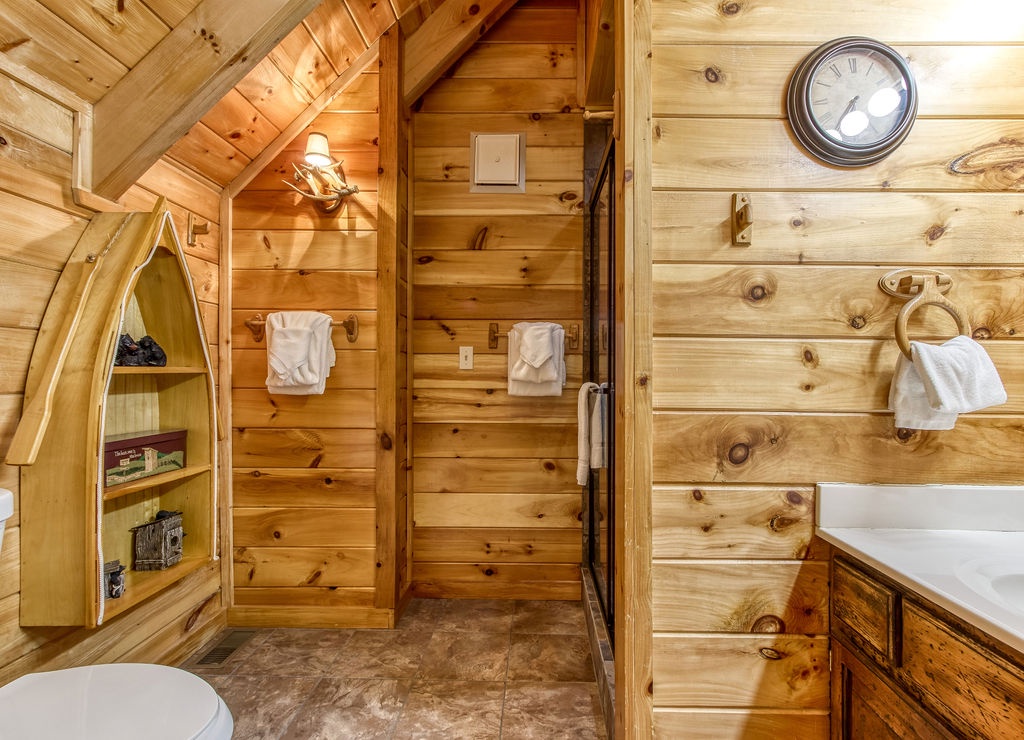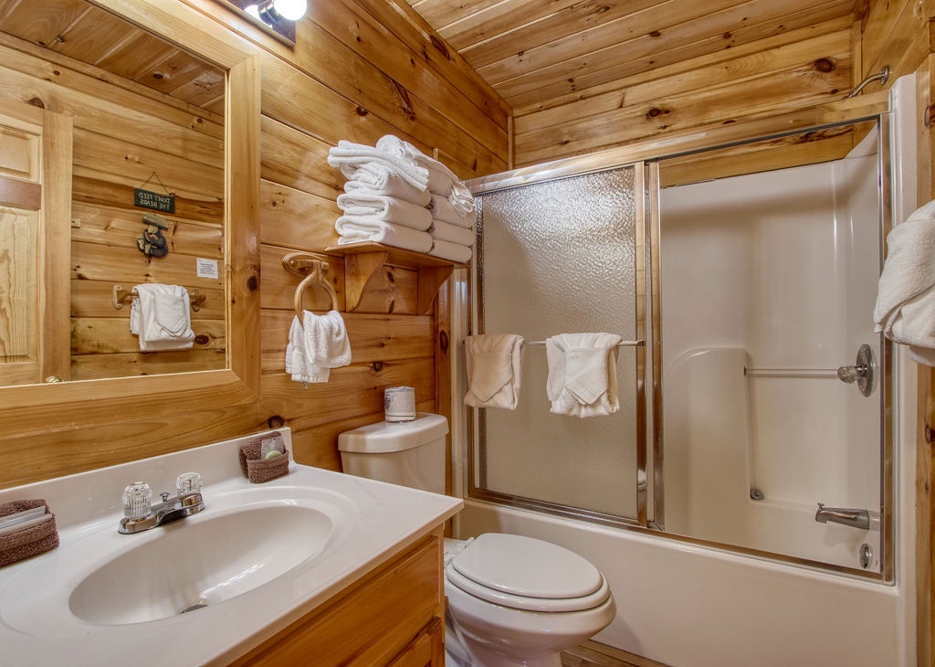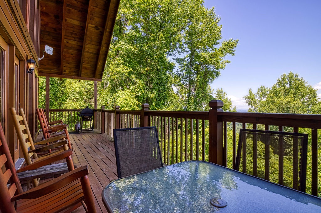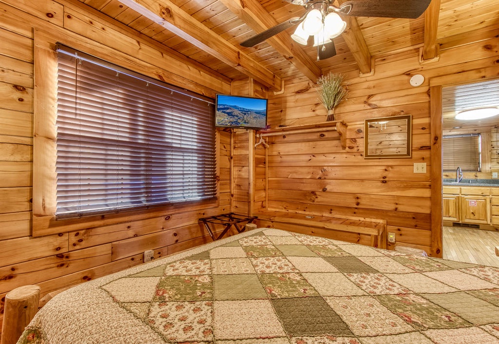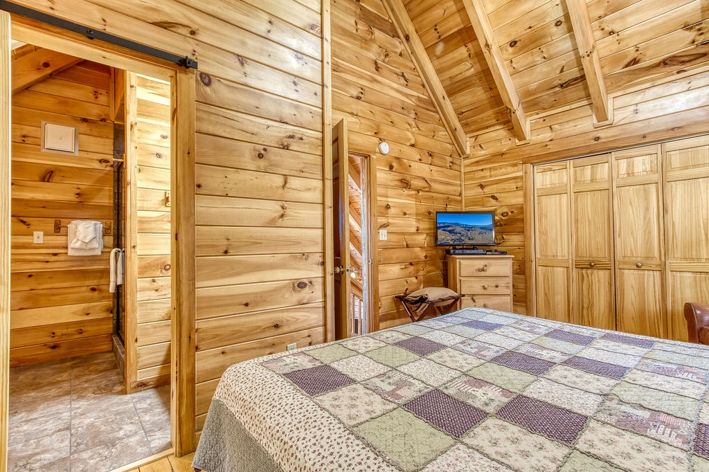 This amazing 4-bedroom, 3-bath Cabin with Wi-Fi, sleeps up to 8 people comfortably. This Cabin is between Pigeon Forge and Wears Valley. Entering you are greeted the fully equipped kitchen and dining area that leads into the living room where you’ll enjoy the stone fireplace and easy access onto the main level deck. The main level covered deck features rocking chairs, a BBQ grill. This is perfect to gather for a night cap or early morning breakfast. The main level also features a bedroom with a super comfy log queen bed and TV.