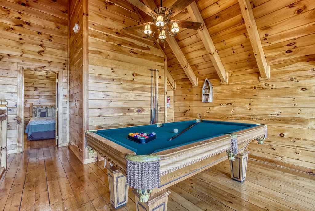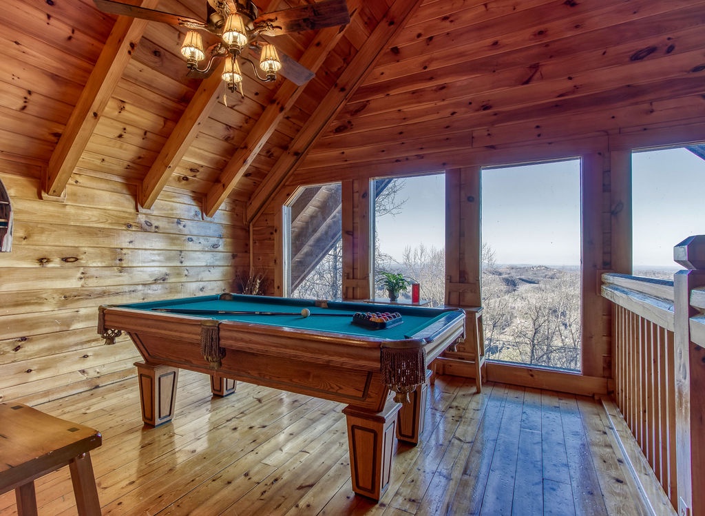 Located on the upper floor is the loft style game room with a pool table and seating. Enjoy the breathtaking views while waiting for your turn in the family pool tournament. Upstairs you’ll also find a spacious Master King bedroom with cathedral ceiling and a full bath.