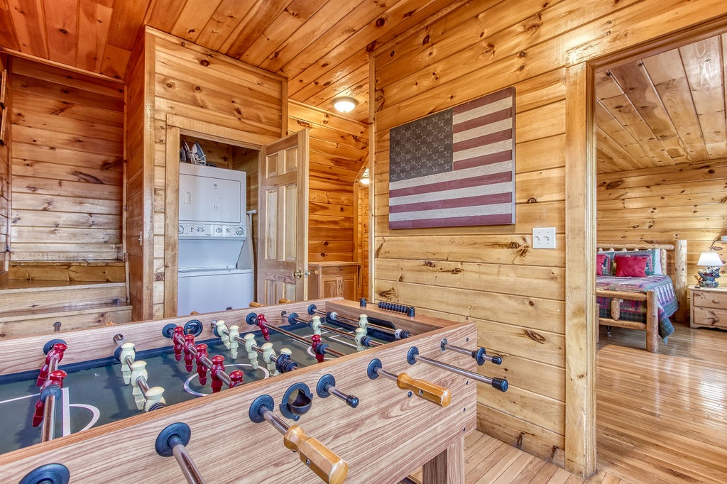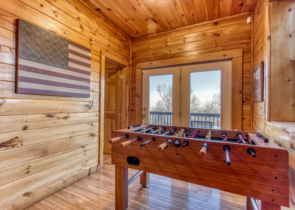 On the lower level and you’ll enter an open landing with a foosball table. Great for the night owls to stay up and play. Just outside this landing is the lower deck and hot tub. There are two more bedrooms down here. One is a beautiful king bedroom with enormous windows that look out into the mountains and the other is two queen beds across the room from each other with natural wood accents all around. There’s an additional full bath located on the lower level for added convenience.