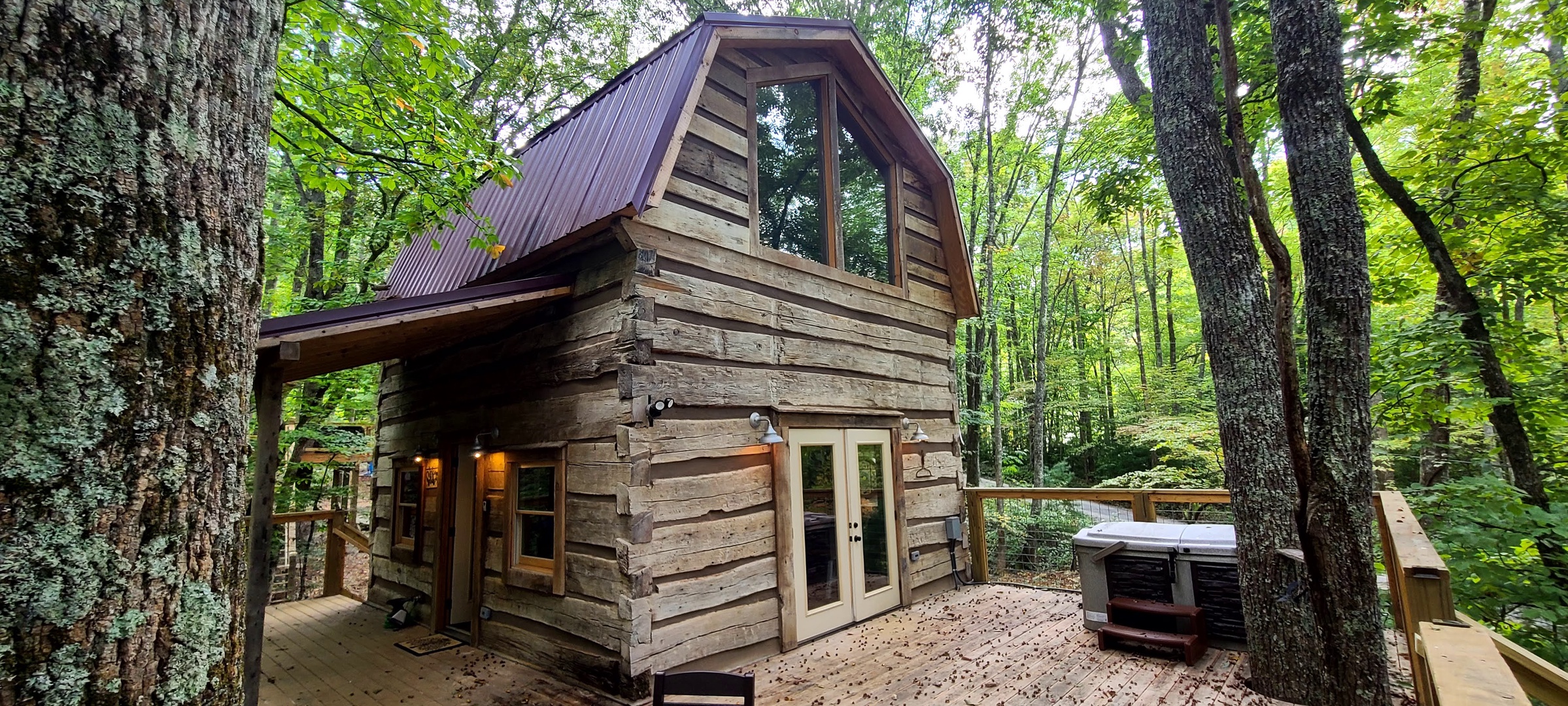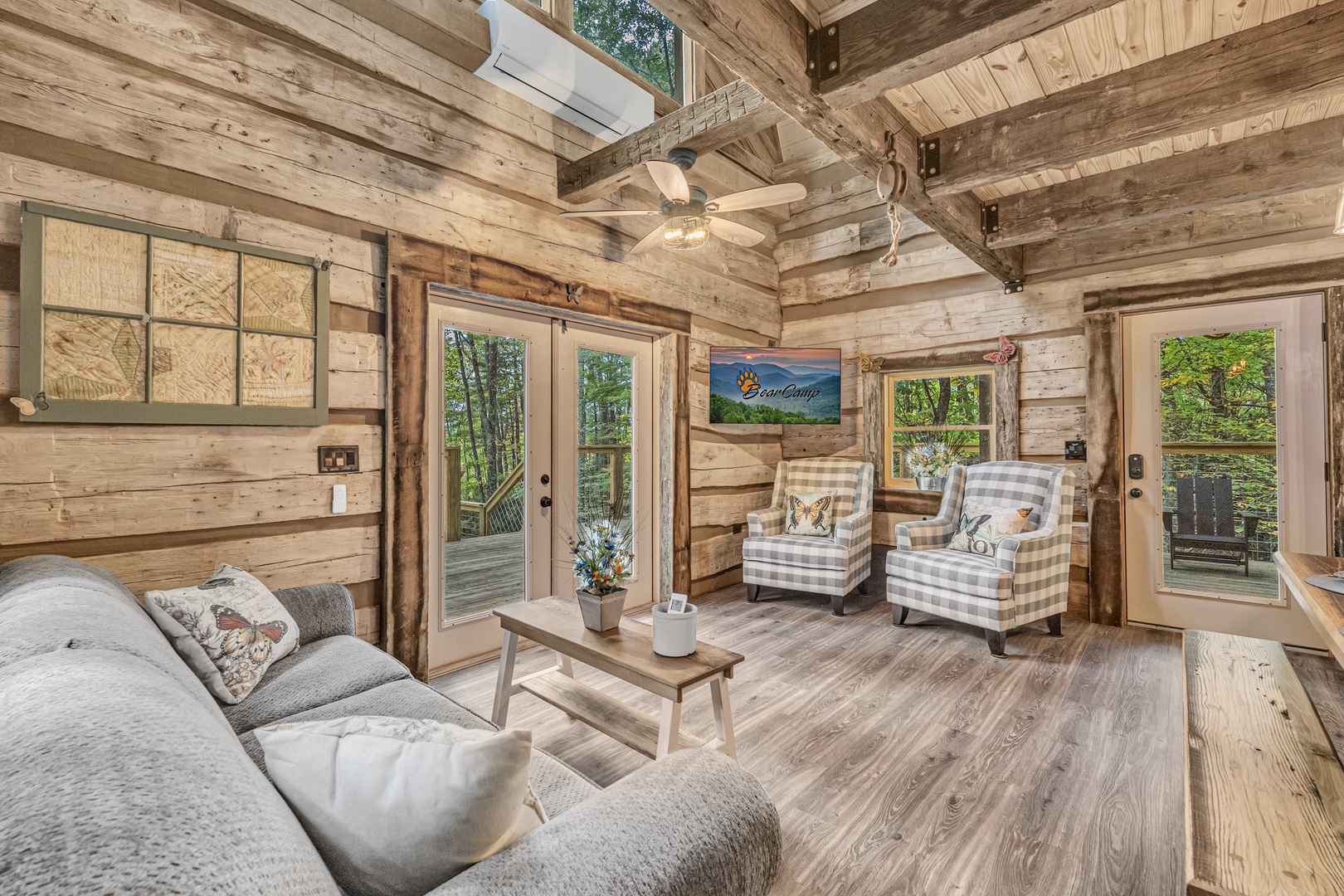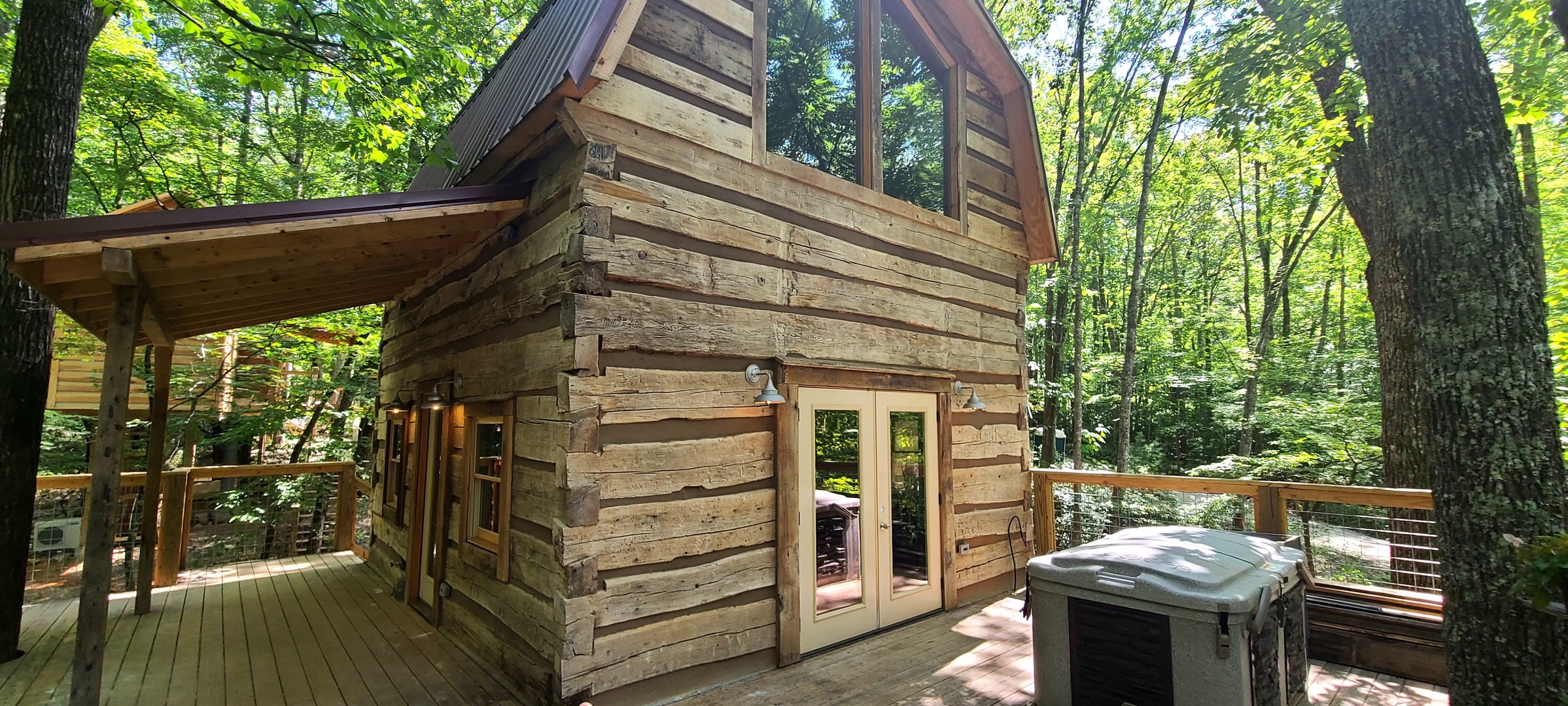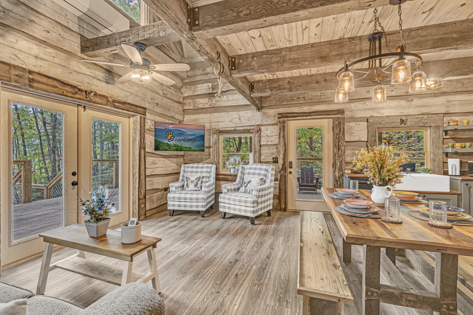 As Seen on Barnwood Builders TV Show) Newly constructed in 2023... Chasing Butterflies is a 2-story treehouse perched over 15 feet among the trees! This treehouse is a repurposed 1850’s log cabin featured on the Barnwood Builders TV show, Season 14, episode 4 – Log Cabin Treehouse. Unlike any treehouse, you will truly step back in time with 18 inch hand-hewn logs that were handmade with an ax some 170 years ago. Let nostalgic memories of your youth come back to life when you stay at the Chasing Butterflies treehouse. This Farmhouse style treehouse has a loft bedroom with oversized windows bringing the outdoor beauty in. Complete with modern amenities, enjoy the calm peaceful view from the huge oversized deck with hot tub and beautiful outdoor furniture to enjoy the Great Smoky Mountains air. The Chasing Butterflies treehouse sits at the base of Cove Mountain in Wears Valley. This open concept 1 bedroom, 1 1/2 bath treehouse sleeps up to 4 people comfortably and is full of amenities. In addition to a queen bed and sofa bed, it offers a full-size bathroom; shower, ½ bath, kitchen, living room, dining area, hot tub, and a huge outdoor deck. Regardless of the season, relax in the air-conditioned or heated treehouse after your day’s activities. The kitchen has a range, refrigerator, and combo convection/microwave oven. Enjoy your favorite show on the 55 inch big screen smart-TV or use the free WI-FI. When you arrive at Chasing Butterflies, you will experience a treehouse cabin unlike anything you have seen. From old logs, iron and delightful butterfly decor, modern lighting, and a large deck. You access Chasing Butterflies via the set of stairs (30 steps) with catwalks or a service set of stairs. The outside deck is over 400 square feet and provides ample outdoor seating and viewing areas which overlooks a seasonal creek. Use the decks to sit and relax, dine outside, or sit in the 2-person hot tub and take in the fresh mountain air. If you’re lucky, you may even see a Black Bear (which you are not allowed to feed) At night, Chasing Butterflies transforms into a nightly light display with outdoor lights and possibly a few butterflies.