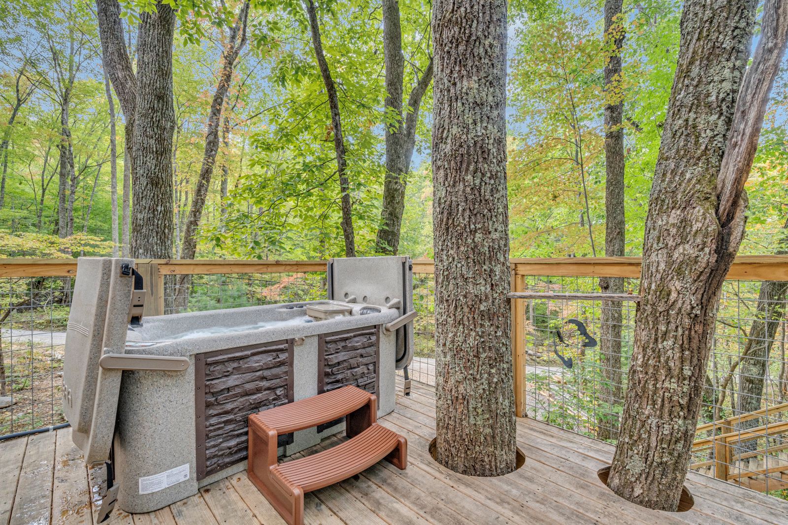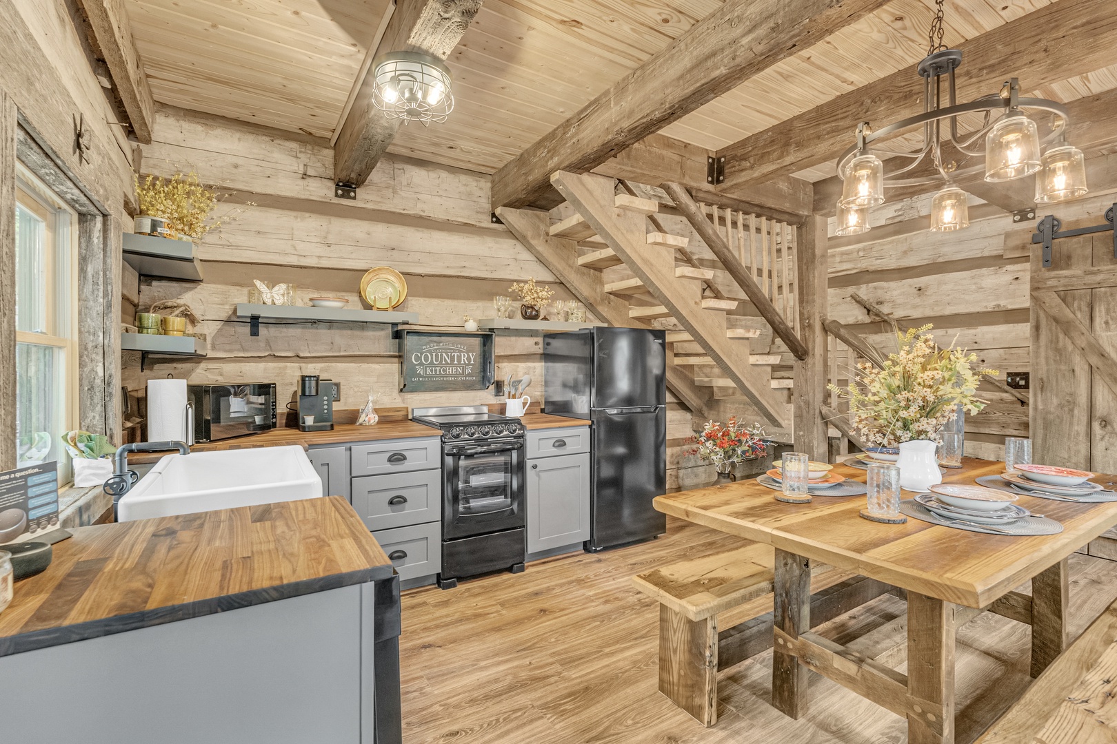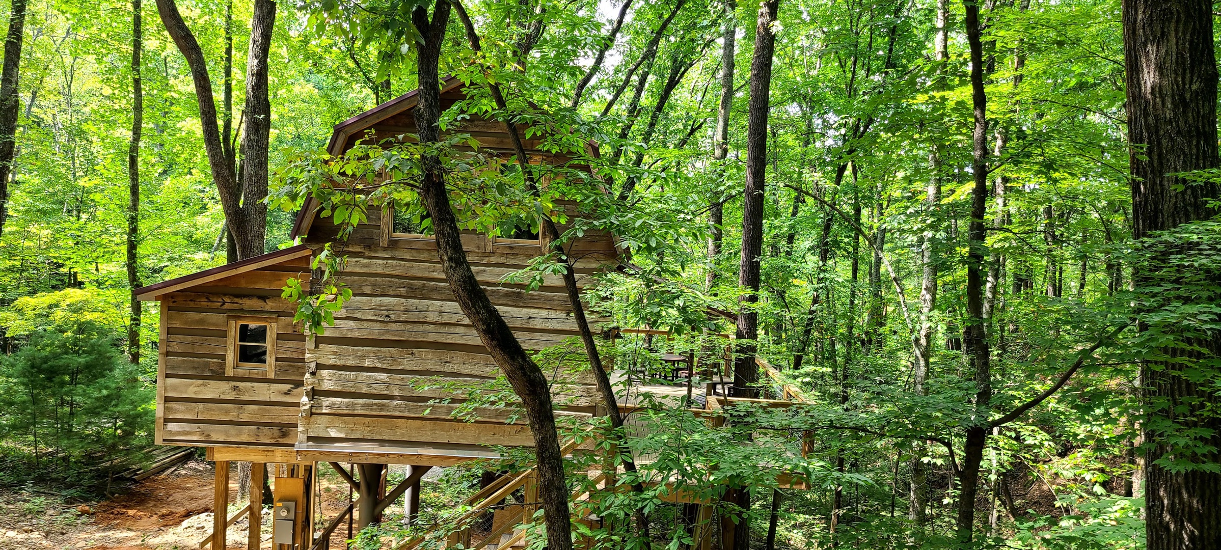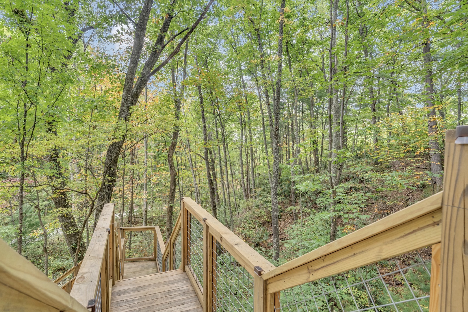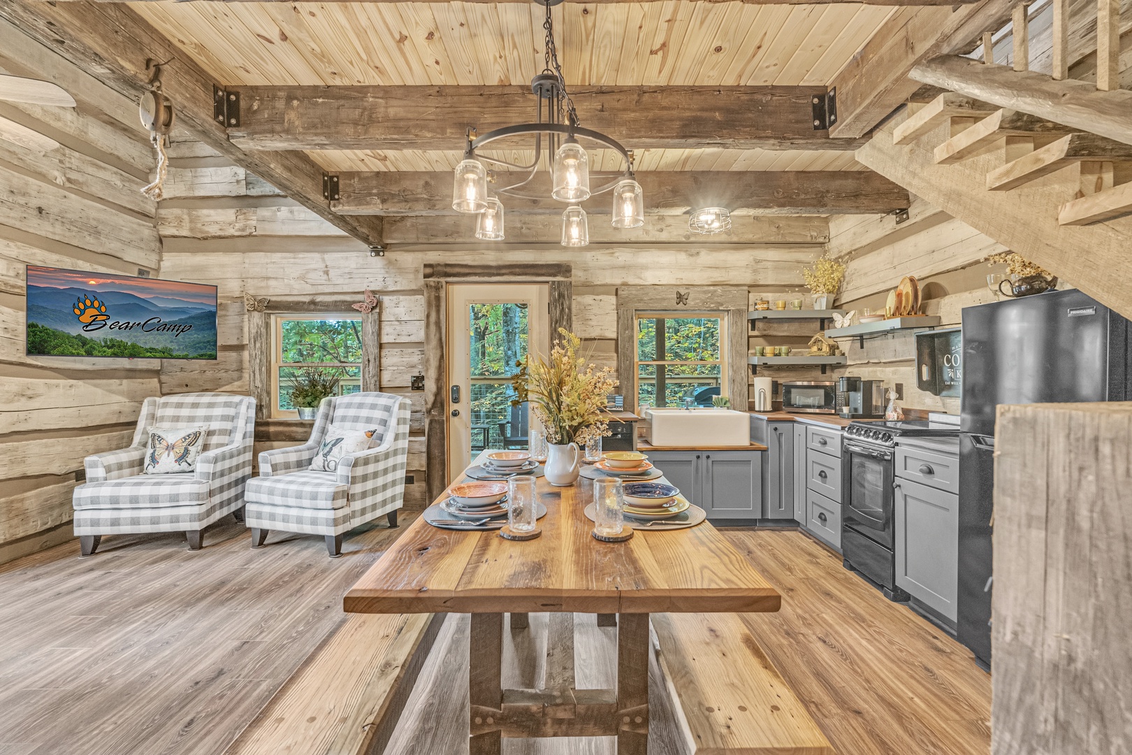 As Seen on Barnwood Builders TV Show) Newly constructed in 2023... Chasing Butterflies is a 2-story treehouse perched over 15 feet among the trees! This treehouse is a repurposed 1850’s log cabin featured on the Barnwood Builders TV show, Season 14, episode 4 – Log Cabin Treehouse. Unlike any treehouse, you will truly step back in time with 18 inch hand-hewn logs that were handmade with an ax some 170 years ago. Let nostalgic memories of your youth come back to life when you stay at the Chasing Butterflies treehouse. This Farmhouse style treehouse has a loft bedroom with oversized windows bringing the outdoor beauty in. Complete with modern amenities, enjoy the calm peaceful view from the huge oversized deck with hot tub and beautiful outdoor furniture to enjoy the Great Smoky Mountains air. The Chasing Butterflies treehouse sits at the base of Cove Mountain in Wears Valley. This open concept 1 bedroom, 1 1/2 bath treehouse sleeps up to 4 people comfortably and is full of amenities. In addition to a queen bed and sofa bed, it offers a full-size bathroom; shower, ½ bath, kitchen, living room, dining area, hot tub, and a huge outdoor deck. Regardless of the season, relax in the air-conditioned or heated treehouse after your day’s activities. The kitchen has a range, refrigerator, and combo convection/microwave oven. Enjoy your favorite show on the 55 inch big screen smart-TV or use the free WI-FI. When you arrive at Chasing Butterflies, you will experience a treehouse cabin unlike anything you have seen. From old logs, iron and delightful butterfly decor, modern lighting, and a large deck. You access Chasing Butterflies via the set of stairs (30 steps) with catwalks or a service set of stairs. The outside deck is over 400 square feet and provides ample outdoor seating and viewing areas which overlooks a seasonal creek. Use the decks to sit and relax, dine outside, or sit in the 2-person hot tub and take in the fresh mountain air. If you’re lucky, you may even see a Black Bear (which you are not allowed to feed) At night, Chasing Butterflies transforms into a nightly light display with outdoor lights and possibly a few butterflies.