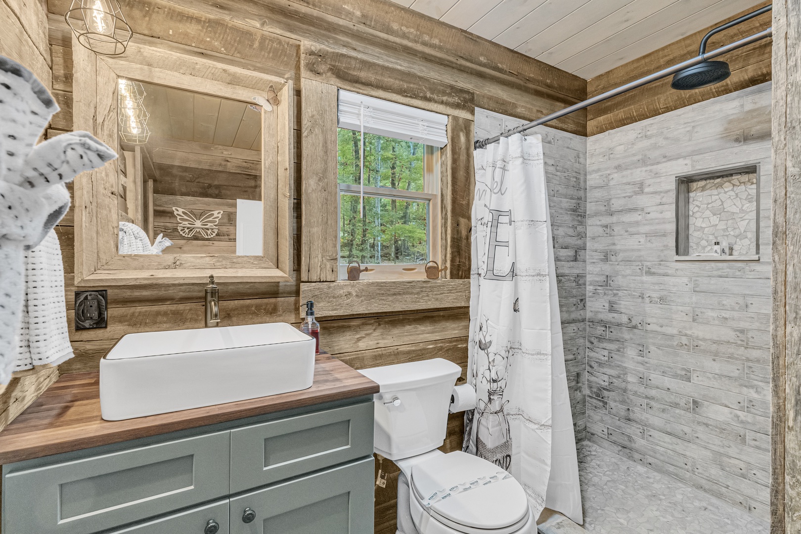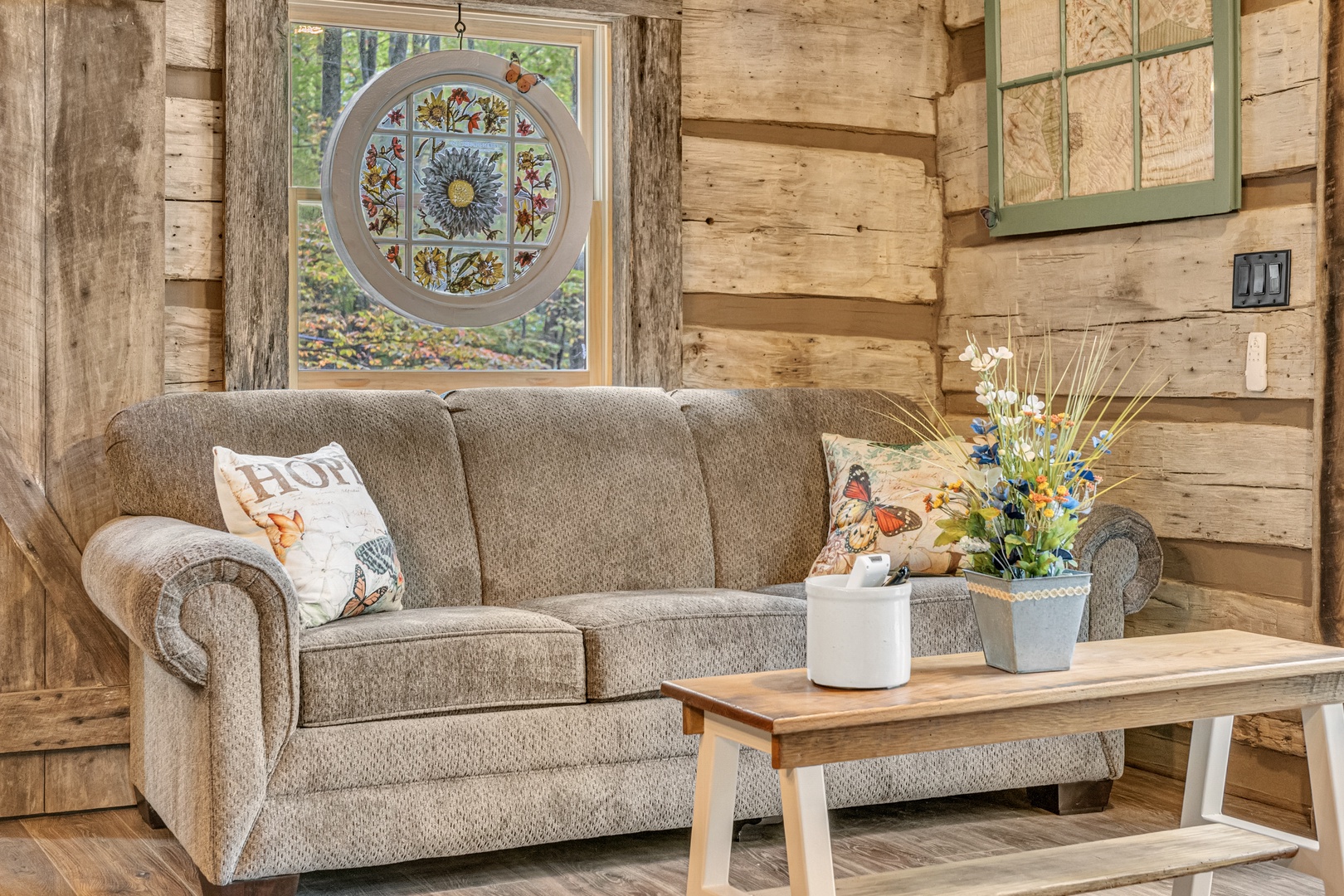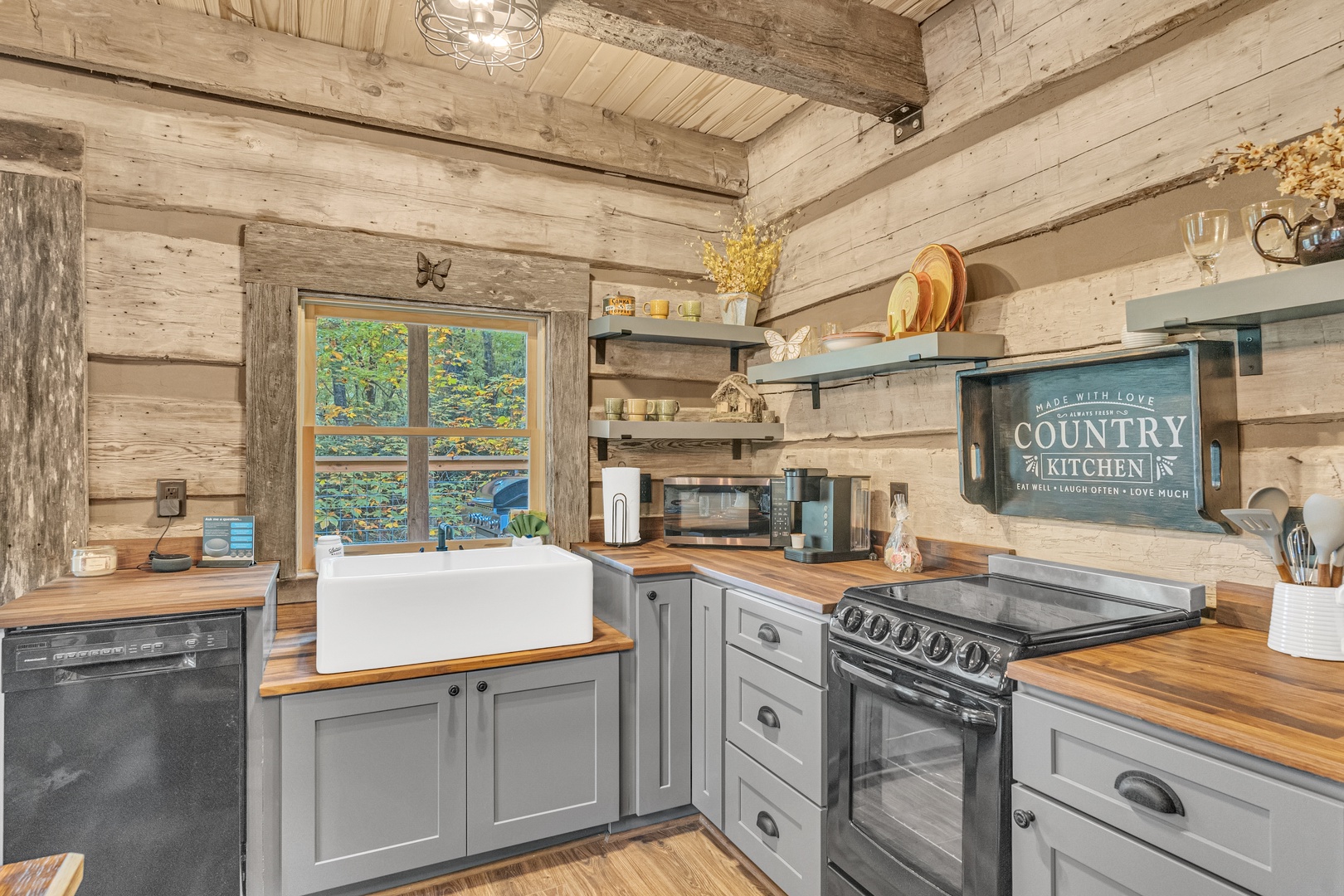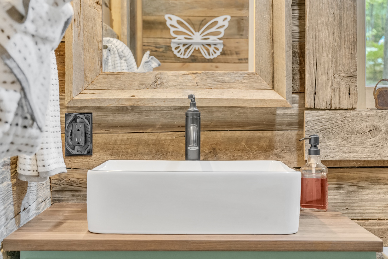 As Seen on Barnwood Builders TV Show) Newly constructed in 2023... Chasing Butterflies is a 2-story treehouse perched over 15 feet among the trees! This treehouse is a repurposed 1850’s log cabin featured on the Barnwood Builders TV show, Season 14, episode 4 – Log Cabin Treehouse. Unlike any treehouse, you will truly step back in time with 18 inch hand-hewn logs that were handmade with an ax some 170 years ago. Let nostalgic memories of your youth come back to life when you stay at the Chasing Butterflies treehouse. This Farmhouse style treehouse has a loft bedroom with oversized windows bringing the outdoor beauty in. Complete with modern amenities, enjoy the calm peaceful view from the huge oversized deck with hot tub and beautiful outdoor furniture to enjoy the Great Smoky Mountains air. The Chasing Butterflies treehouse sits at the base of Cove Mountain in Wears Valley. This open concept 1 bedroom, 1 1/2 bath treehouse sleeps up to 4 people comfortably and is full of amenities. In addition to a queen bed and sofa bed, it offers a full-size bathroom; shower, ½ bath, kitchen, living room, dining area, hot tub, and a huge outdoor deck. Regardless of the season, relax in the air-conditioned or heated treehouse after your day’s activities. The kitchen has a range, refrigerator, and combo convection/microwave oven. Enjoy your favorite show on the 55 inch big screen smart-TV or use the free WI-FI. When you arrive at Chasing Butterflies, you will experience a treehouse cabin unlike anything you have seen. From old logs, iron and delightful butterfly decor, modern lighting, and a large deck. You access Chasing Butterflies via the set of stairs (30 steps) with catwalks or a service set of stairs. The outside deck is over 400 square feet and provides ample outdoor seating and viewing areas which overlooks a seasonal creek. Use the decks to sit and relax, dine outside, or sit in the 2-person hot tub and take in the fresh mountain air. If you’re lucky, you may even see a Black Bear (which you are not allowed to feed) At night, Chasing Butterflies transforms into a nightly light display with outdoor lights and possibly a few butterflies.