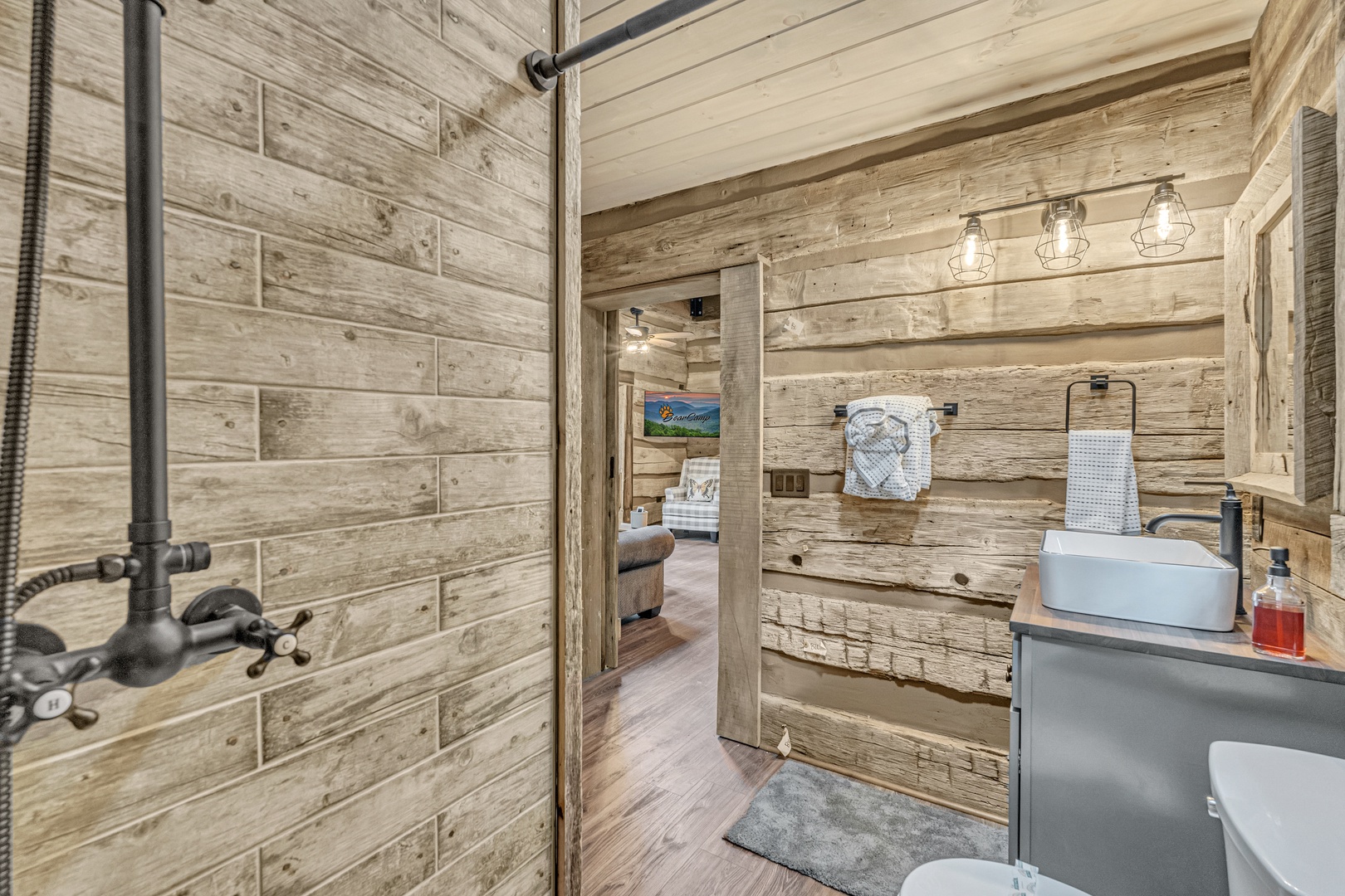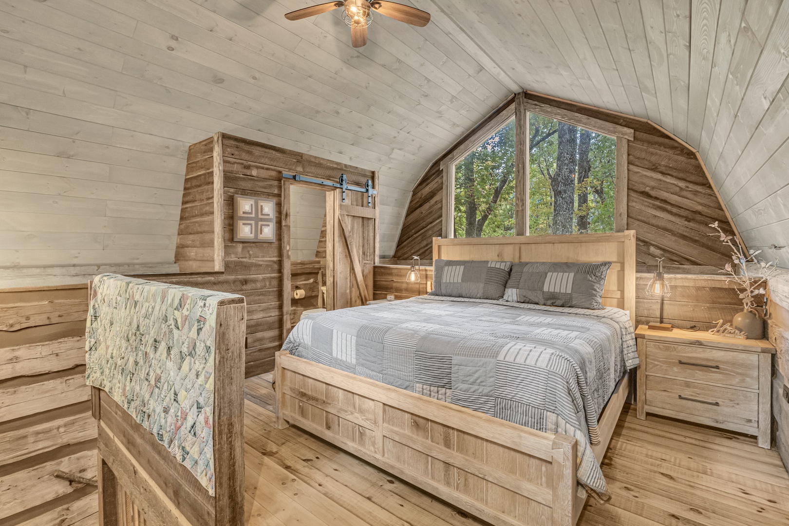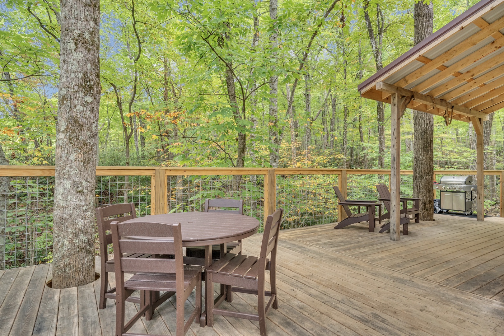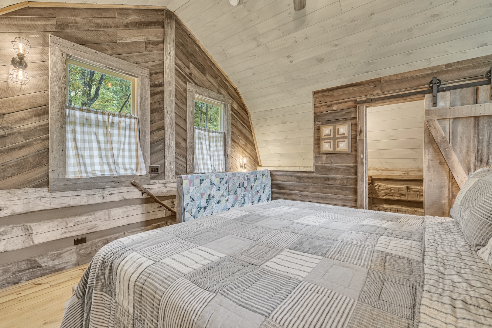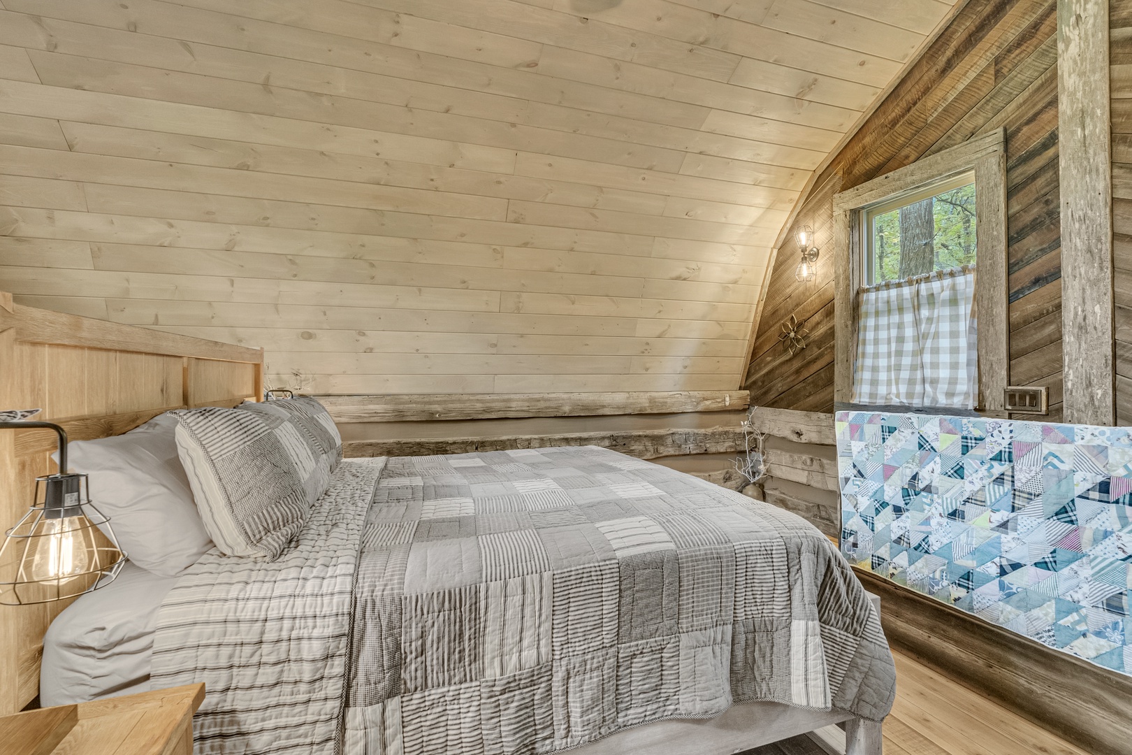 As Seen on Barnwood Builders TV Show) Newly constructed in 2023... Chasing Butterflies is a 2-story treehouse perched over 15 feet among the trees! This treehouse is a repurposed 1850’s log cabin featured on the Barnwood Builders TV show, Season 14, episode 4 – Log Cabin Treehouse. Unlike any treehouse, you will truly step back in time with 18 inch hand-hewn logs that were handmade with an ax some 170 years ago. Let nostalgic memories of your youth come back to life when you stay at the Chasing Butterflies treehouse. This Farmhouse style treehouse has a loft bedroom with oversized windows bringing the outdoor beauty in. Complete with modern amenities, enjoy the calm peaceful view from the huge oversized deck with hot tub and beautiful outdoor furniture to enjoy the Great Smoky Mountains air. The Chasing Butterflies treehouse sits at the base of Cove Mountain in Wears Valley. This open concept 1 bedroom, 1 1/2 bath treehouse sleeps up to 4 people comfortably and is full of amenities. In addition to a queen bed and sofa bed, it offers a full-size bathroom; shower, ½ bath, kitchen, living room, dining area, hot tub, and a huge outdoor deck. Regardless of the season, relax in the air-conditioned or heated treehouse after your day’s activities. The kitchen has a range, refrigerator, and combo convection/microwave oven. Enjoy your favorite show on the 55 inch big screen smart-TV or use the free WI-FI. When you arrive at Chasing Butterflies, you will experience a treehouse cabin unlike anything you have seen. From old logs, iron and delightful butterfly decor, modern lighting, and a large deck. You access Chasing Butterflies via the set of stairs (30 steps) with catwalks or a service set of stairs. The outside deck is over 400 square feet and provides ample outdoor seating and viewing areas which overlooks a seasonal creek. Use the decks to sit and relax, dine outside, or sit in the 2-person hot tub and take in the fresh mountain air. If you’re lucky, you may even see a Black Bear (which you are not allowed to feed) At night, Chasing Butterflies transforms into a nightly light display with outdoor lights and possibly a few butterflies.