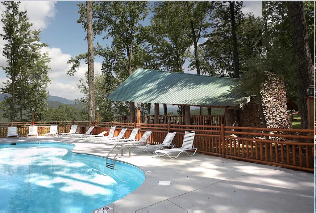 Making the final approach to the cabin you will notice the beautiful pool/play area complete with wide open spaces to run and play and an amazing pool open during season. This will give the kiddos something to be excited over. WOW! There is also a gazebo and recreation lodge where weddings are performed almost on a weekly basis. You will be incredibly happy to know that the pool is just 1 turn away from the house.