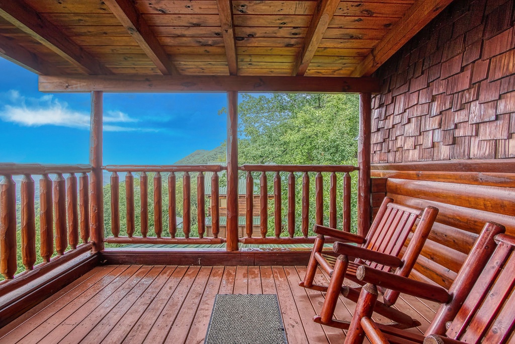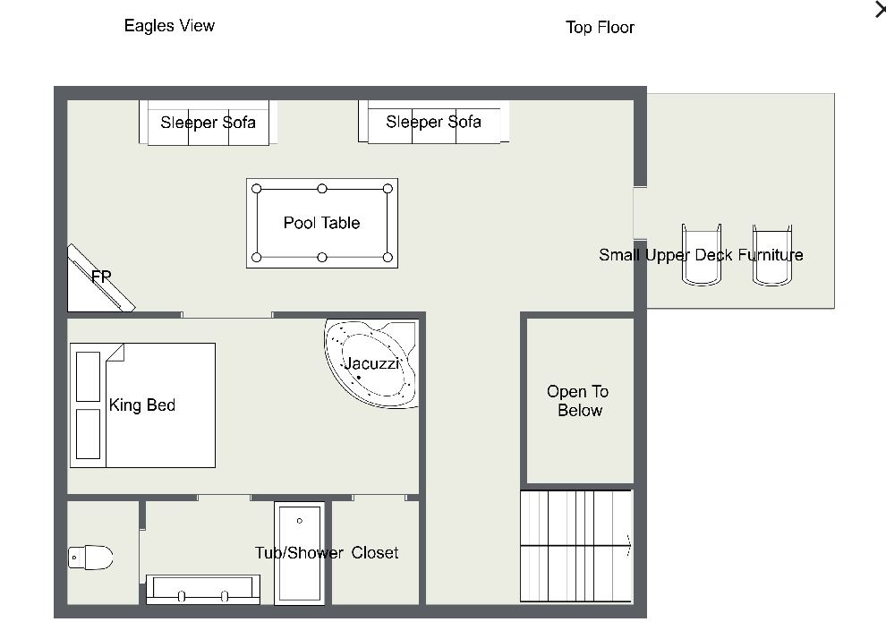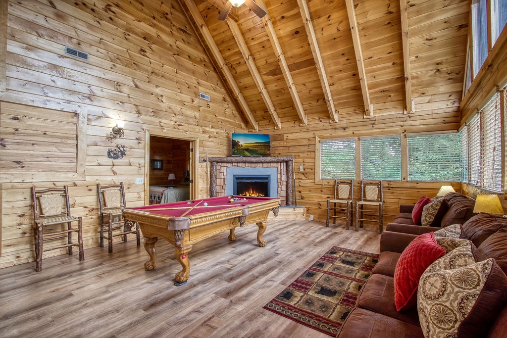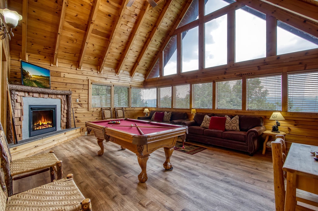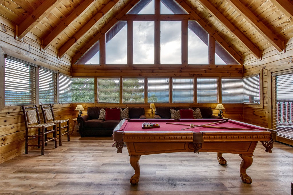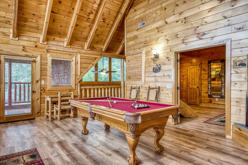 When ready to turn in just walk up the staircase while will still enjoying beautiful views from basically every window. At the top of the staircase, you will see the billiard room which is complete with another sitting area, pool table, and additional sleeping accommodations. Upstairs you will find intimate balcony perfect for winding down after a long drive or a day around town.