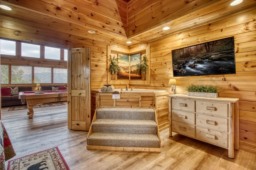 Proceed thru the billiard room through the double doors and you are going to enter the incredibly large master bedroom complete with whirlpool tub. The best thing about this tub is it has privacy wood slats that when opened have a beautiful view of the Smokies while you soak your cares away.