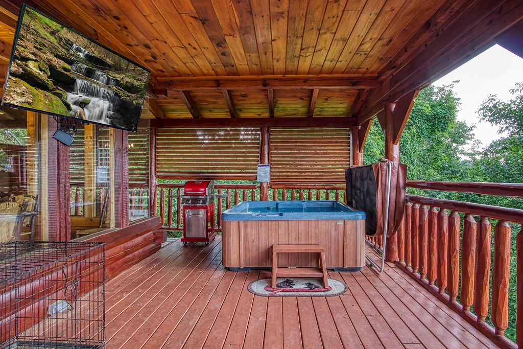 On the main level you will enjoy ample space for your family with large living room with 2 story ceiling, dining room, and large kitchen with updated appliances. or choose the spacious, wrap-around porch that offers plenty of seating from rocking chairs to porch swings, a hot tub to relax the mind as well as the muscles, a flat screen TV that you can watch while soaking and a gas grill for the family Grill Master to give the Family Chef a brake or if it is those people are one in the same they have everything they need to switch back and forth.