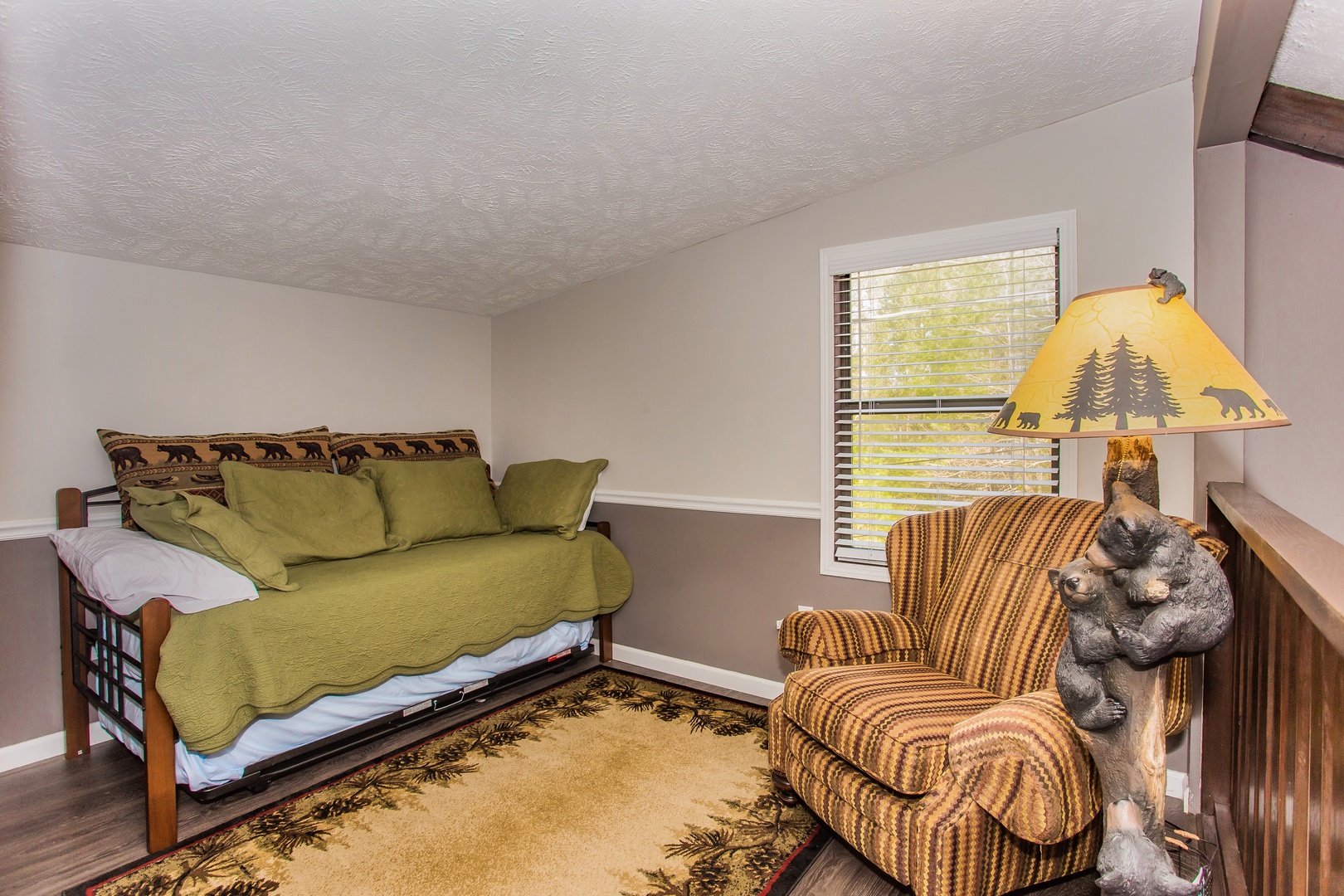 In the upper level, you will find another beautiful Queen size bedroom with a Flat screen TV (Wi-Fi only) and in the loft area, you will have a twin day bed with a trundle and a comfy chair to unwind and catch up on a good book. There is also a full bathroom with a walk-shower only these rooms will share.