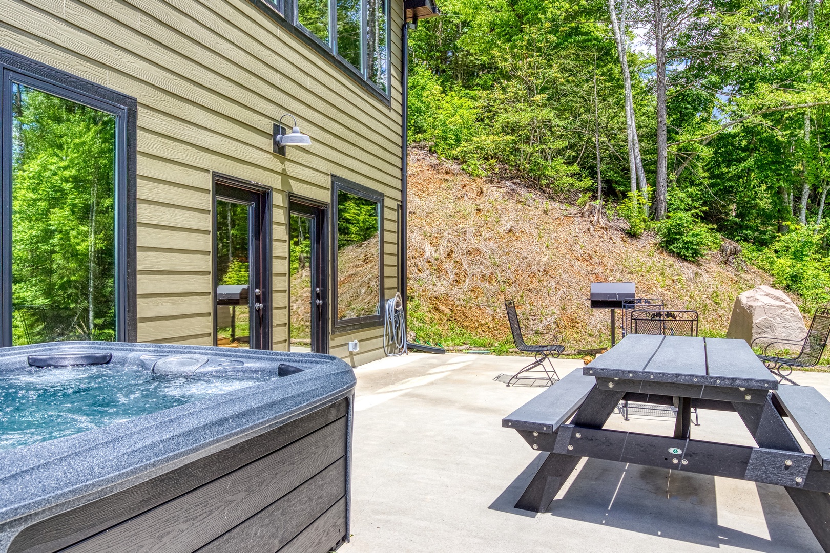 The cabin has a beautiful view with the back wall lined in windows. First floor included a large couch, dining area and spacious kitchen. The two bedrooms are downstairs, each with a private bathroom (one does have a tub). Outside included a firepit, picnic bench and nice sized hot tub. Beware of the stairs when entering - they are DIRECTLY in front of the front door about 3 feet in! Customer service was great when we called with needs. We had a great time and would use this company again.
