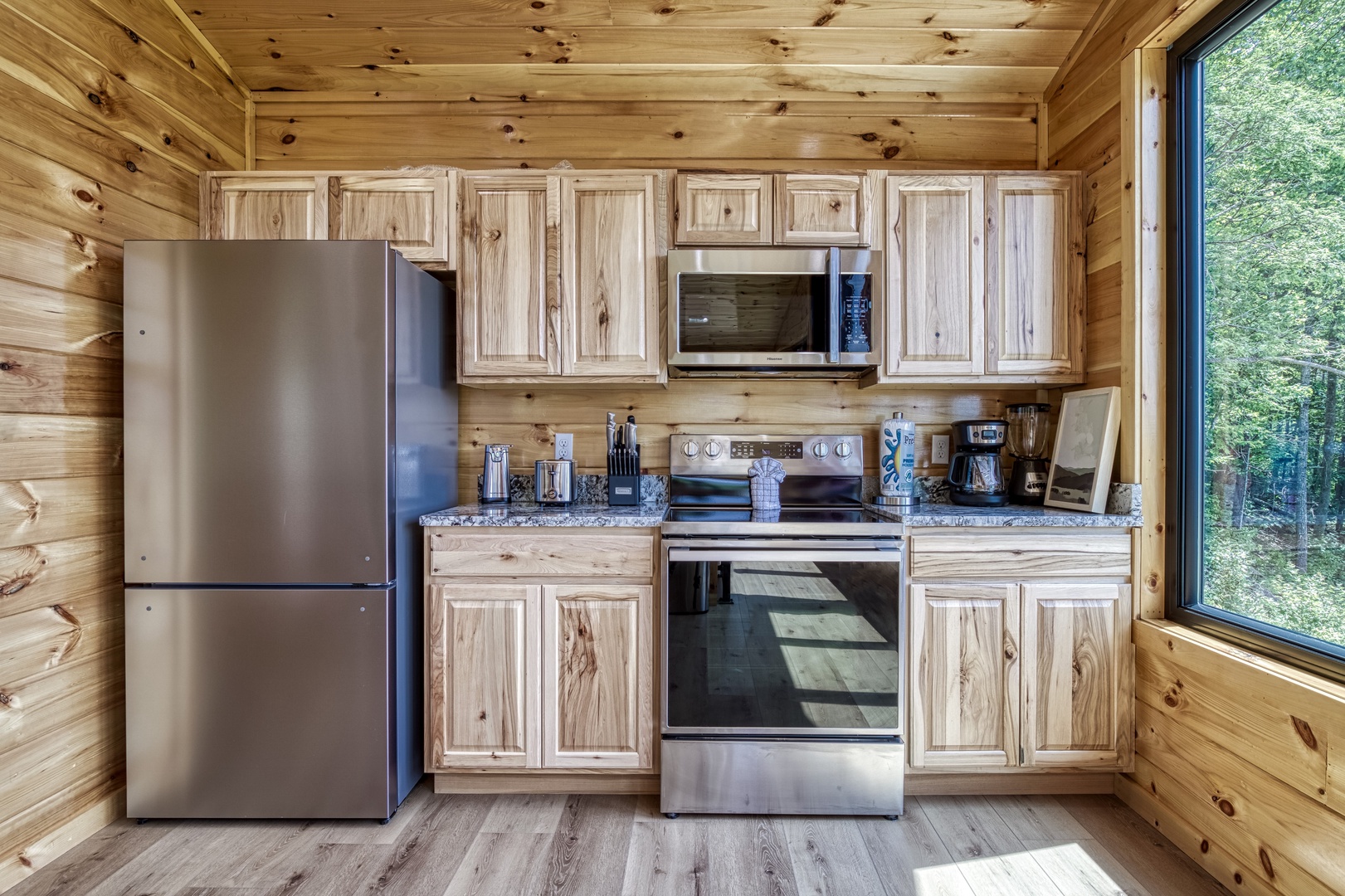 This cabin is a beautiful property! The views from the living room are amazing! Everything in the cabin was in working order and we had no issues with the heat, showers, or kitchen appliances. We were pleasantly surprised that the kitchen was fully stocked with silverware, plates, bowls, pots, and pans. We cooked a few meals during our stay and we had everything we needed to prepare dinner and breakfast.