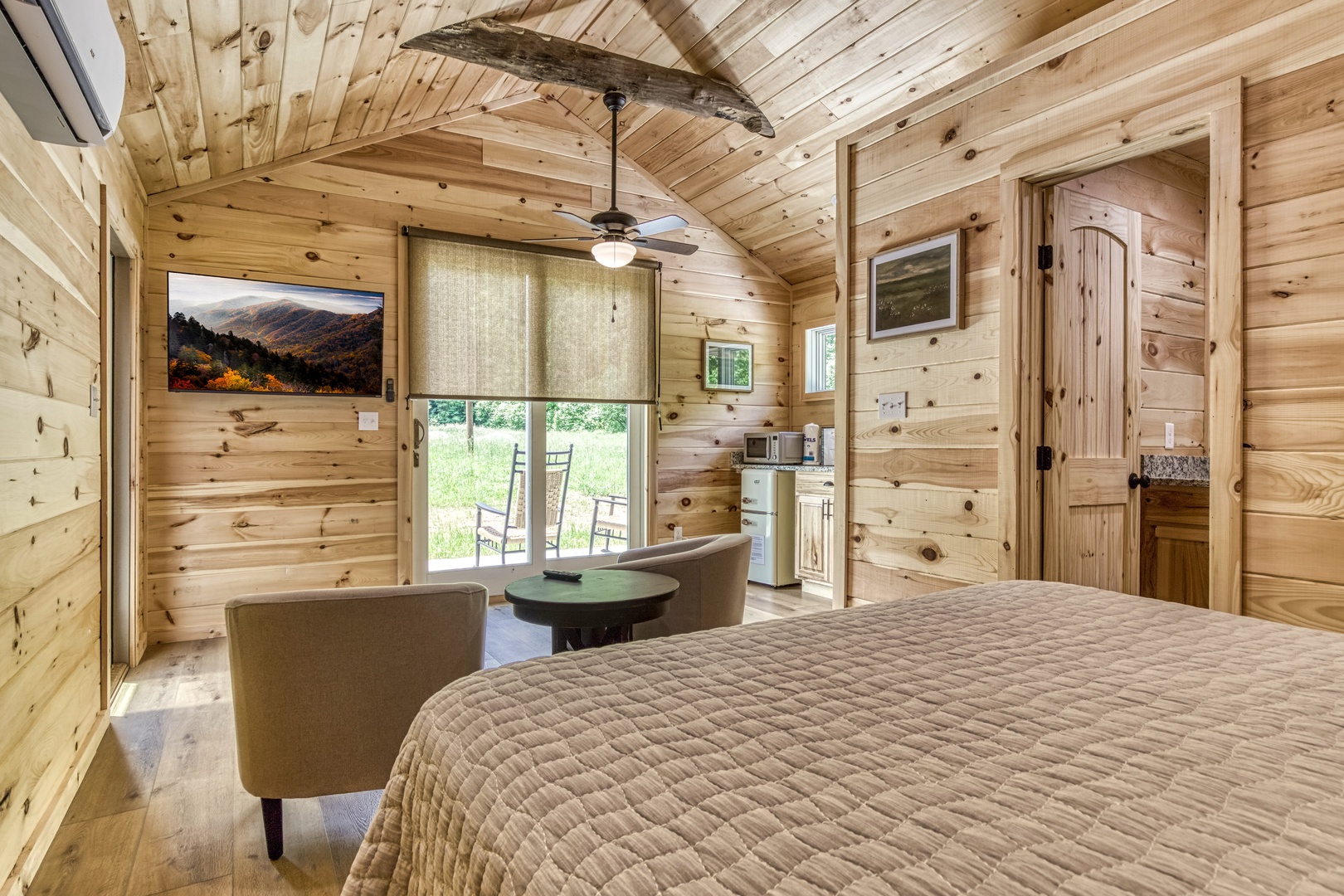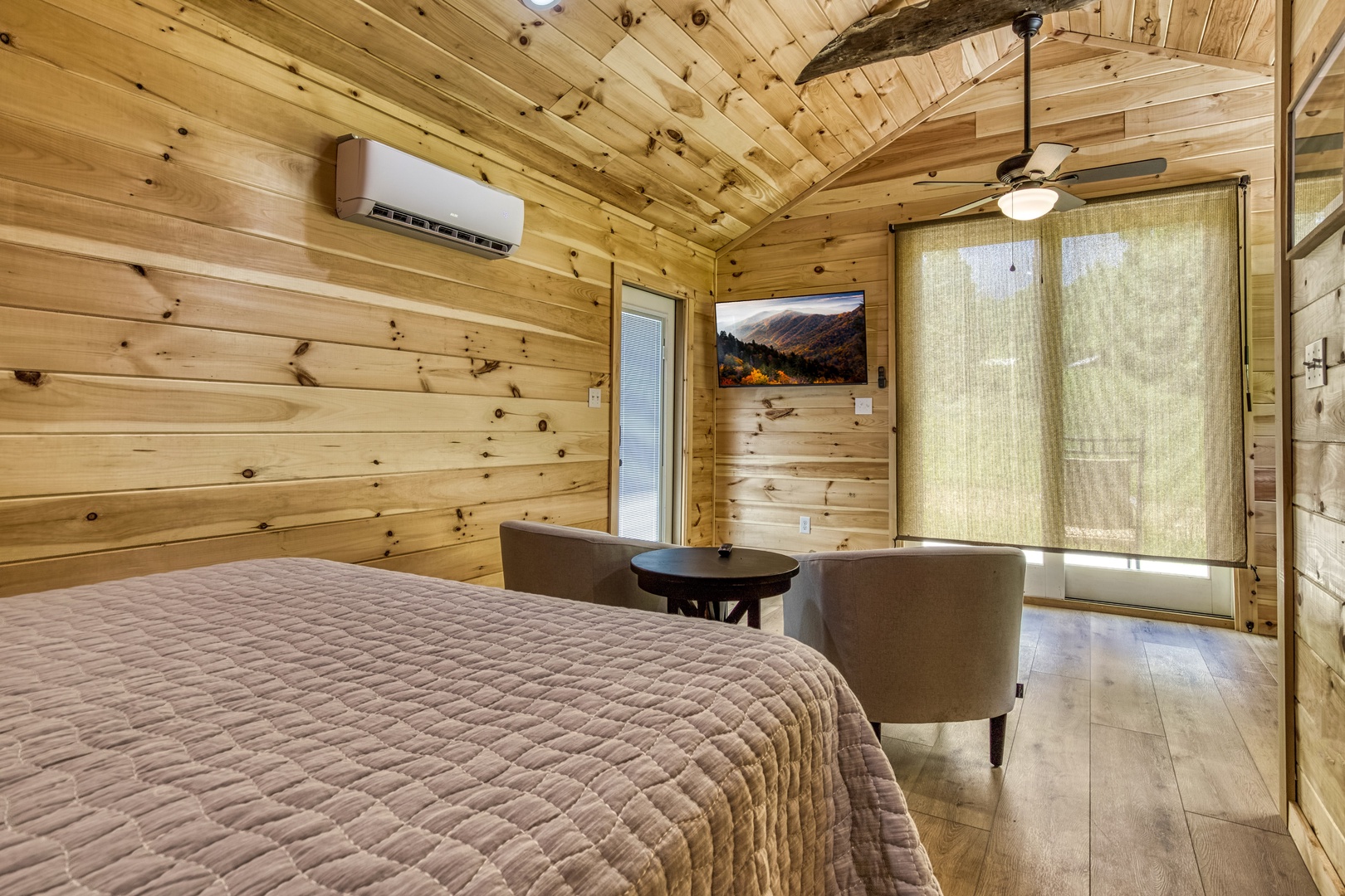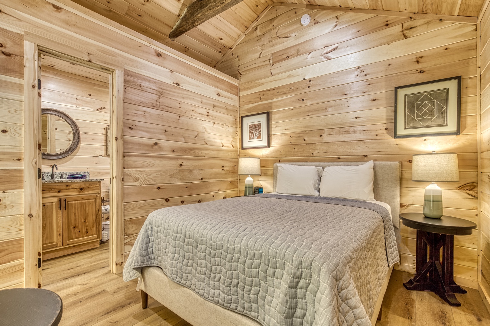 Step inside, and you'll be greeted by the awe-inspiring soaring cathedral ceilings that create a sense of spaciousness and freedom. The open space houses a luxurious queen bed, inviting you to sink into its plush embrace and experience a restful night's sleep. The cleverly designed layout includes a cozy sitting area, perfect for unwinding with a good book or simply basking in the serene atmosphere.