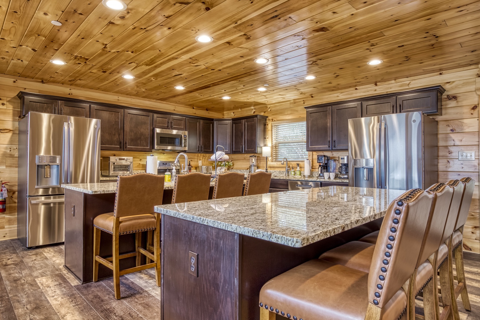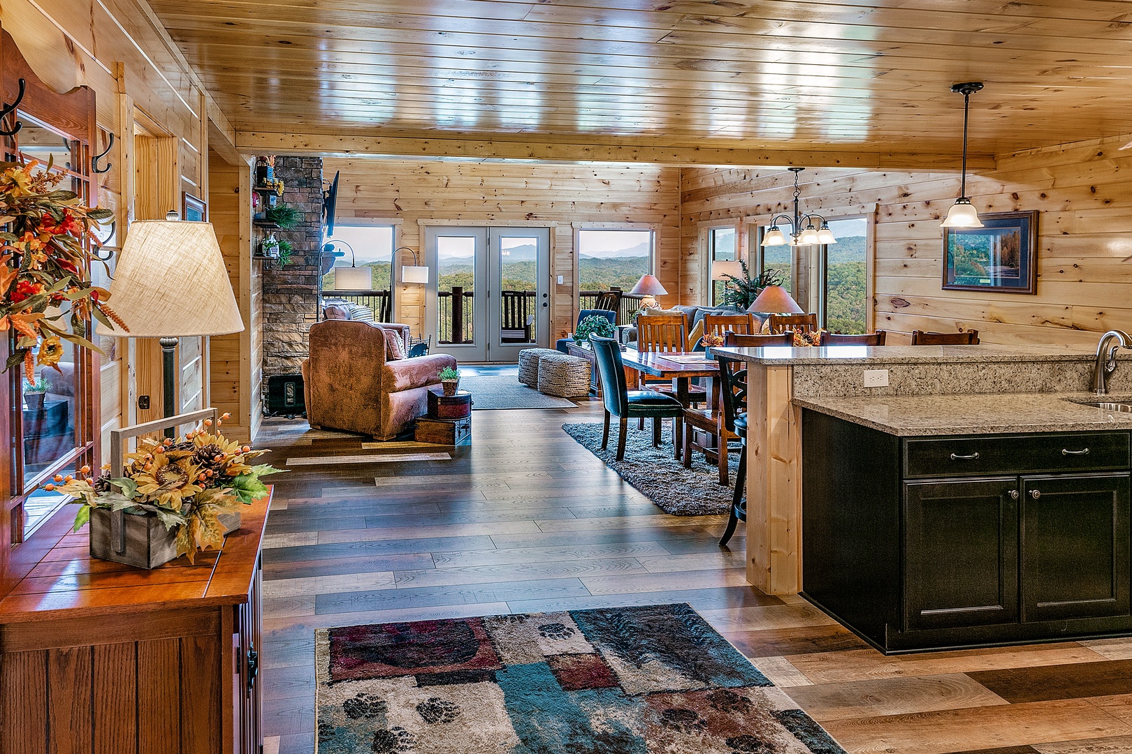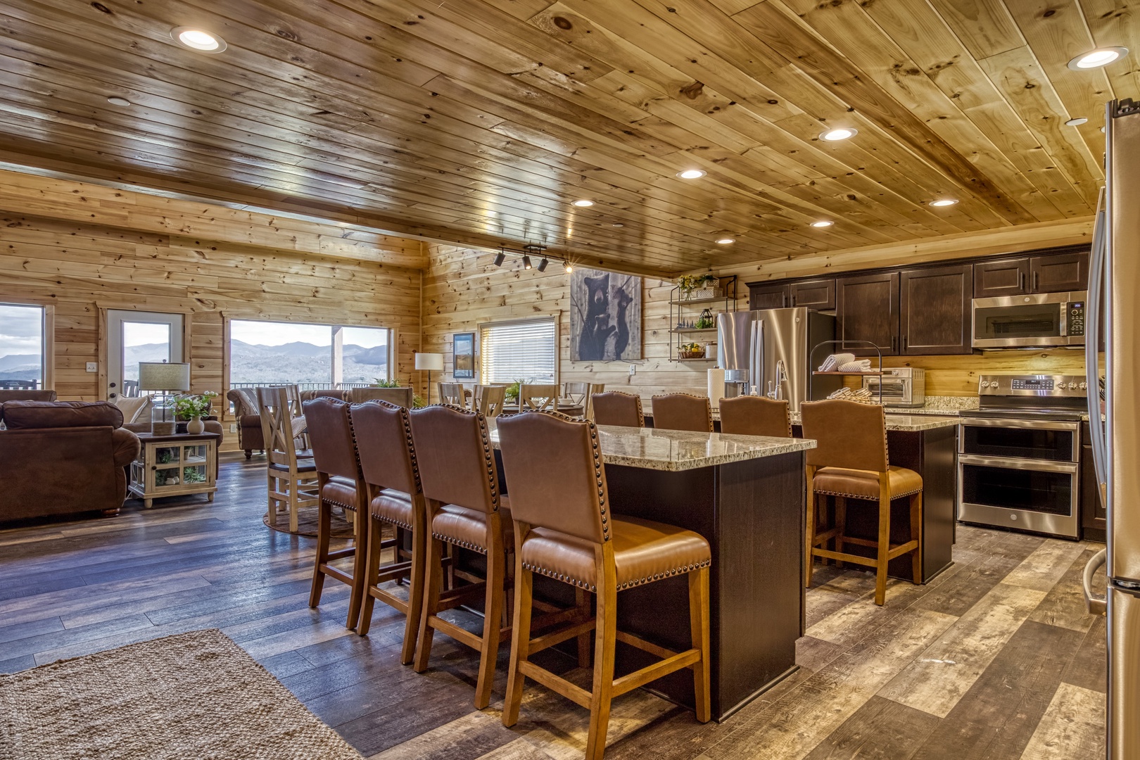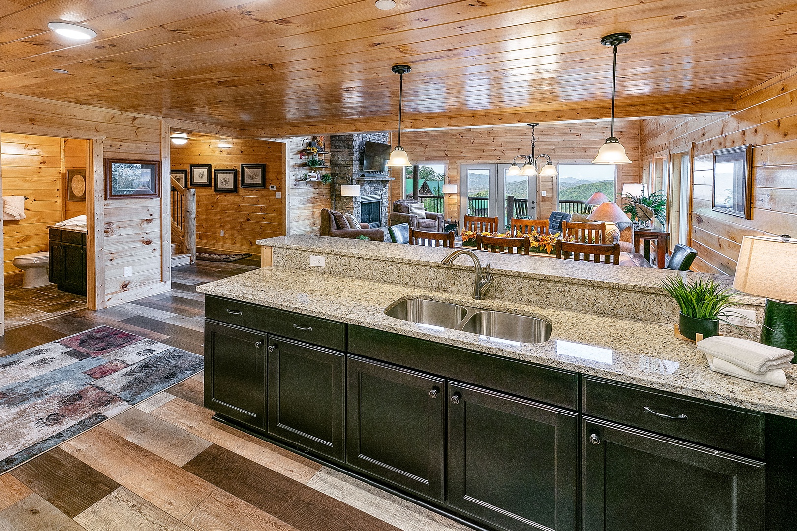 The great room has a flat screen TV with a Sonos speaker, sleeper sofa, 4 comfortable chairs, and a gas fireplace. The open floor plan promotes socializing while preparing your favorite meal and enjoying the magnificent views.