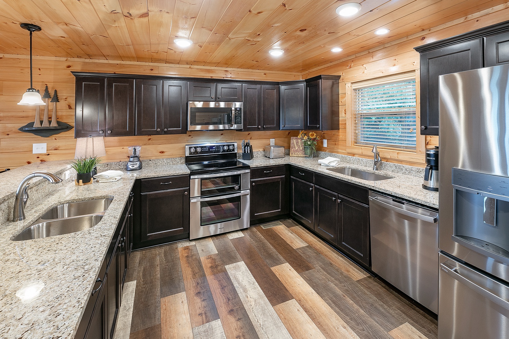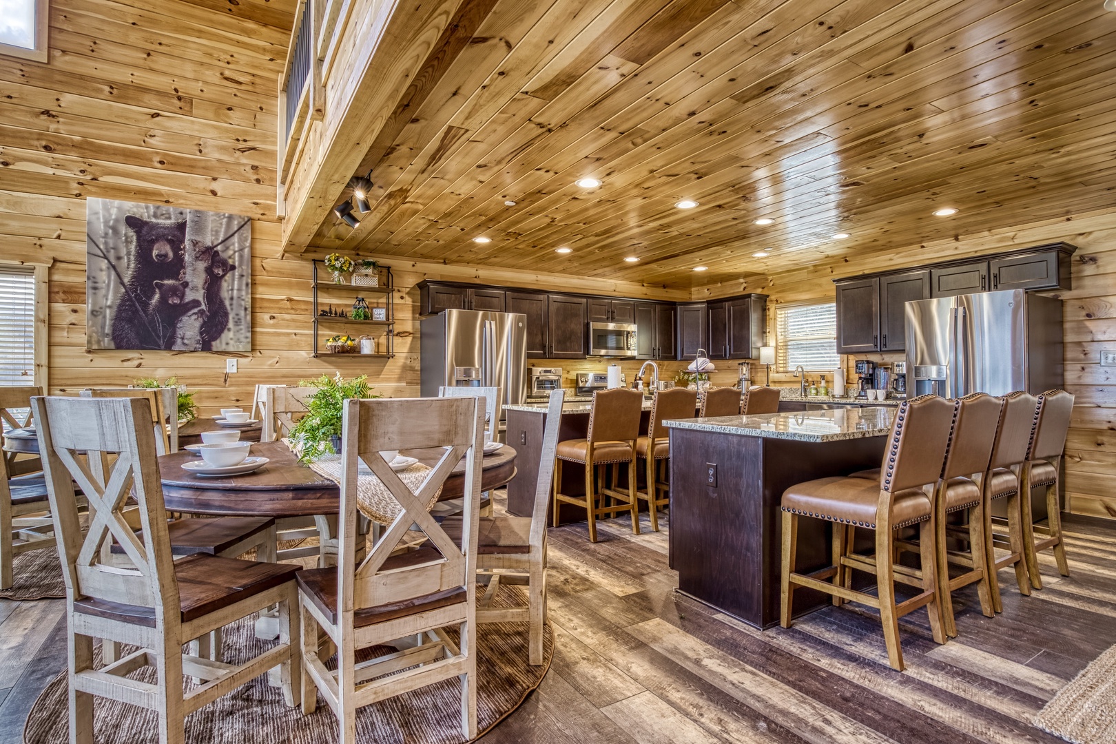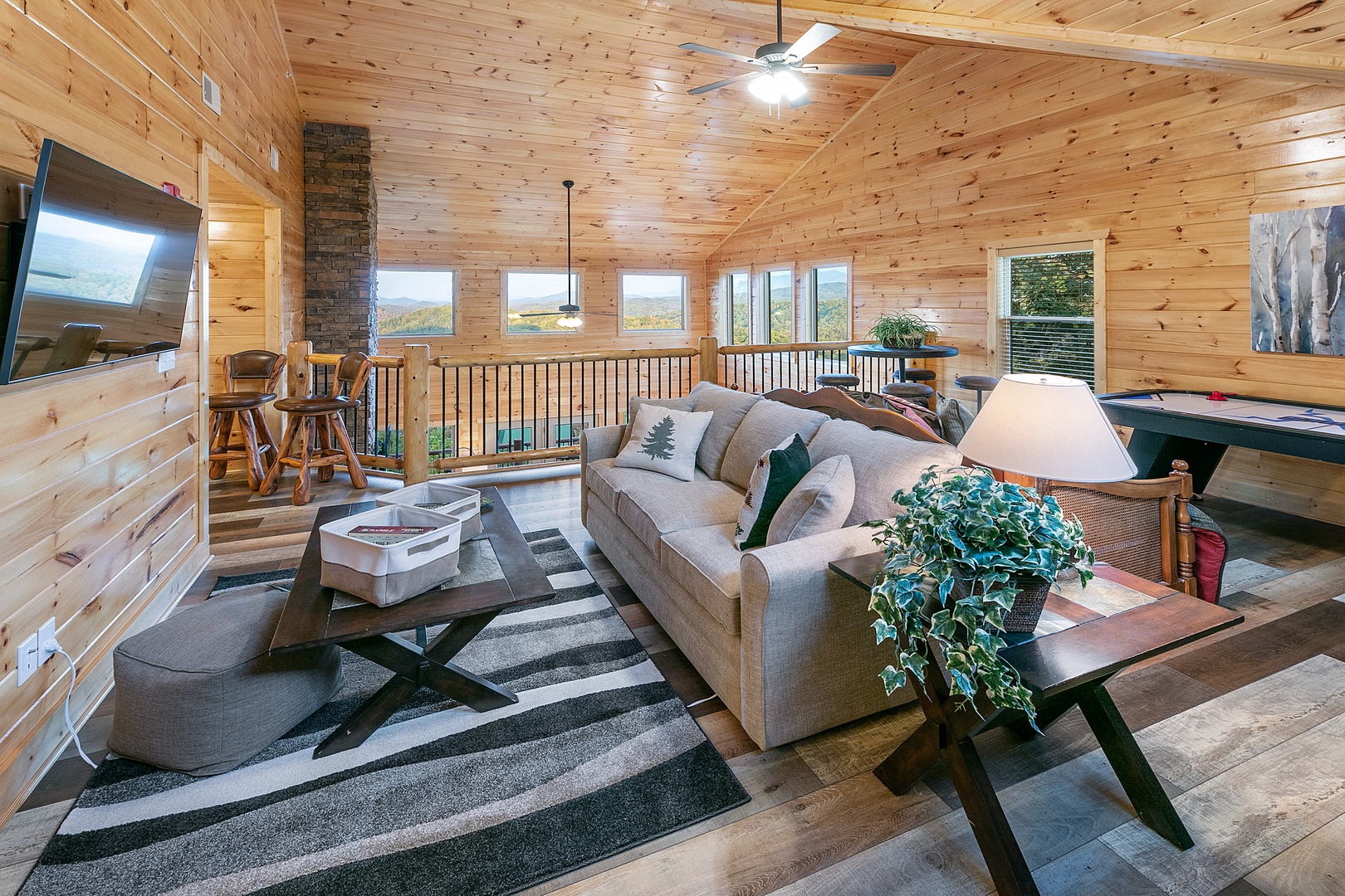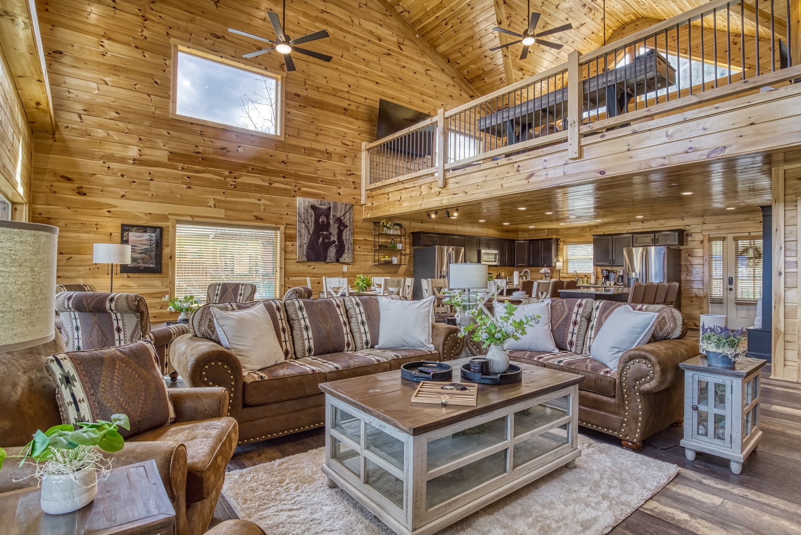 The great room has a flat screen TV with a Sonos speaker, sleeper sofa, 4 comfortable chairs, and a gas fireplace. The open floor plan promotes socializing while preparing your favorite meal and enjoying the magnificent views.