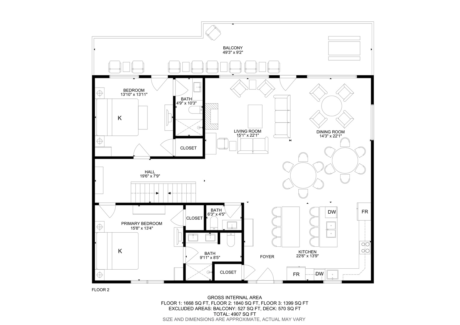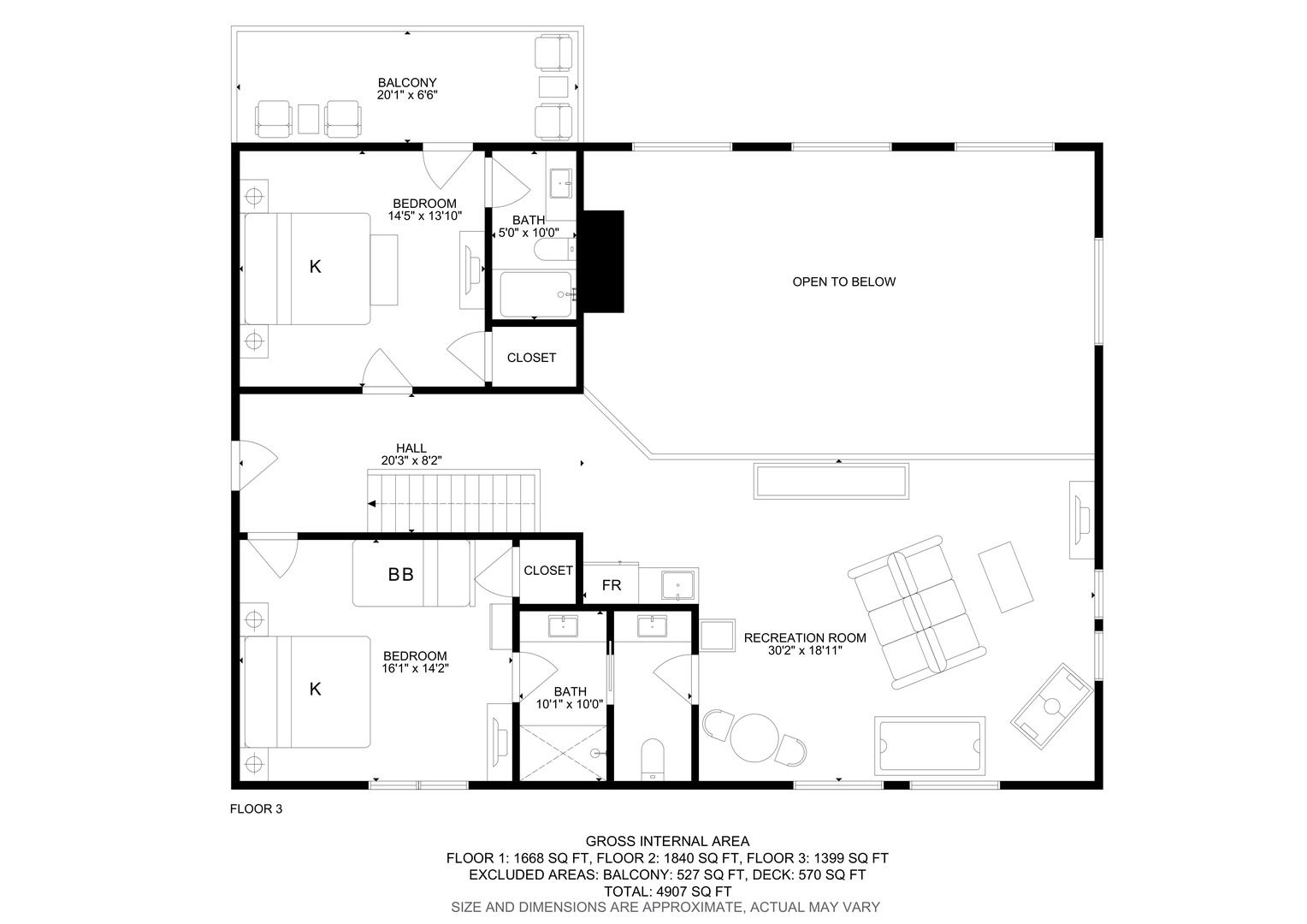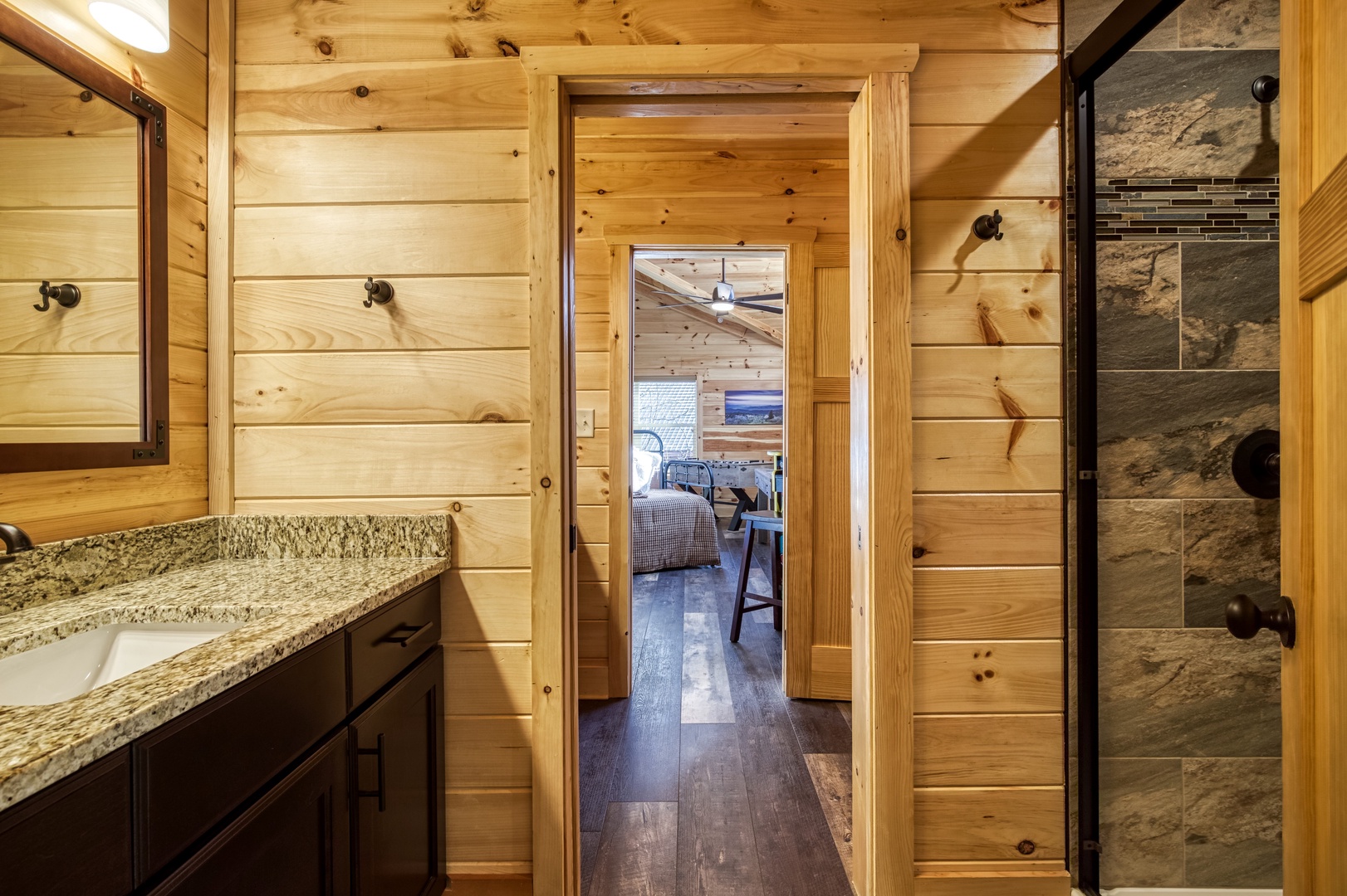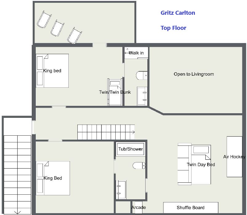 The upper-level features one bedroom with a king bed, bunk twin beds with a trundle bed, private bathroom with shower, and a private deck. Another bedroom has a king bed and a Jack & Jill bathroom with a tub/shower combination that is also accessed from the game room.
