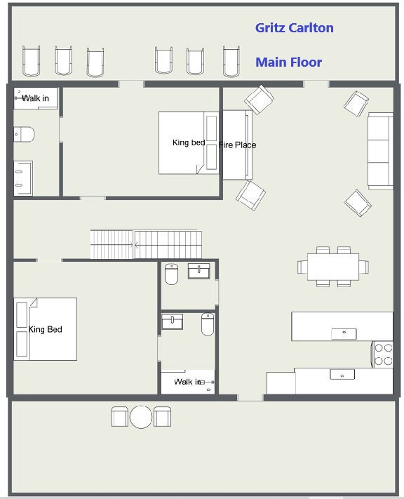 On each unit, the main level has a very nice, open floor plan with 2 bedrooms, each with a king bed and private bathroom with shower. The gourmet kitchen, dining room, and great room area is great for entertaining, with a convenient half bath just off the kitchen. The kitchen is fully equipped including two sinks, double oven, microwave, a bar with seating for 6, and a table to accommodate 8.