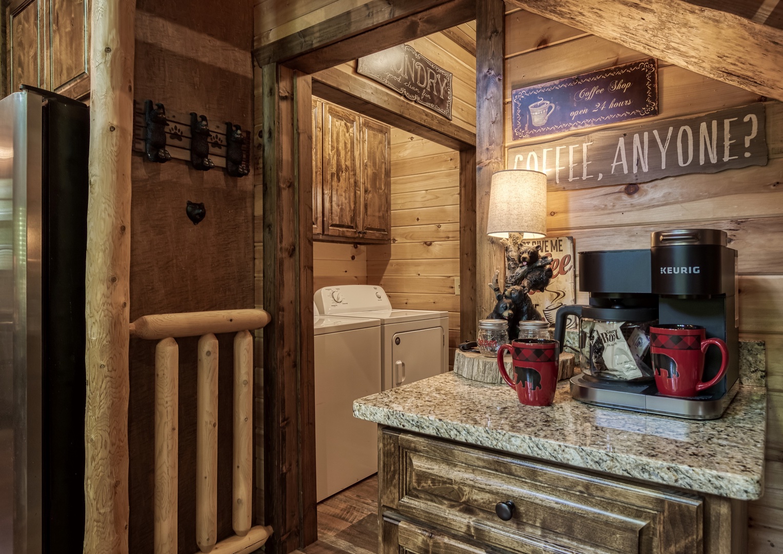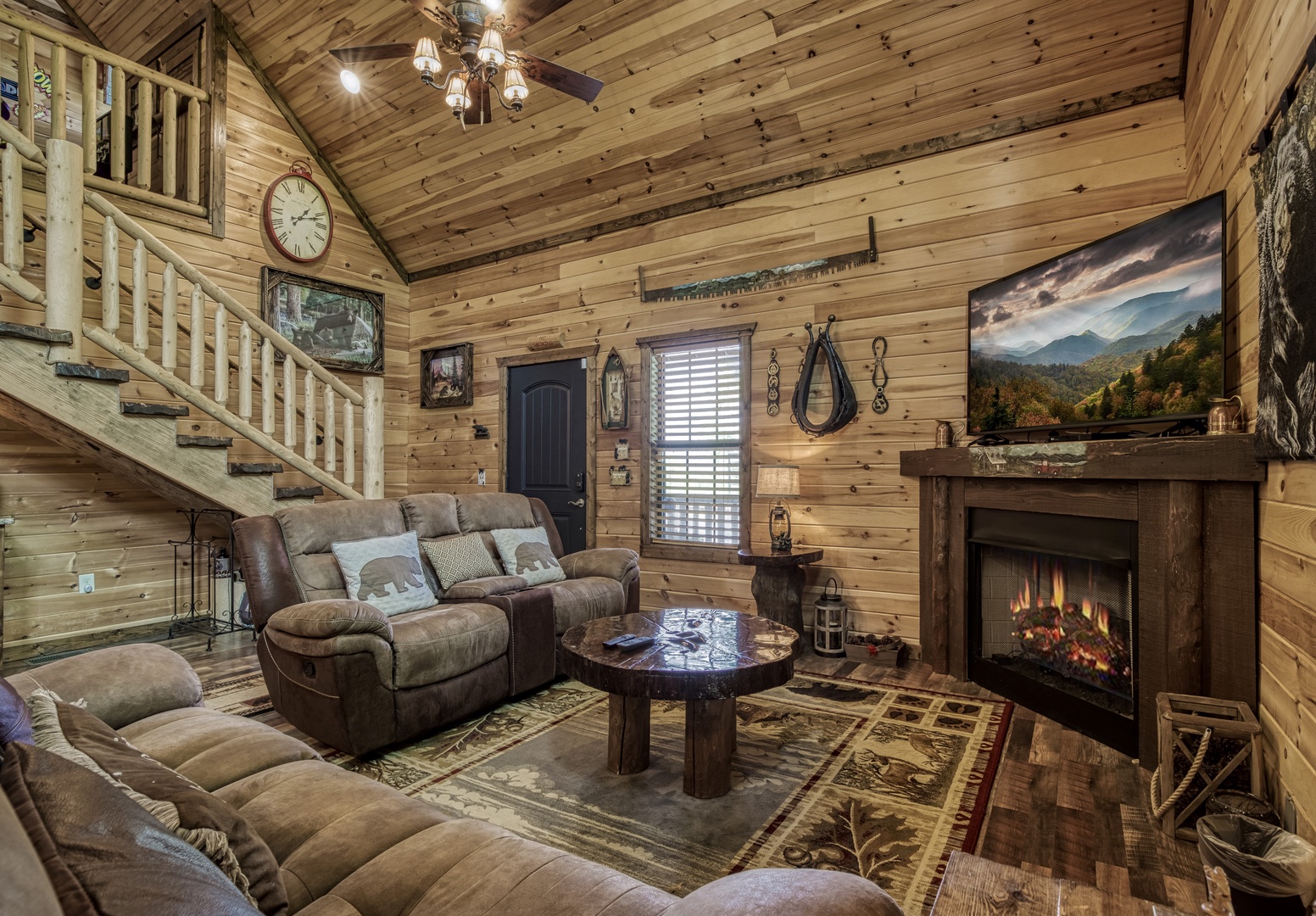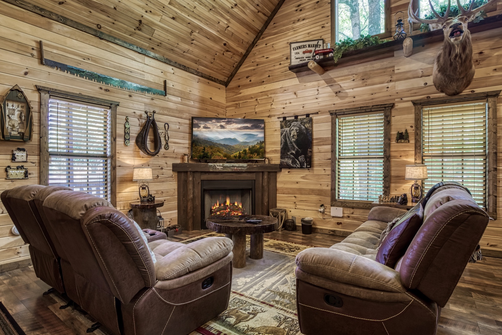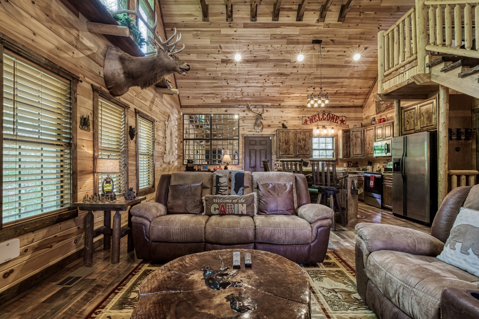 Step through the front door of this all wood custom cabin to experience the true WOW factor of the open main floor living space. Cuddle up on one of the 2 reclining sofas while watching your favorite TV show or enjoy the Gas fireplace for the extra warmth and ambience.