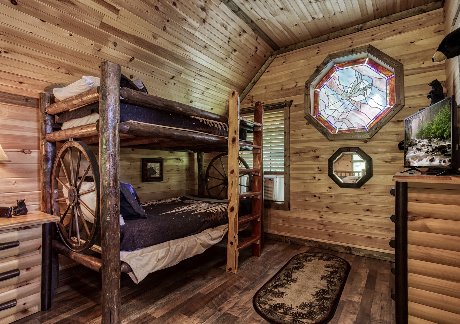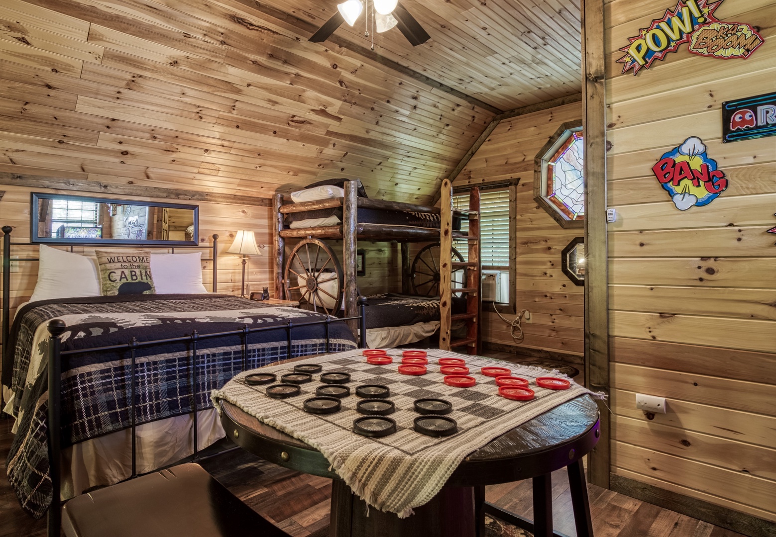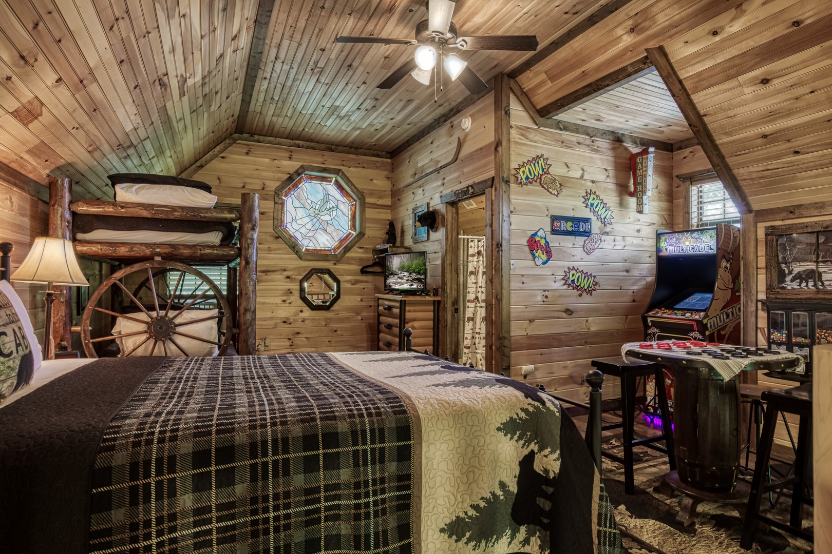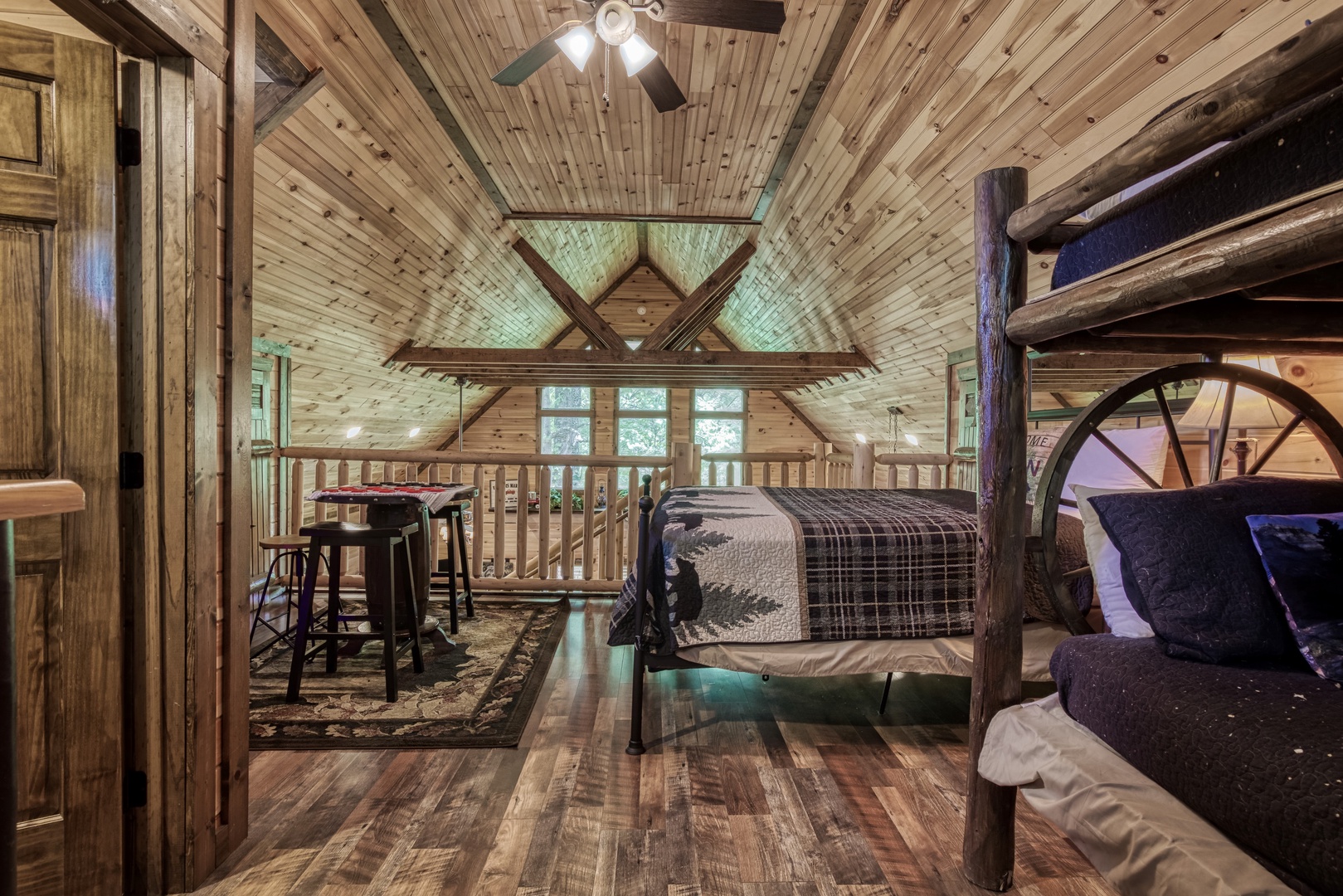Head up stairs to the open loft bedroom featuring a Queen and a Twin over Twin bunk bed. This loft bedroom makes the perfect getaway for the kids of the family with a multi-arcade game, a high top table to play board games or checkers and a flat screen tv. The kids will love to have their own custom bathroom with a walk in shower and a super unique barrel sink.