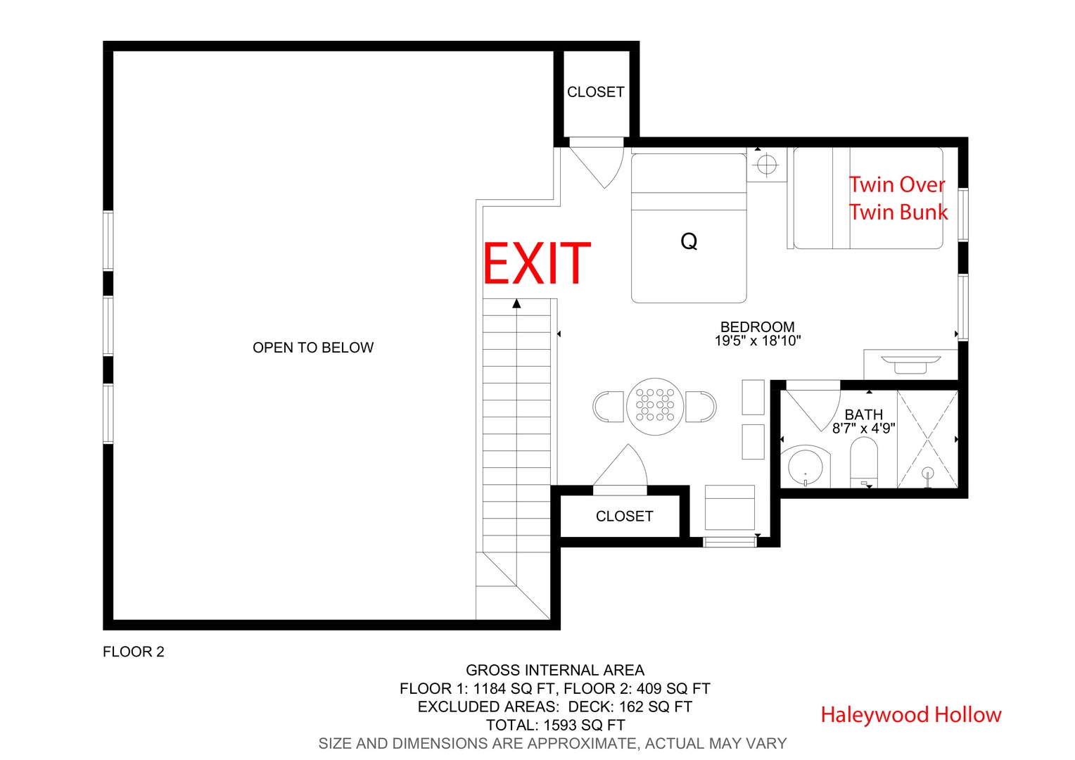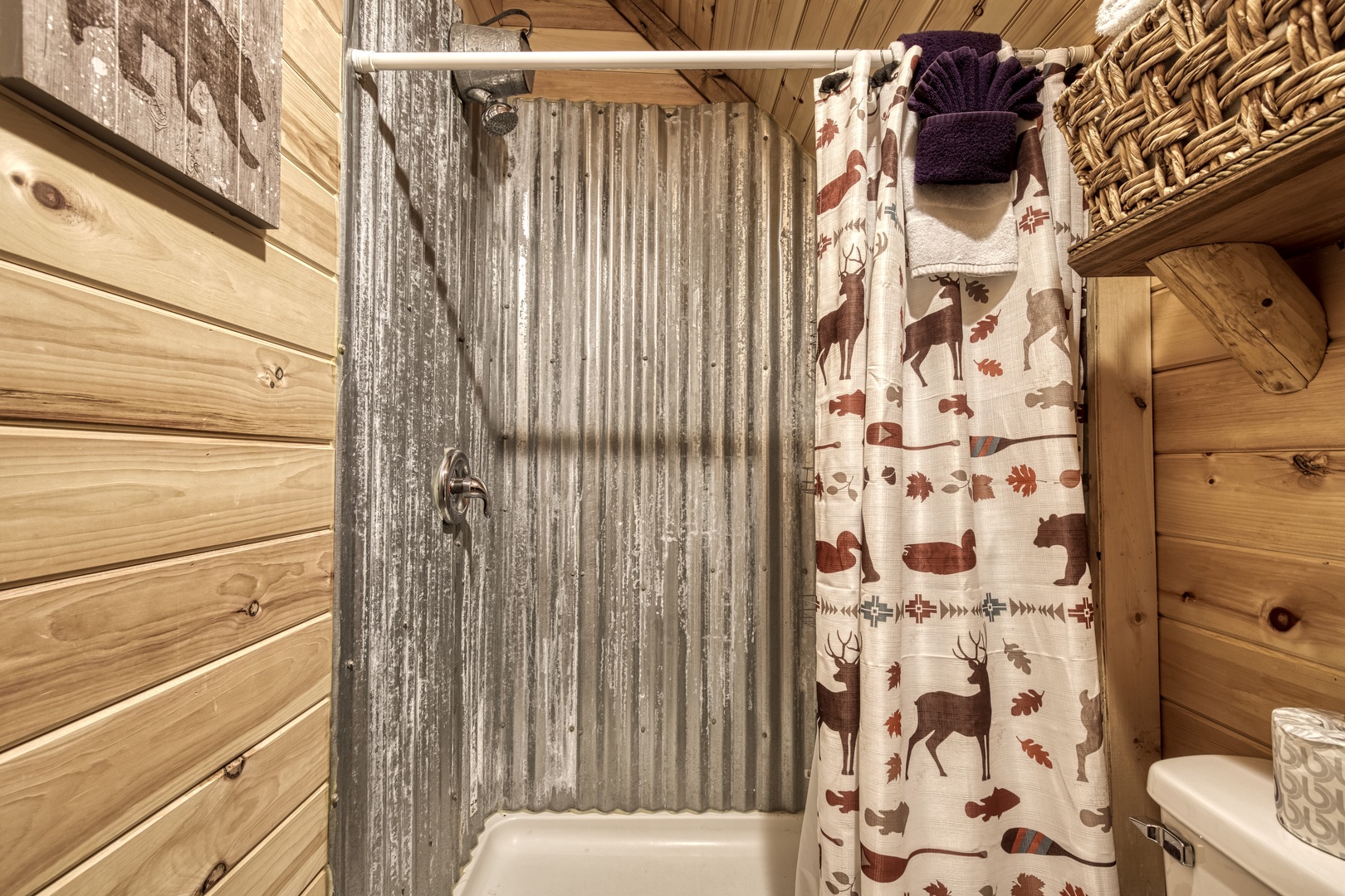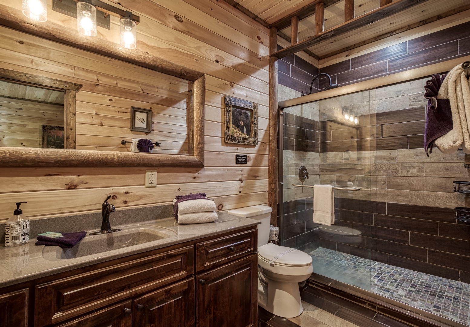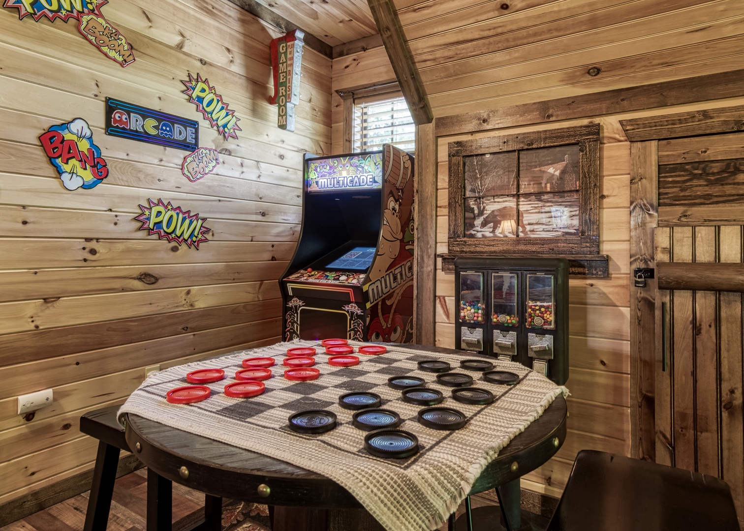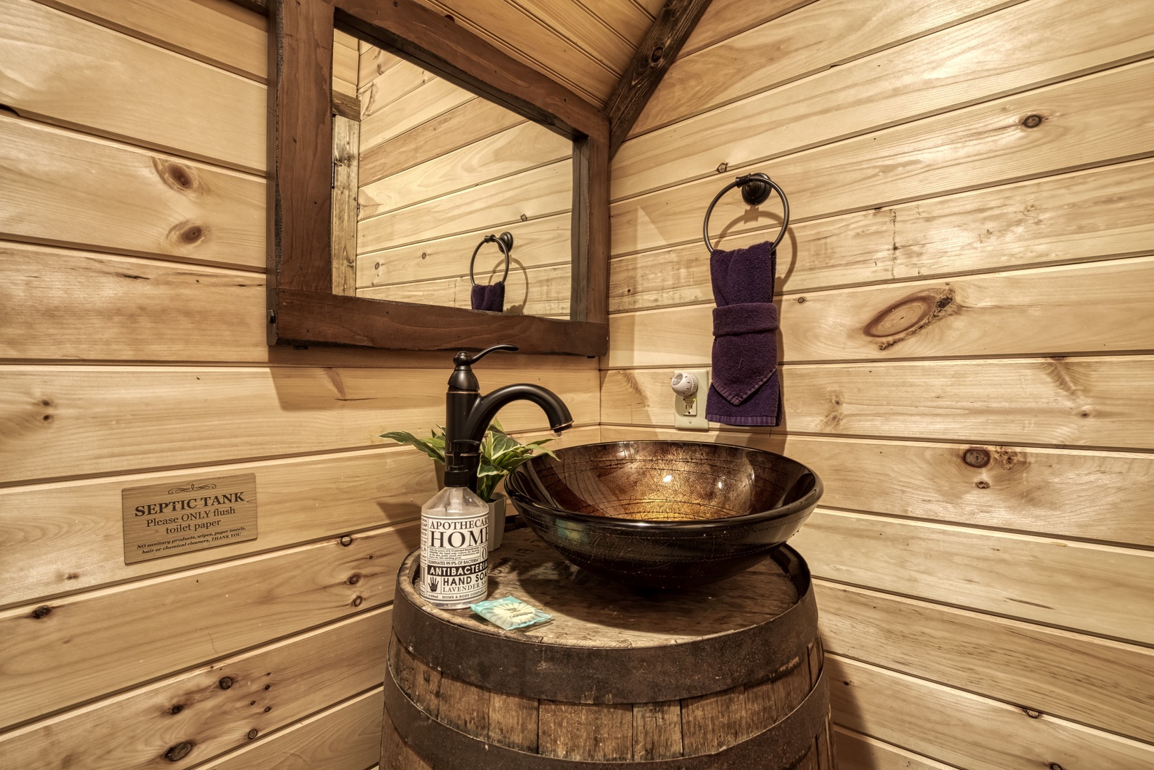 Head up stairs to the open loft bedroom featuring a Queen and a Twin over Twin bunk bed. This loft bedroom makes the perfect getaway for the kids of the family with a multi-arcade game, a high top table to play board games or checkers and a flat screen tv. The kids will love to have their own custom bathroom with a walk in shower and a super unique barrel sink.