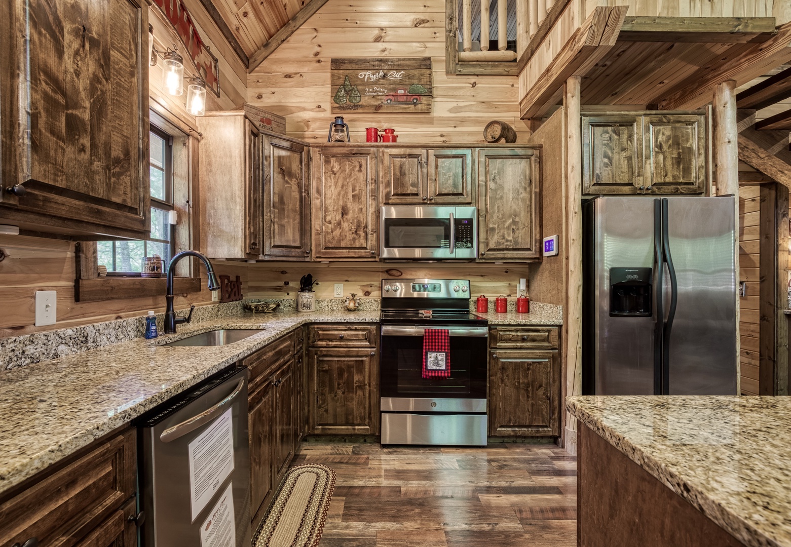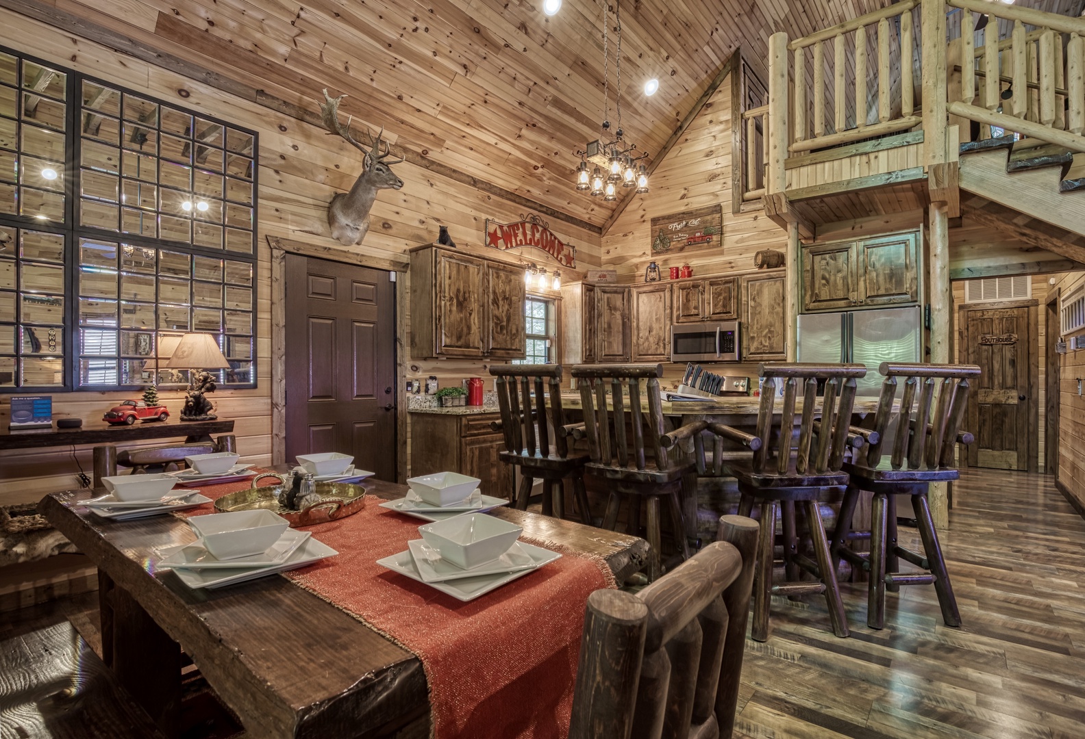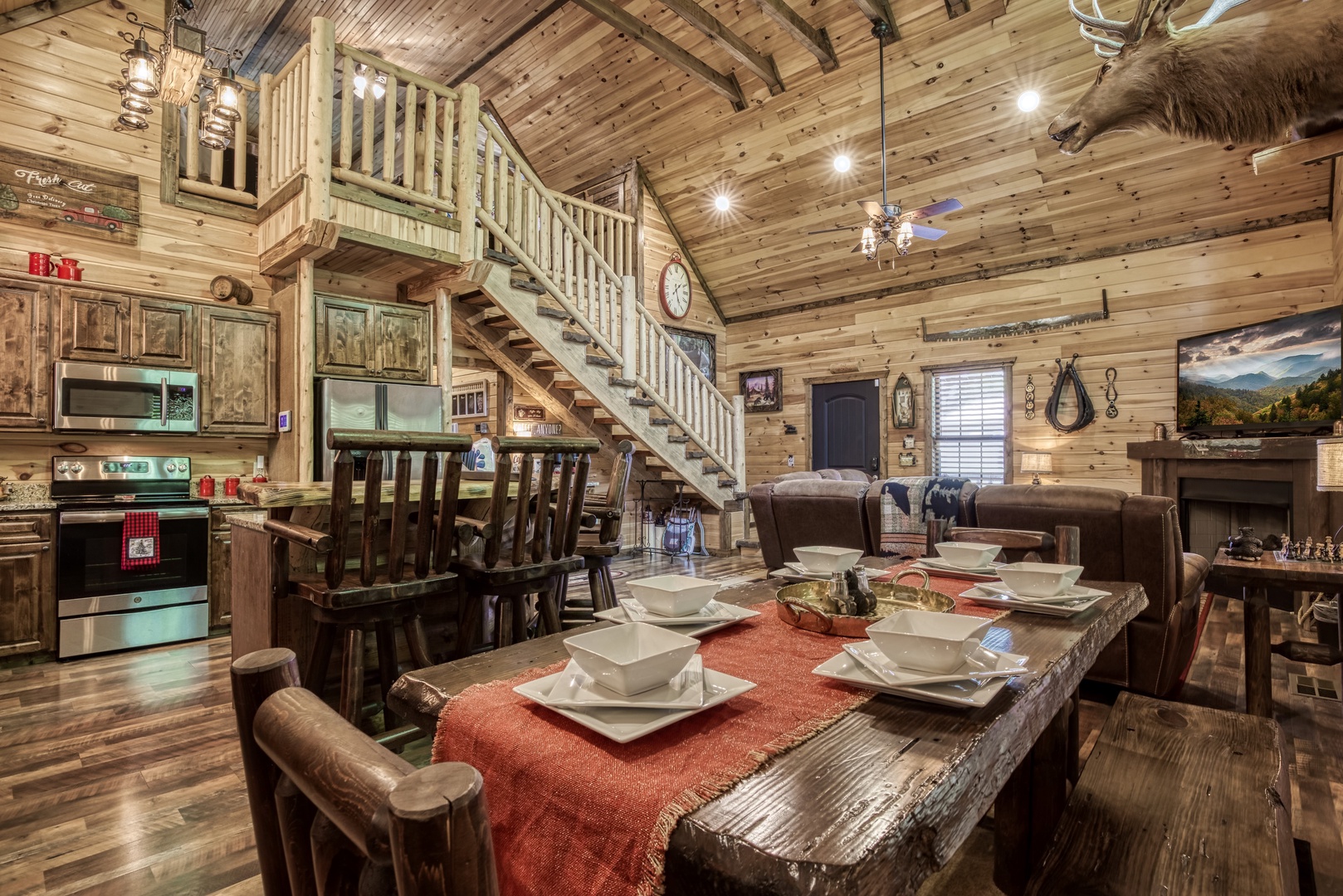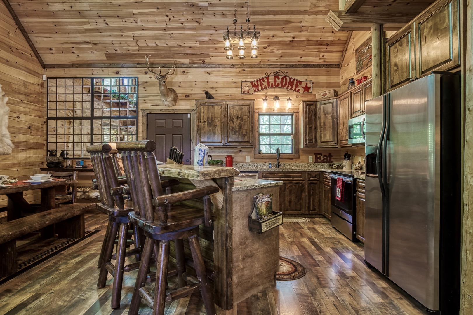 The stunning handcrafted dining table will seat the whole family with extra seating at the kitchen's center island for 4. Prepare any meal you wish in the spacious kitchen featuring stainless steel appliances and ample counter space. Just through the dining room backdoor you’ll be greeted with a spacious back porch with 2 swings to rock your mornings away. Gather the family around the outdoor firepit in the backyard and roast marshmallows while reflecting on the day's adventures.